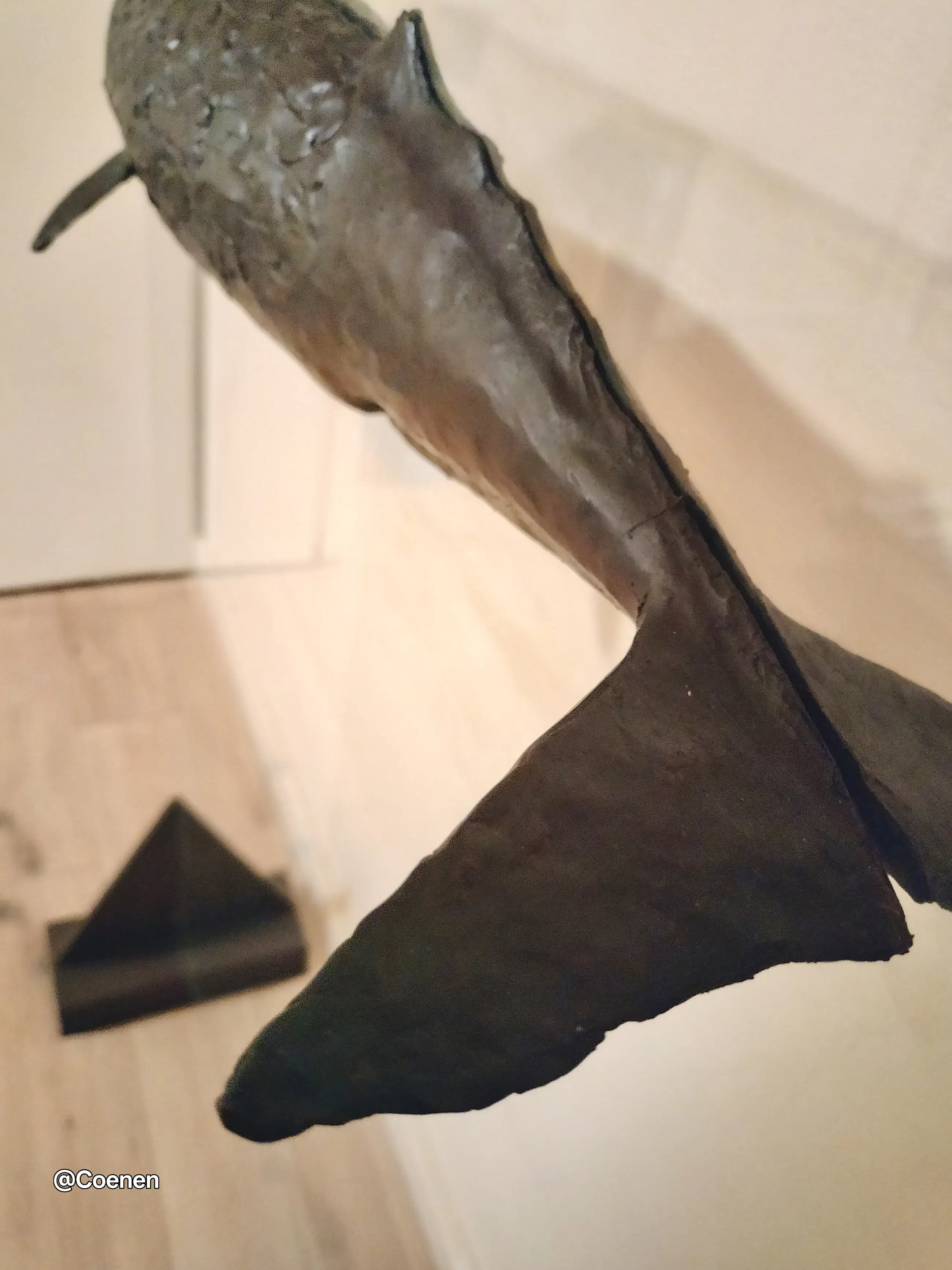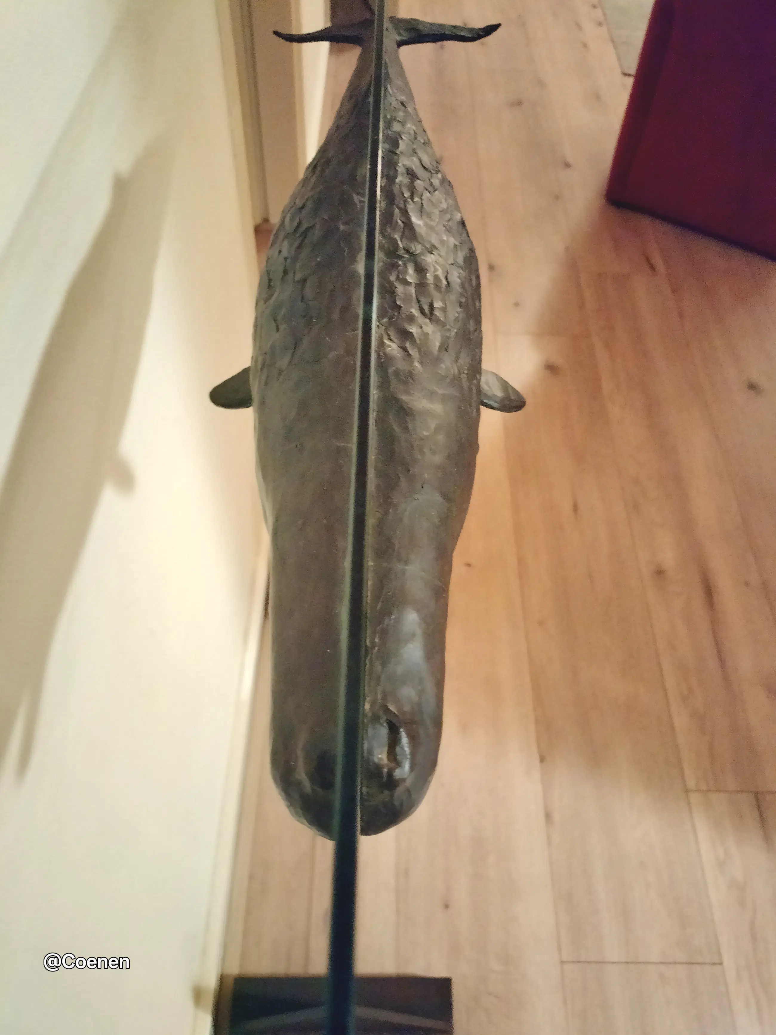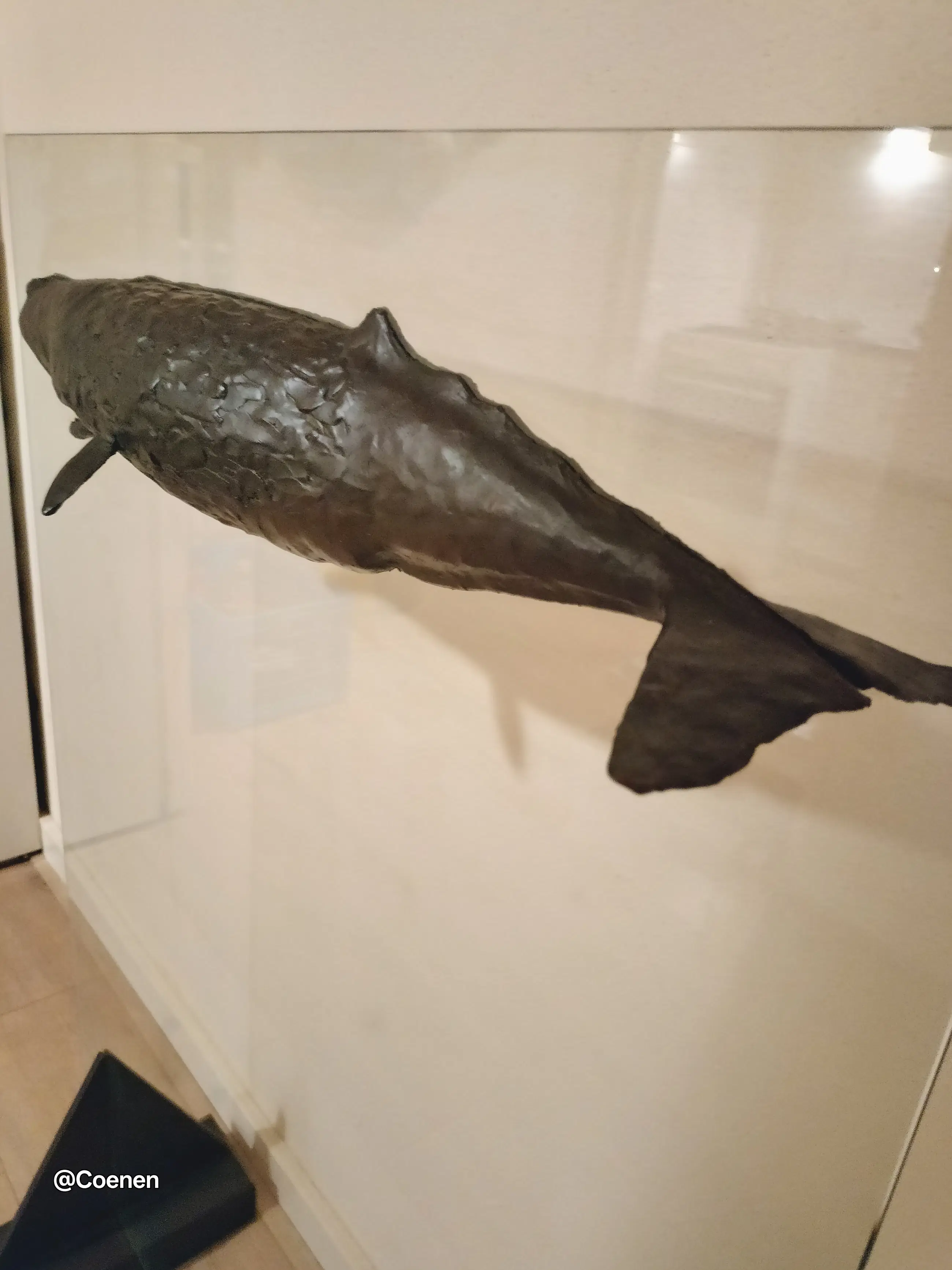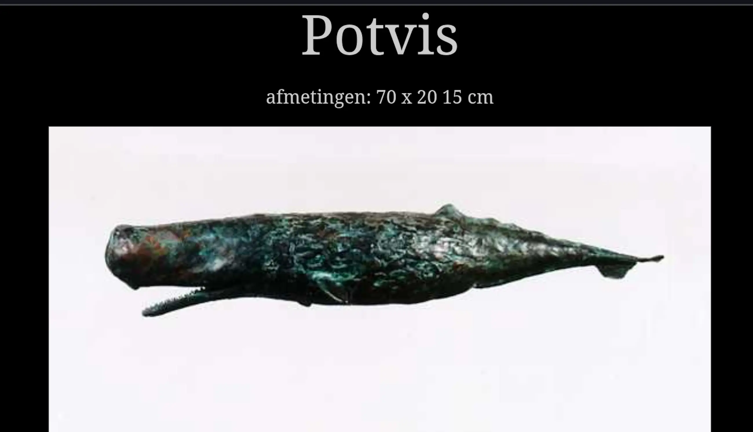 Dit prachtige kunstwerk van Groningse kunstenaar Harro Nikkel is werkelijk een plaatje. Een bronzen potvis vastgezet aan een grote glazen plaat. Om de illusie te wekken dat hij zwemt. Stevig geplaatst op 2 stalen voeten die opzettelijk roestig zijn. Na onlangs nog met Dhr Nikkels zijn vrouw gesproken te hebben weten we nu dat deze potvis de ENIGE is die er gemaakt is. Oorspronkelijk gepland voor een oplage van 3 is er besloten het daar bij te laten en de mal te vernietigen. Werkelijk een uniek stuk.