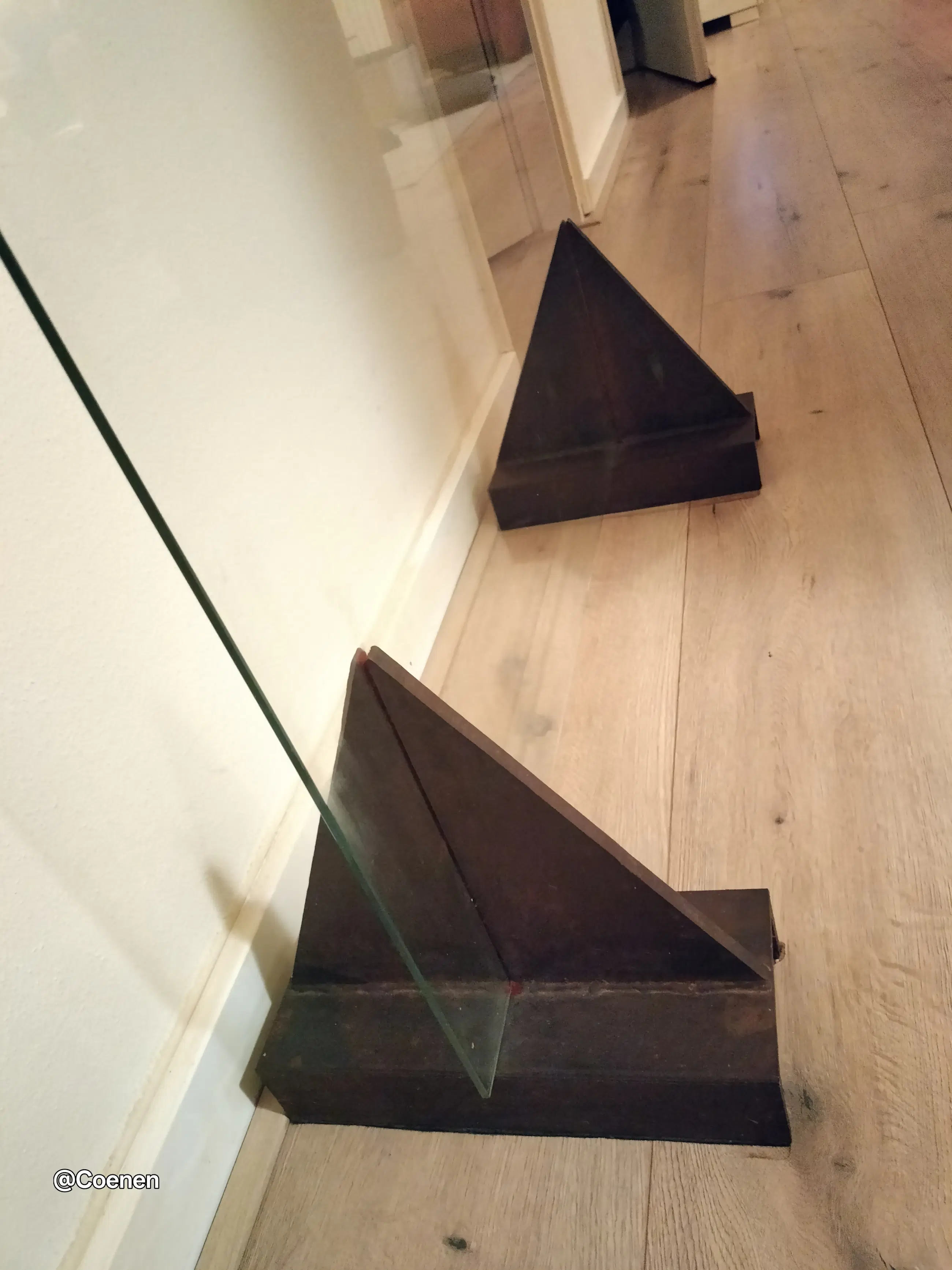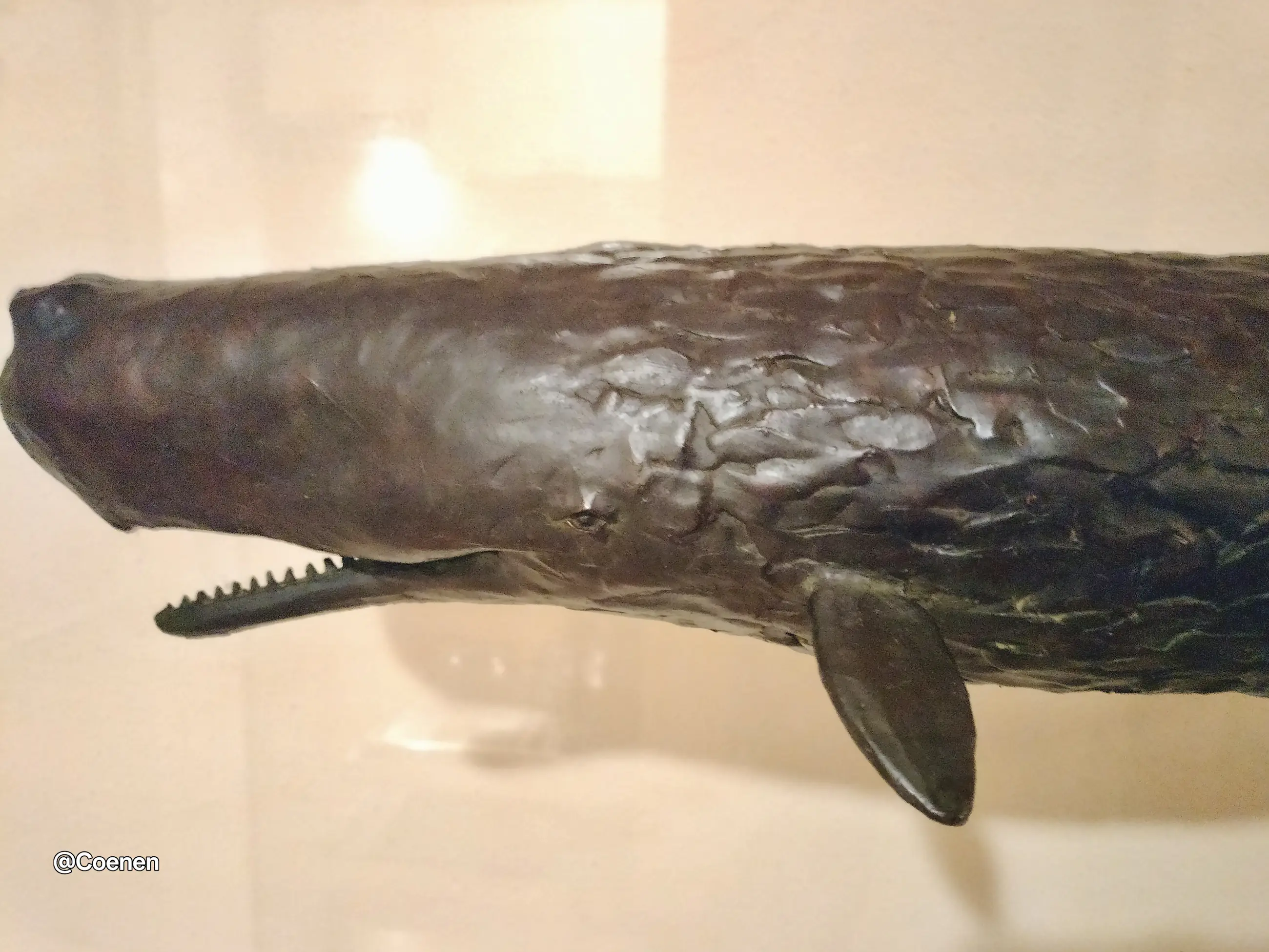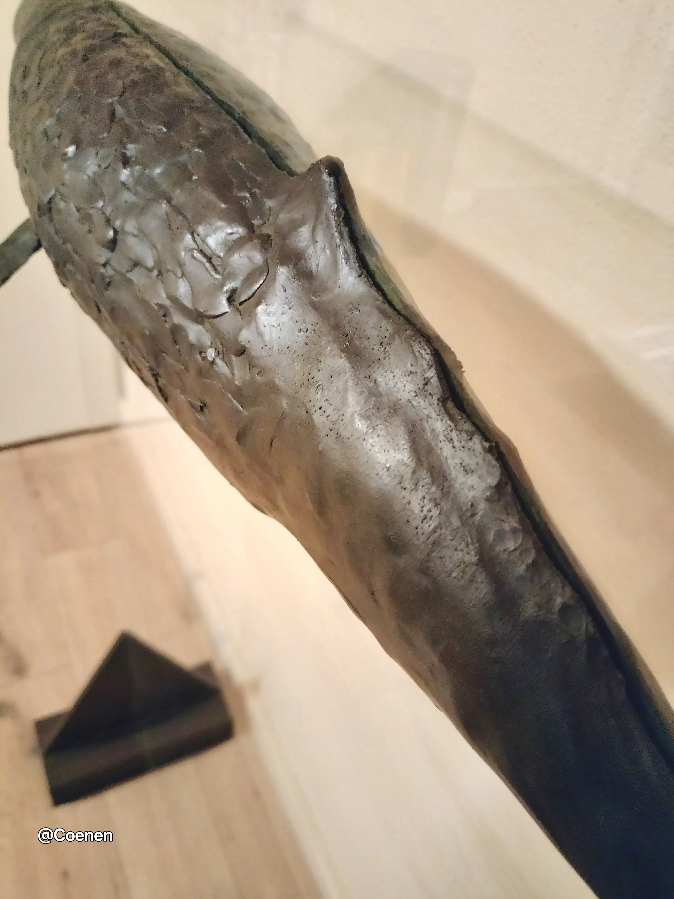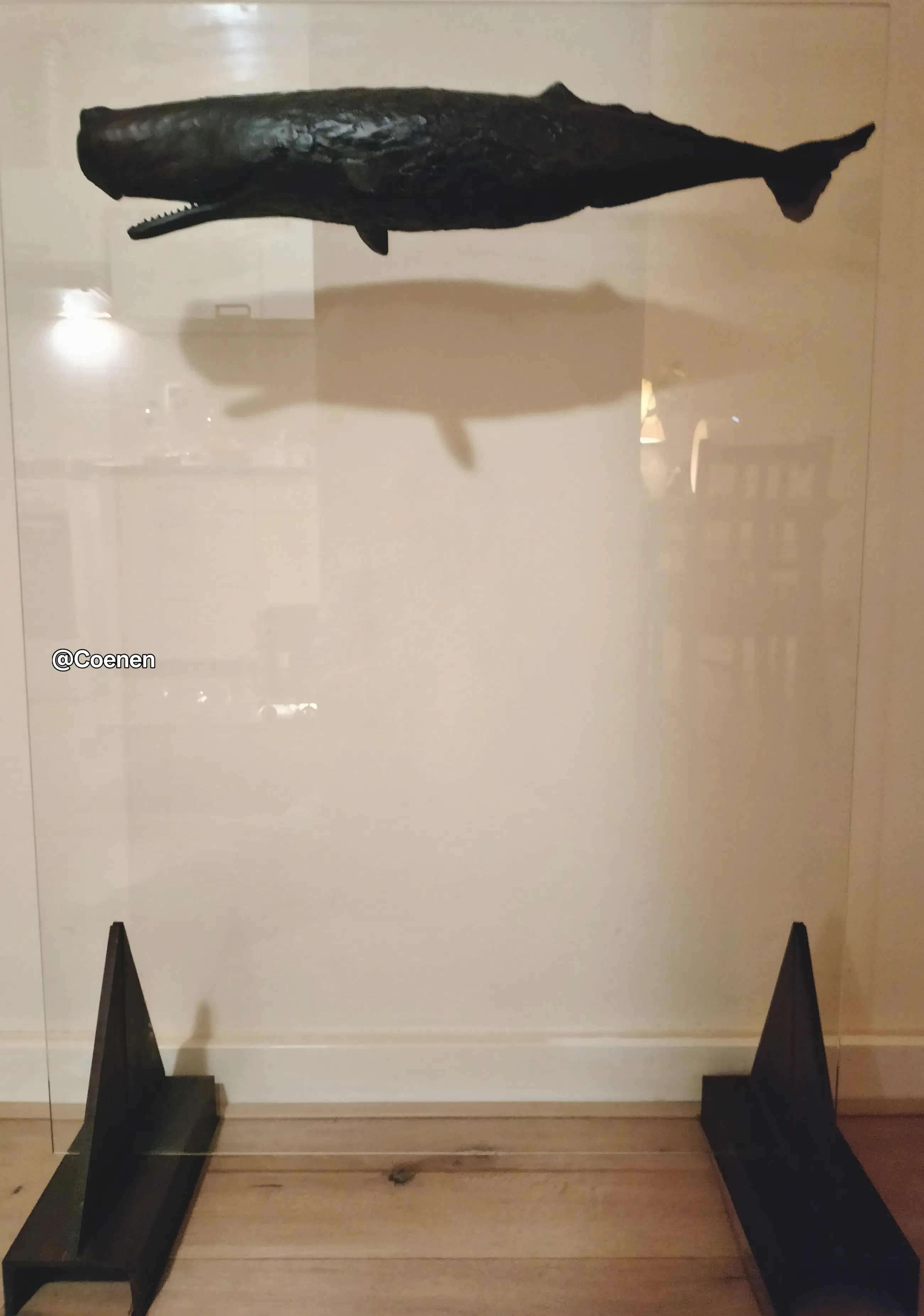 Dit prachtige kunstwerk van Groningse kunstenaar Harro Nikkel is werkelijk een plaatje. Een bronzen potvis vastgezet aan een grote glazen plaat. Om de illusie te wekken dat hij zwemt. Stevig geplaatst op 2 stalen voeten die opzettelijk roestig zijn. Na onlangs nog met Dhr Nikkels zijn vrouw gesproken te hebben weten we nu dat deze potvis de ENIGE is die er gemaakt is. Oorspronkelijk gepland voor een oplage van 3 is er besloten het daar bij te laten en de mal te vernietigen. Werkelijk een uniek stuk.