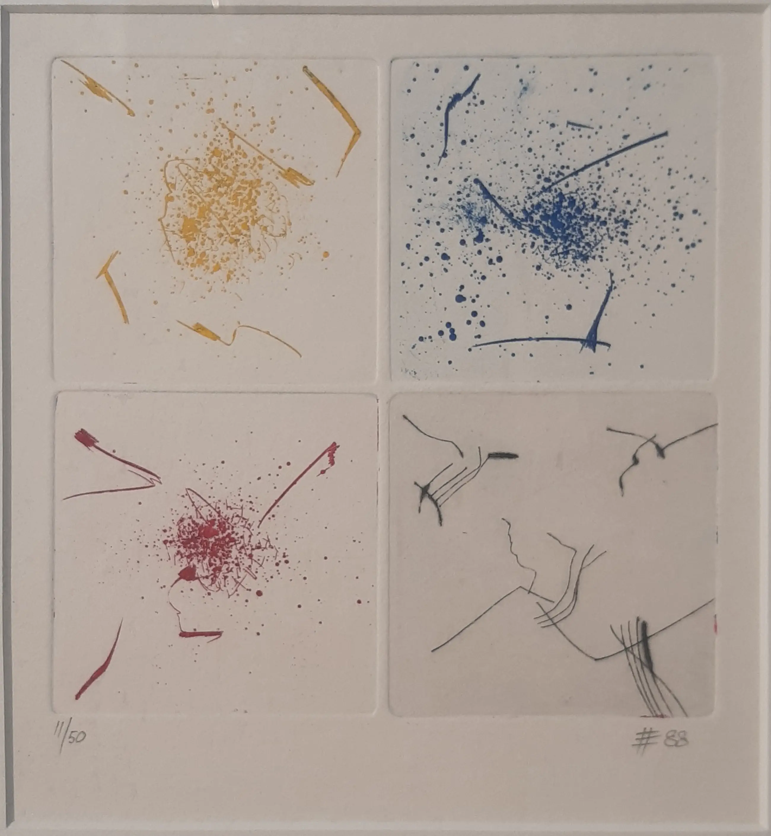 Mooi, leuk en fris abstract werk van Harry Agema. Gesigneerd op de achterzijde (zie laatste foto). Netjes ingelijst en in uitstekende staat.