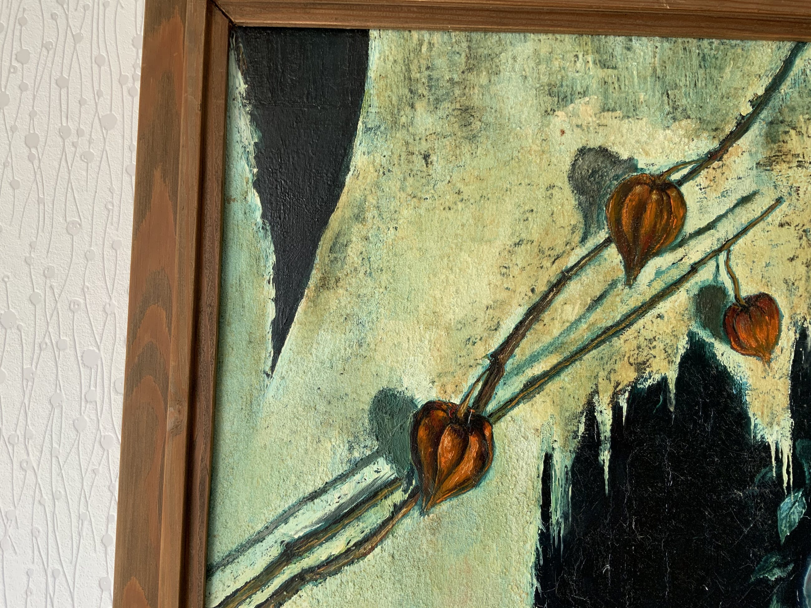 Lijst is van hout en het doek heeft een gemengde techniek met een ruwe kant.