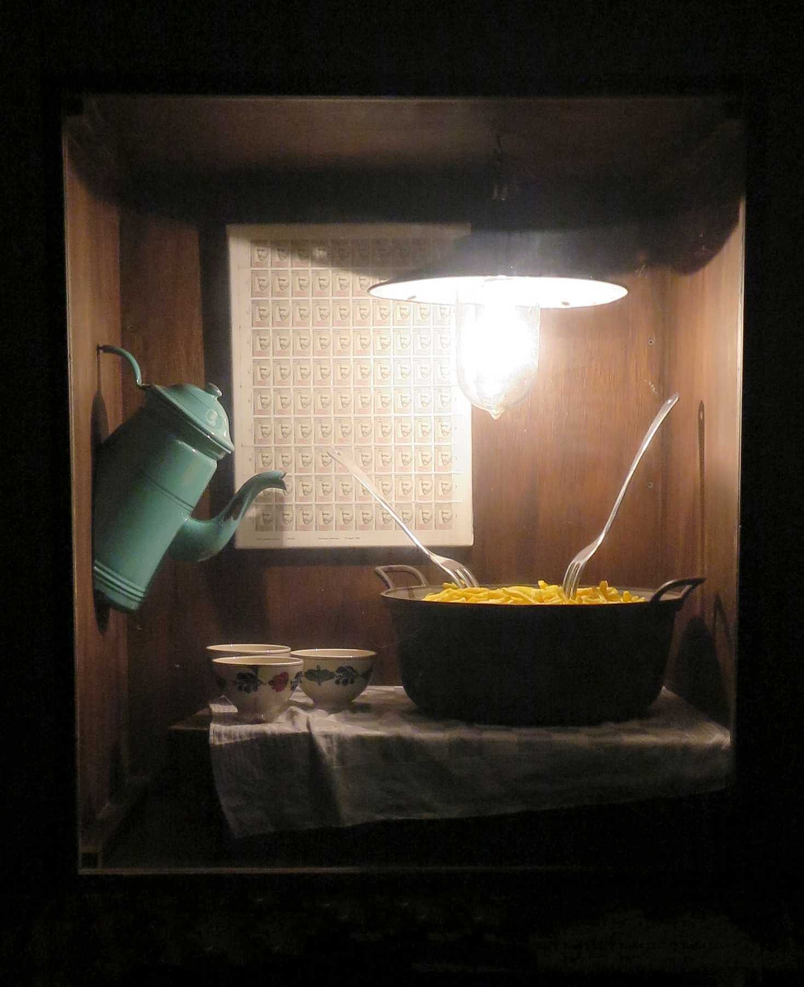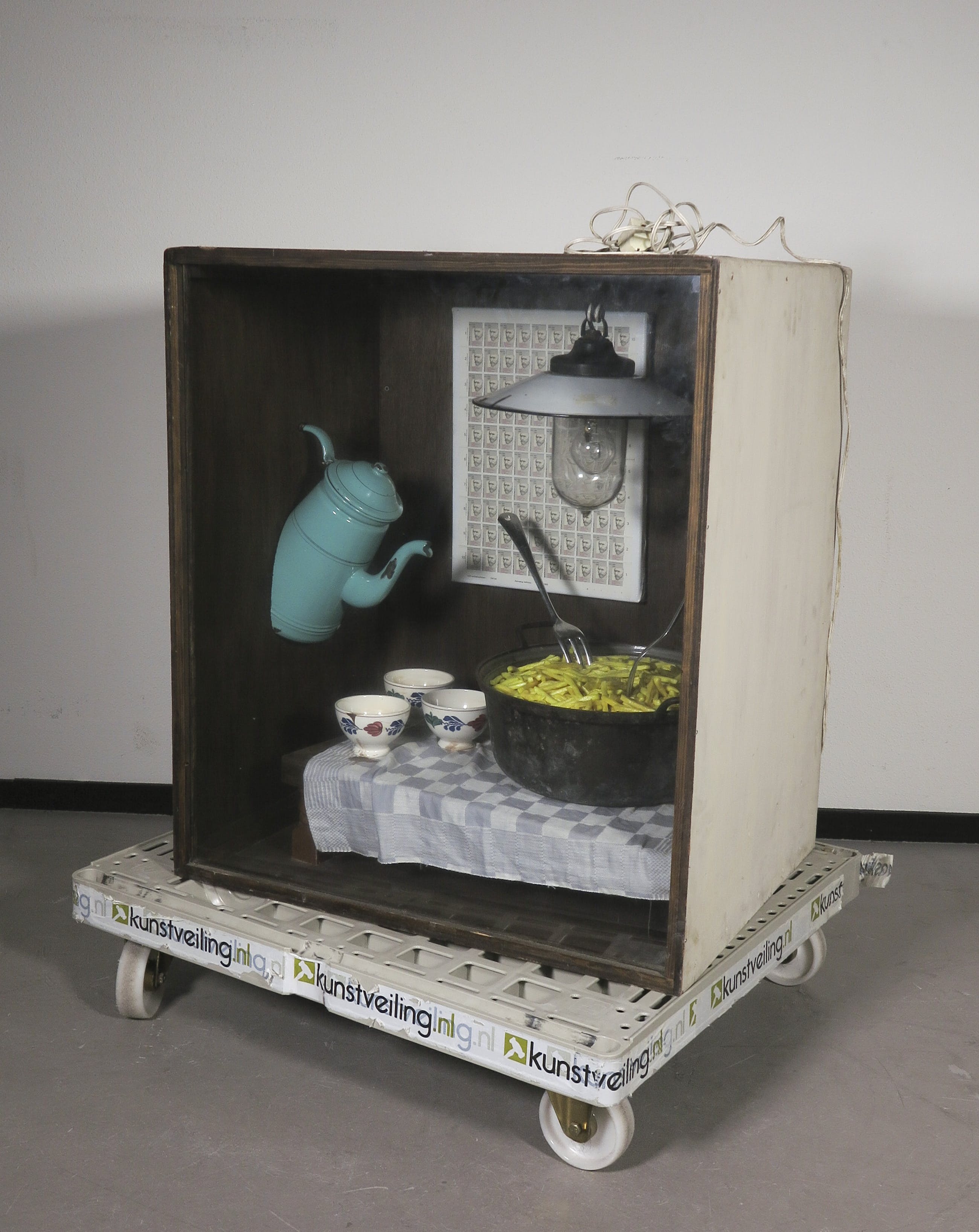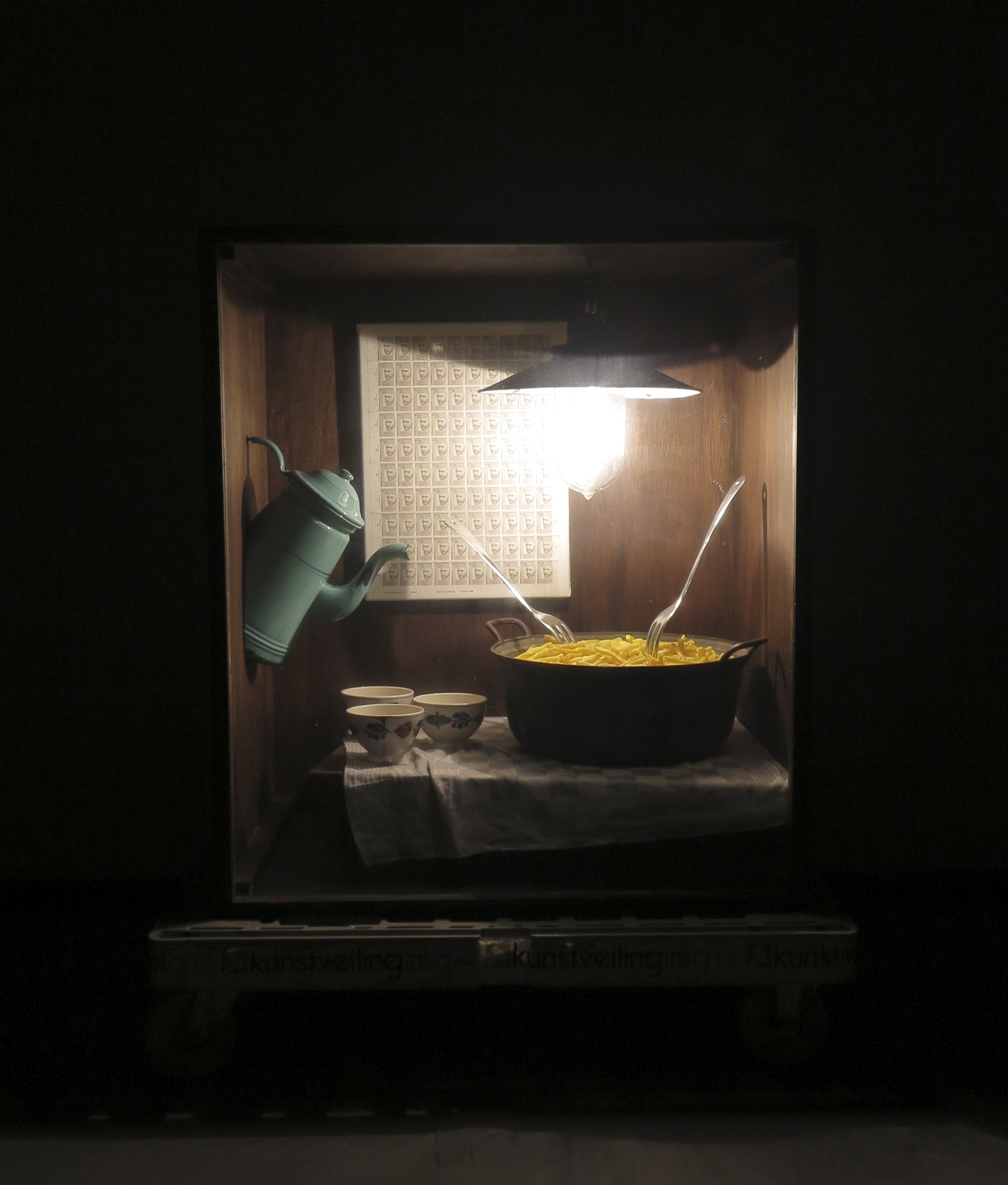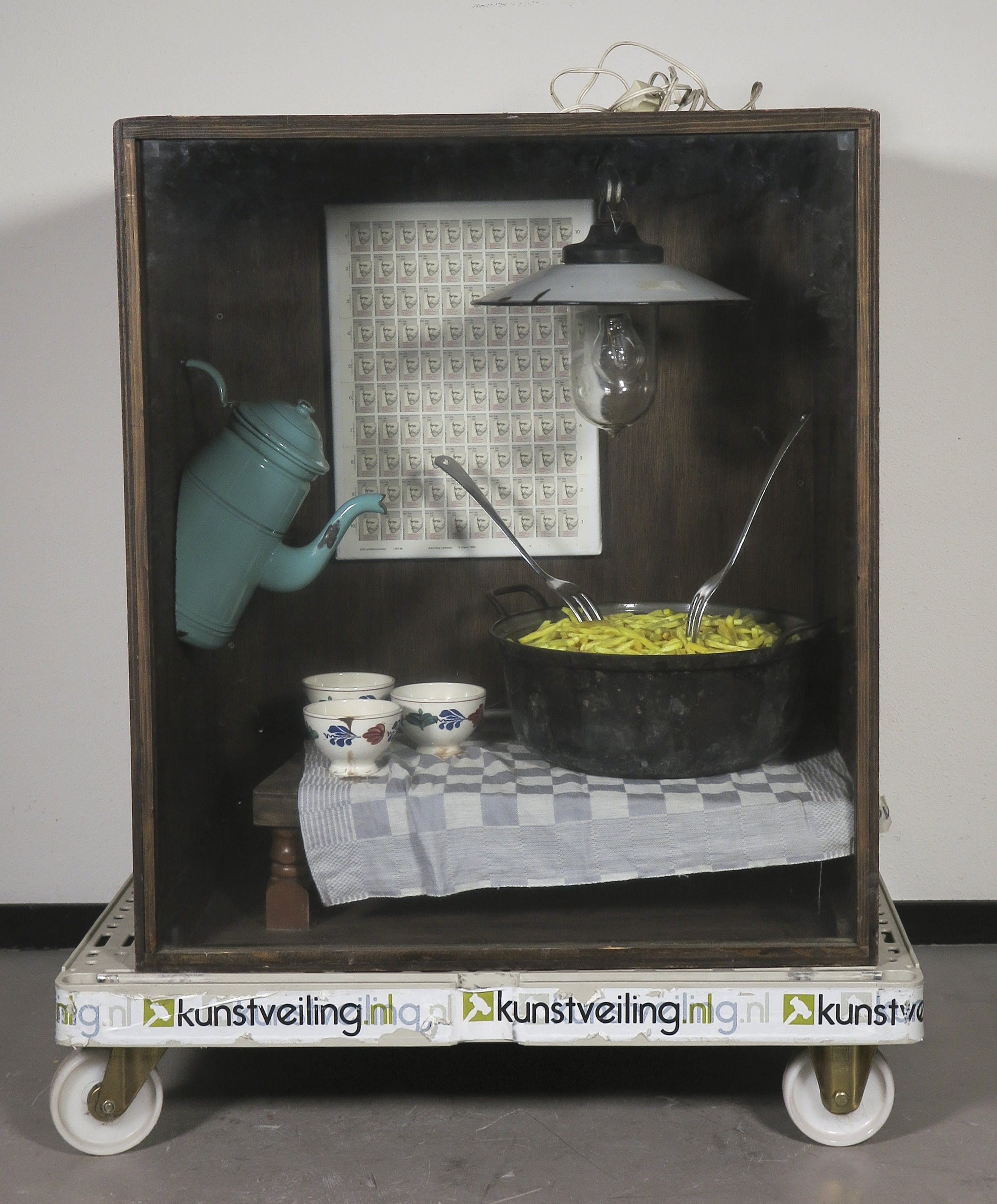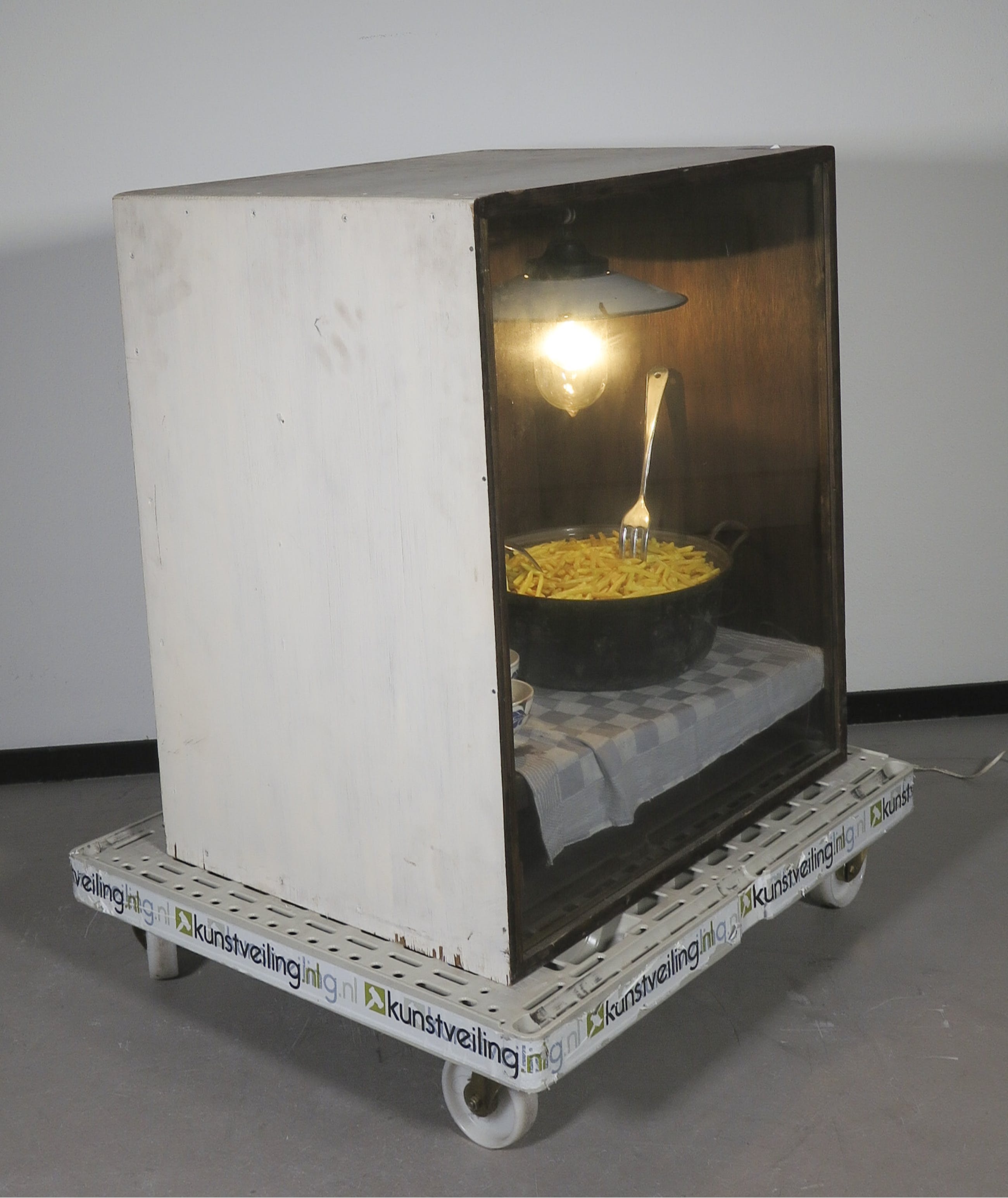 Gemaakt met referentie aan de aardappeleters van Vincent van Gogh: De Frieteters. (al heeft heeft werk geen titel, achterop staat "zonder titel")