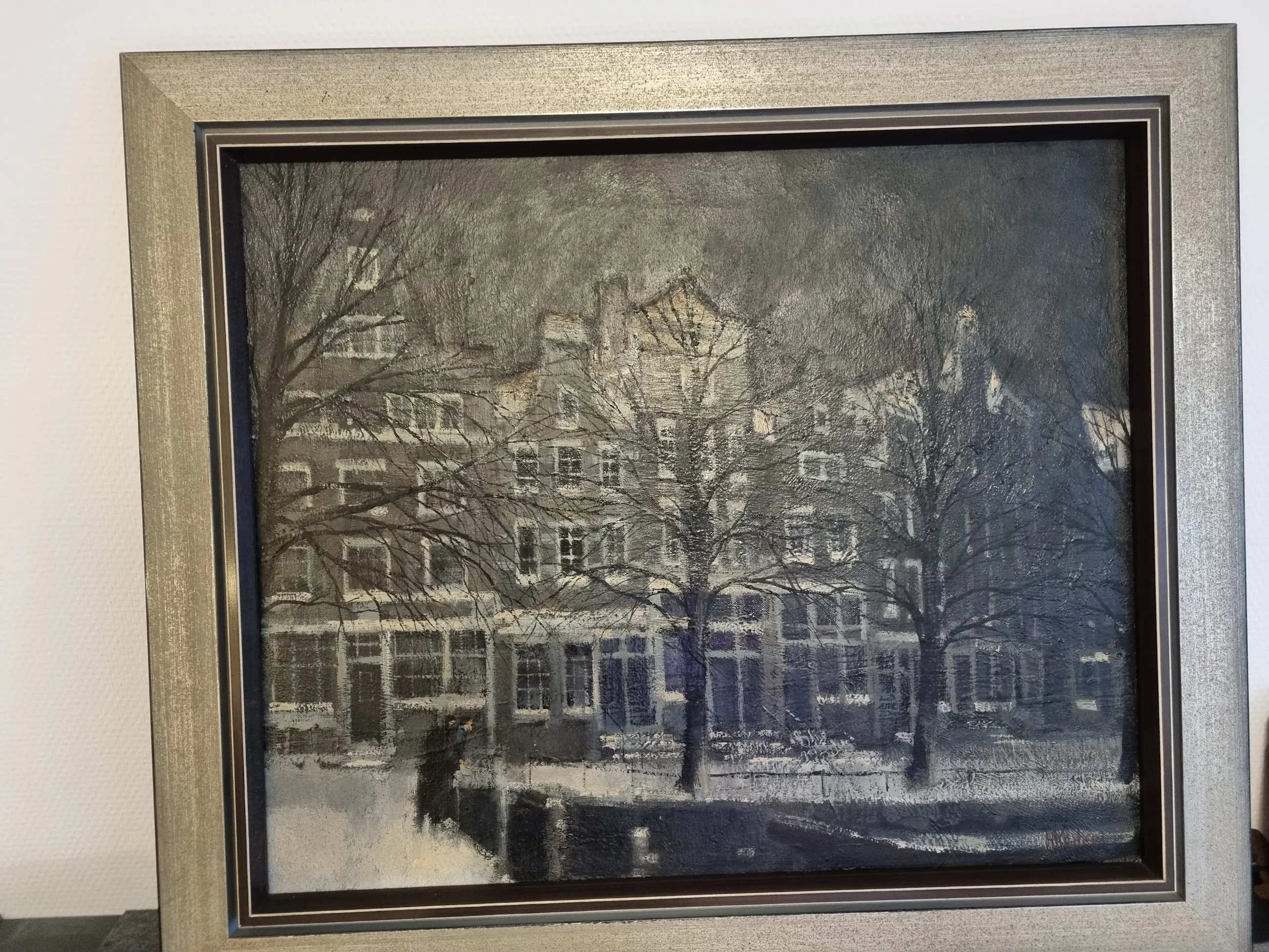 Dit vroege werk van Harry Kosters toont een verstild wintergezicht van de Oudezijds Voorburgwal in Amsterdam. Geschilderd rond 1970, behoort het tot zijn vroege en meest authentieke periode, waarin atmosfeer en stedelijke architectuur een belangrijke rol spelen.