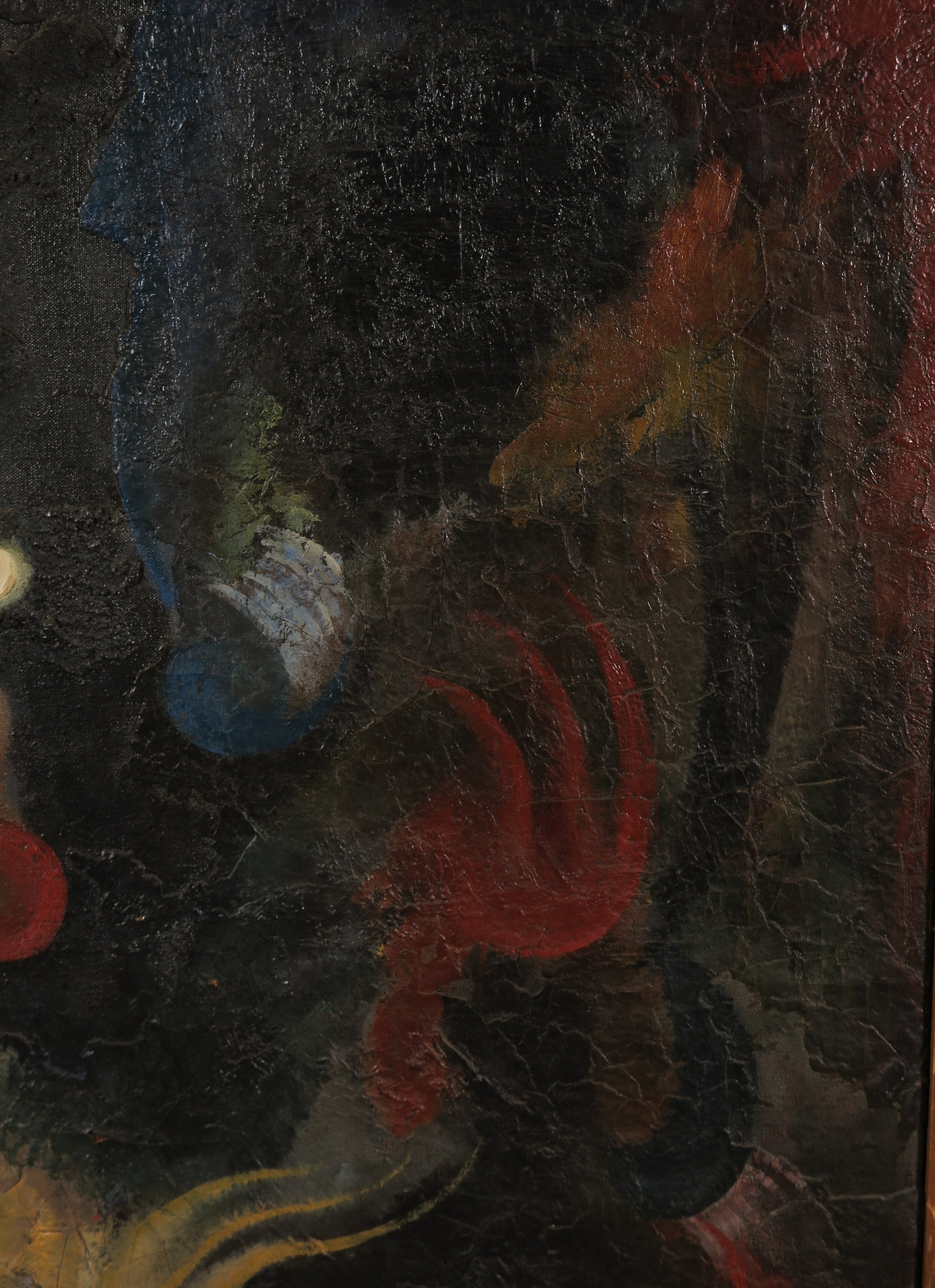 | Wat beschadigingen van de verflaag (bartjes, enkele lacunes). Het doek is wat kromgetrokken. | |
