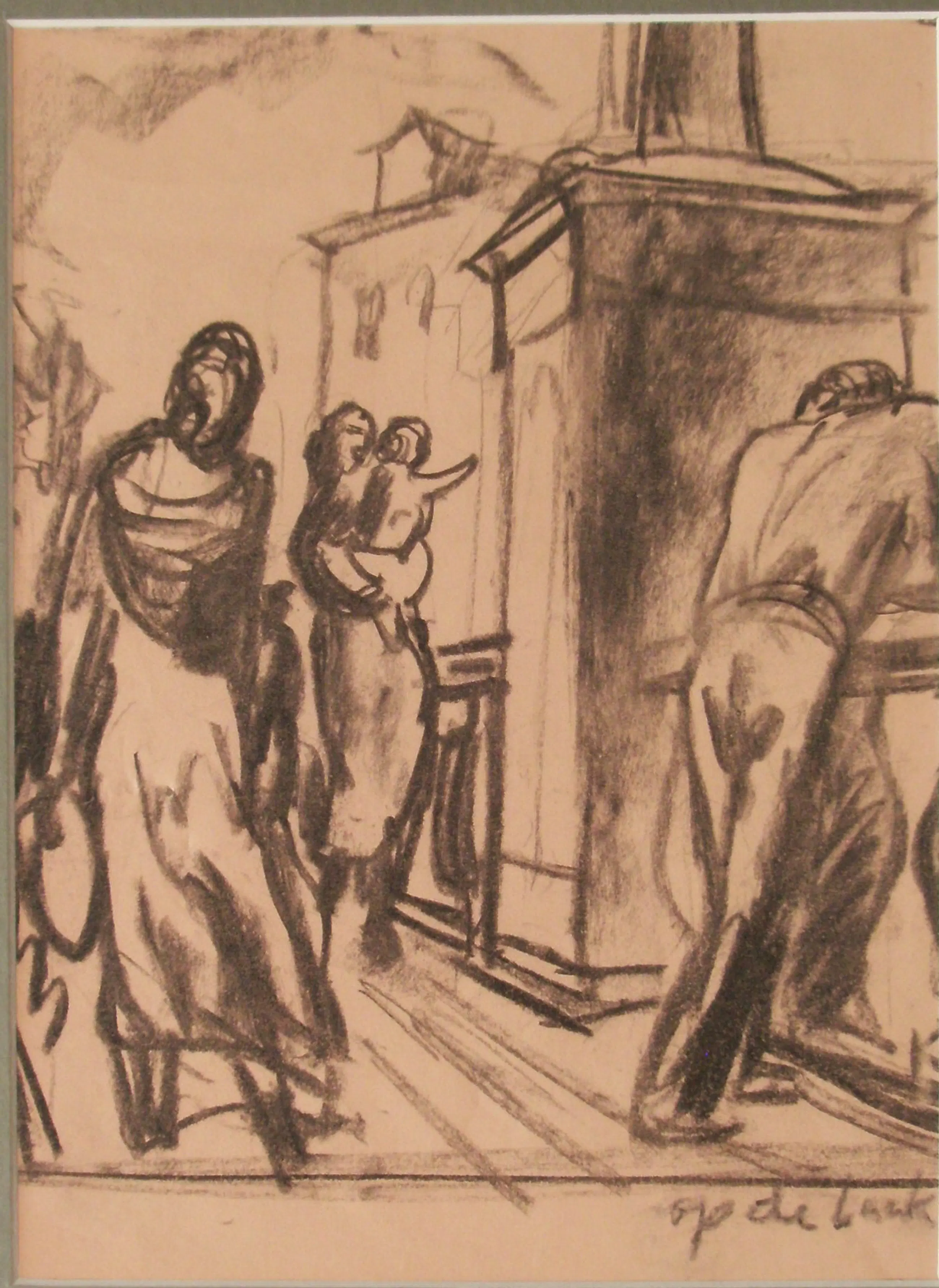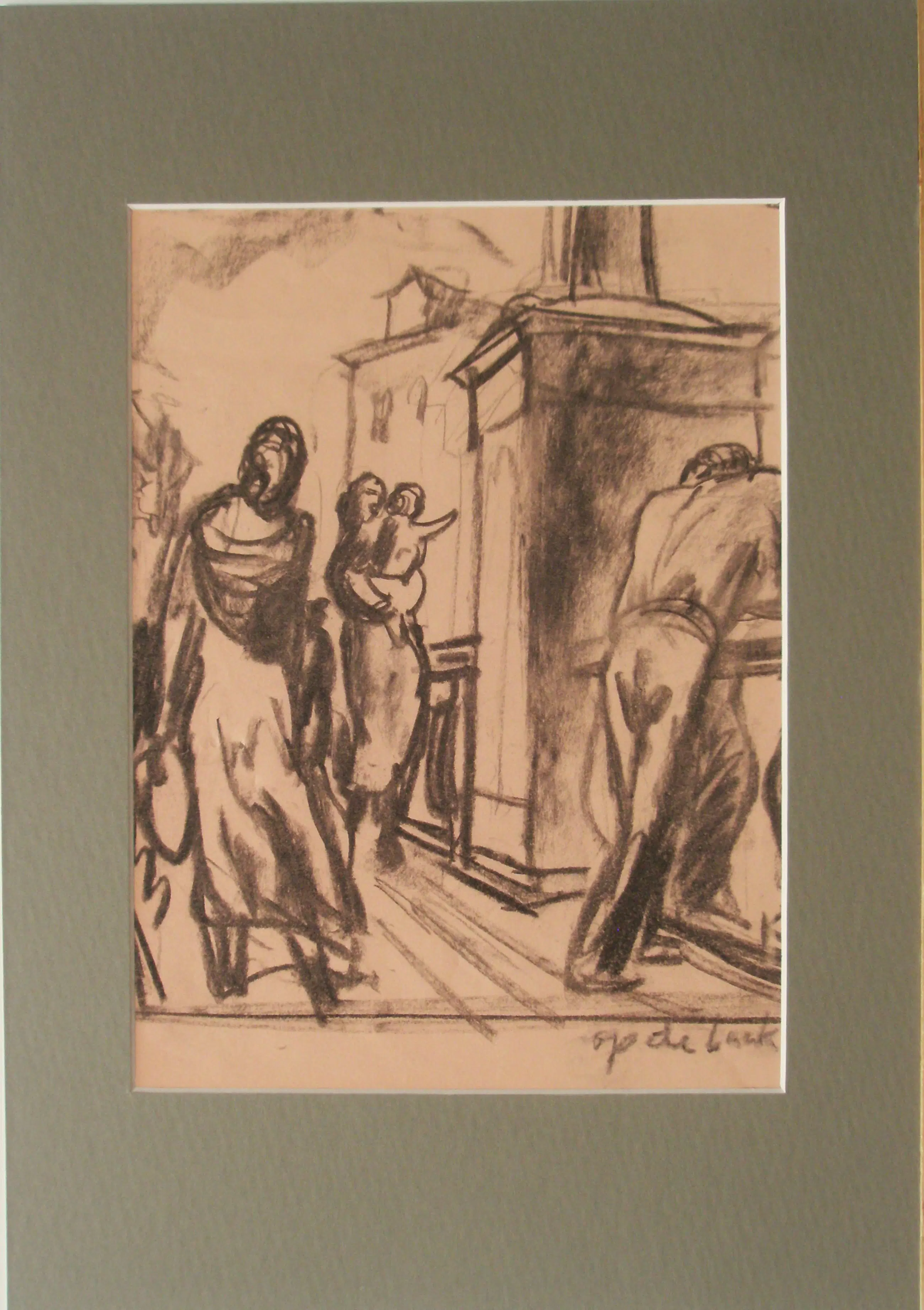 1- tekening "voetgangers" op gekleurd papier - 30 x 22cm - gesigneerd, zeer goed, passe-partout 45 x 31,5.