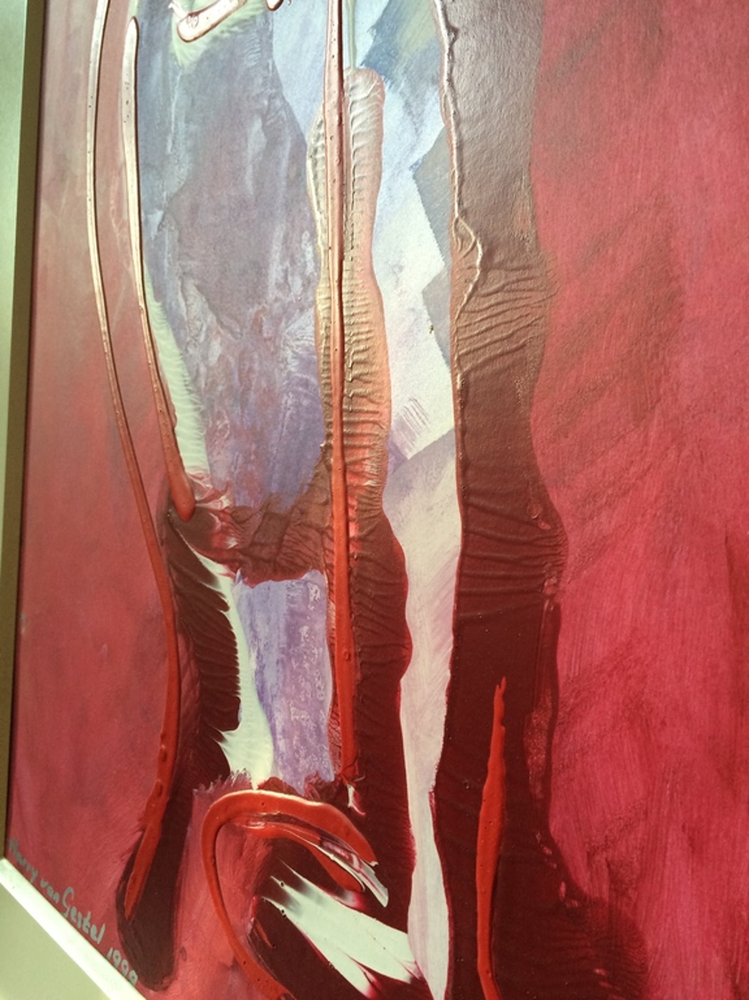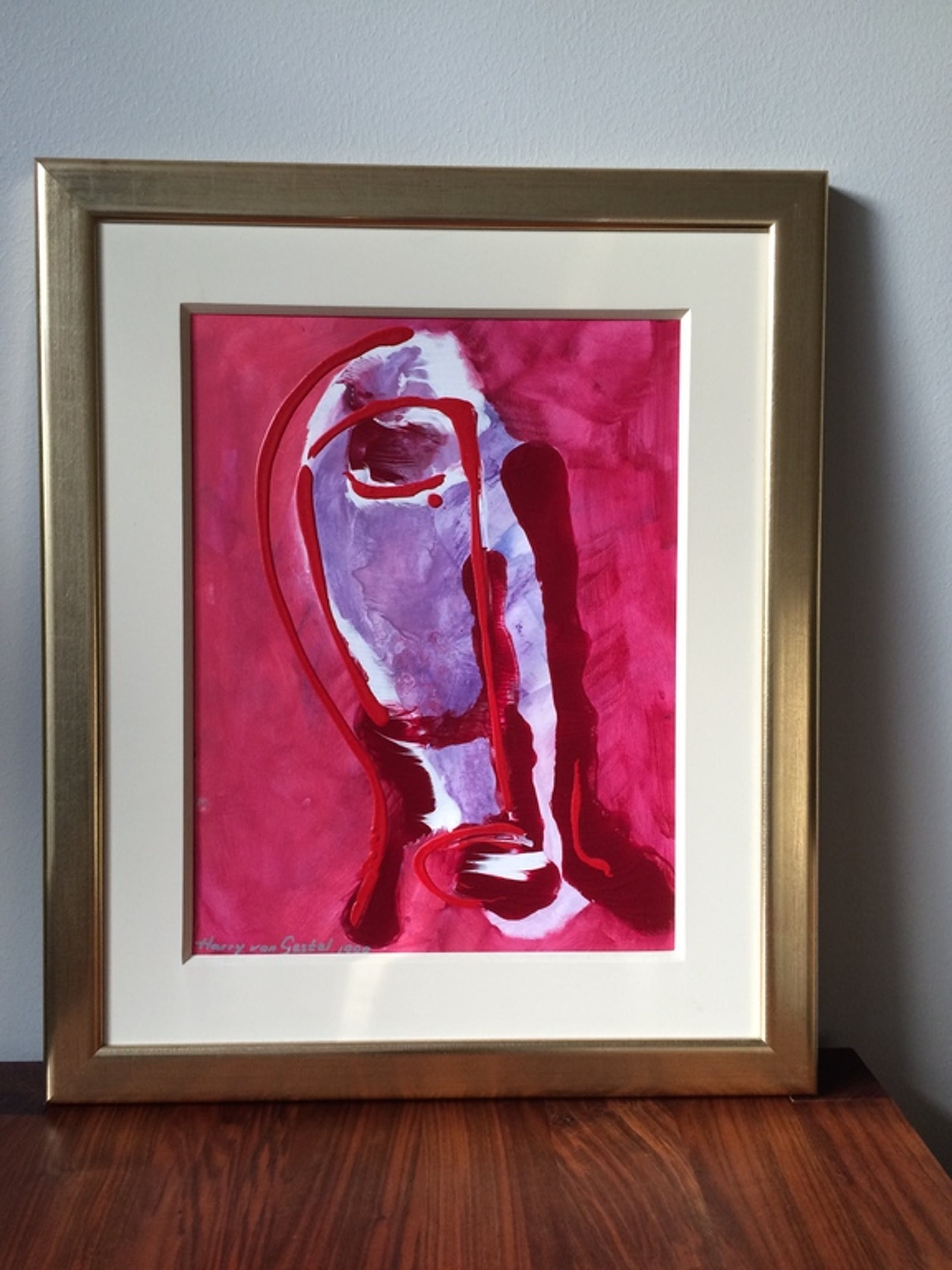 Verf op papier. Het werk is van Harry van Gestel ik heb het gekocht in zijn galerie Gaia aan de Torensteeg in Amsterdam. Het werk is handgesigneerd en is door galerie Gaia ingelijst met pasepartout.