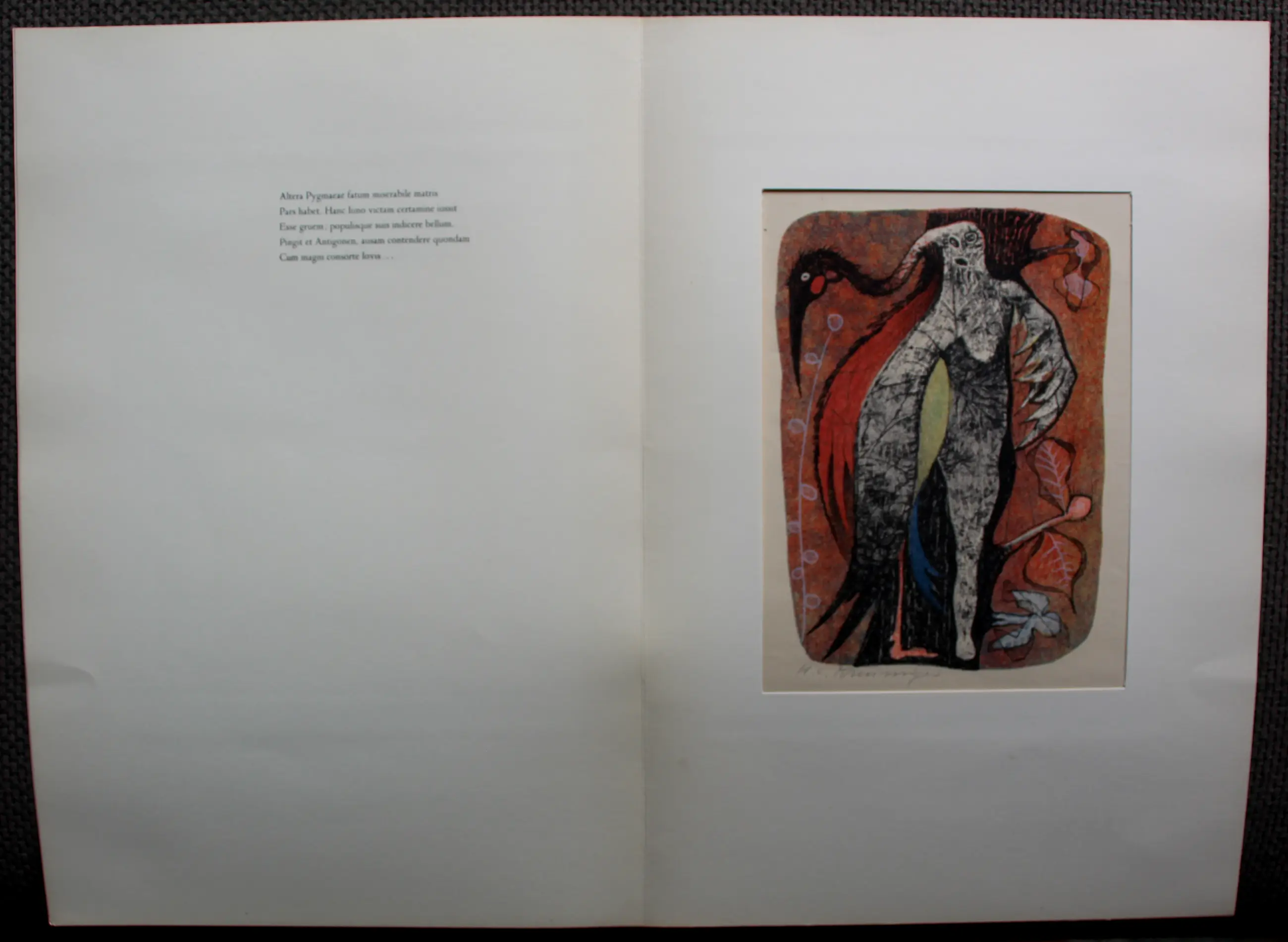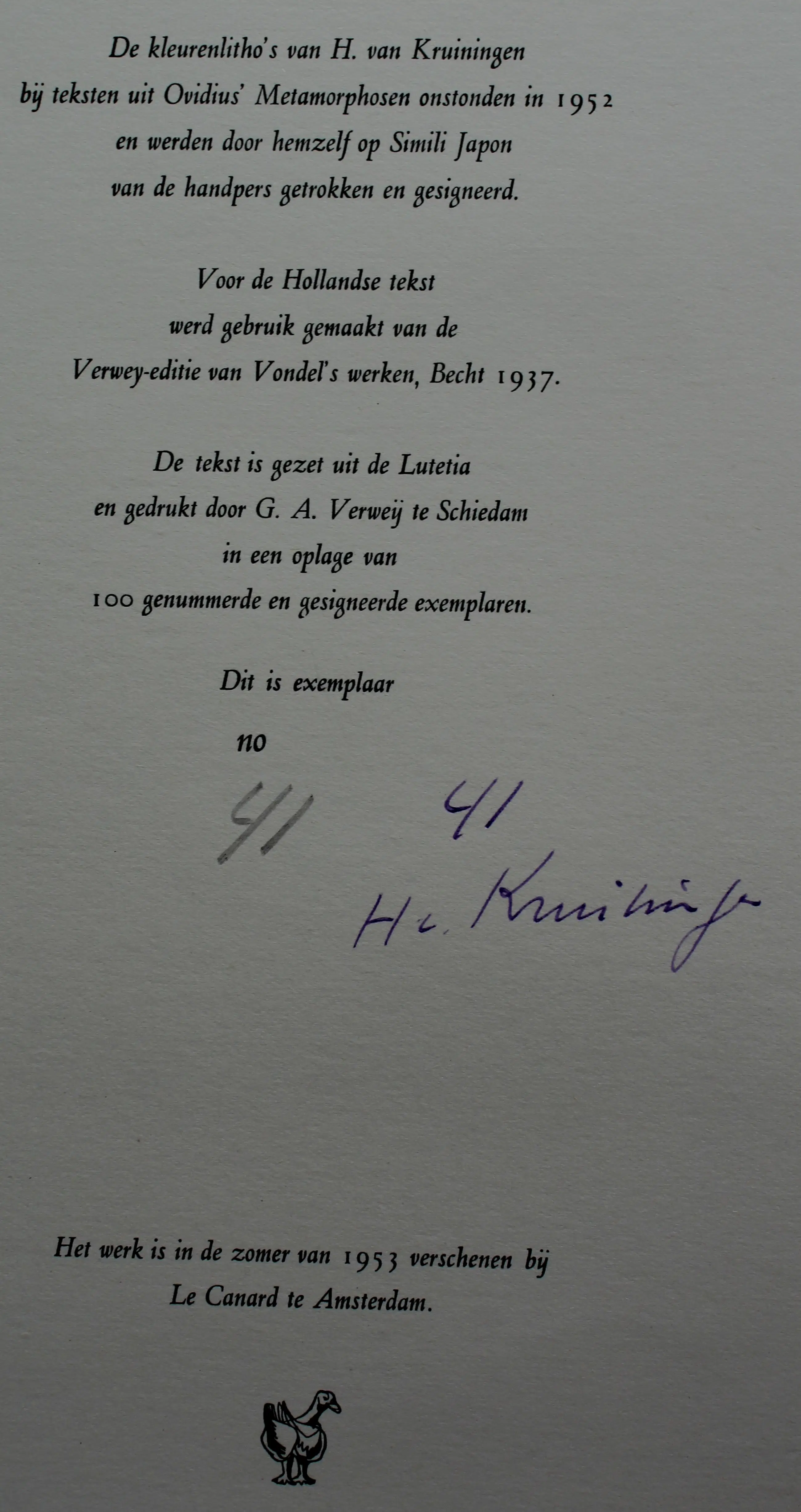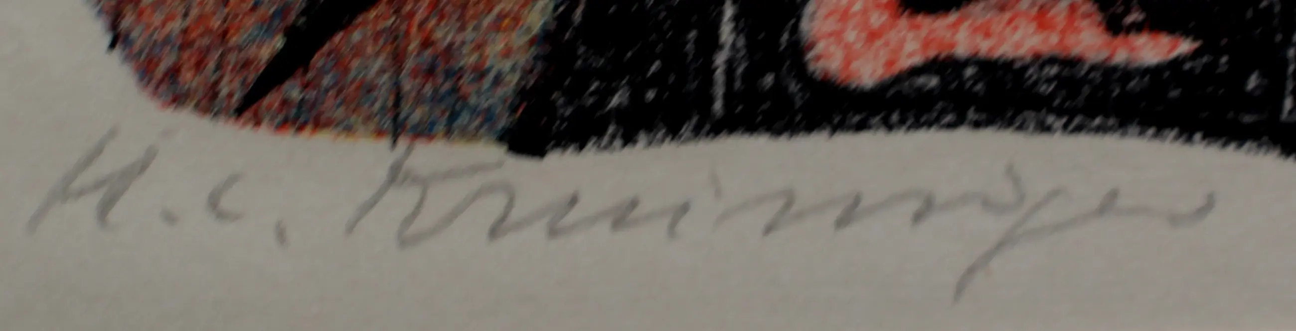 Kleuren litho van Harry van Kruiningen. Titel: Metamorphosen. Jaar: 1952. Oplage: 41/100. Afmetingen incl passe-partout: H39 x b26.5cm. Afmetingen voorstelling: H21 x b15.5cm. Het werk is links onderaan, gesigneerd door de kunstenaar. De authenticiteit van dit werk wordt volledig gegarandeerd. Een certificaat van echtheid kan, op aanvraag, worden gemaild.