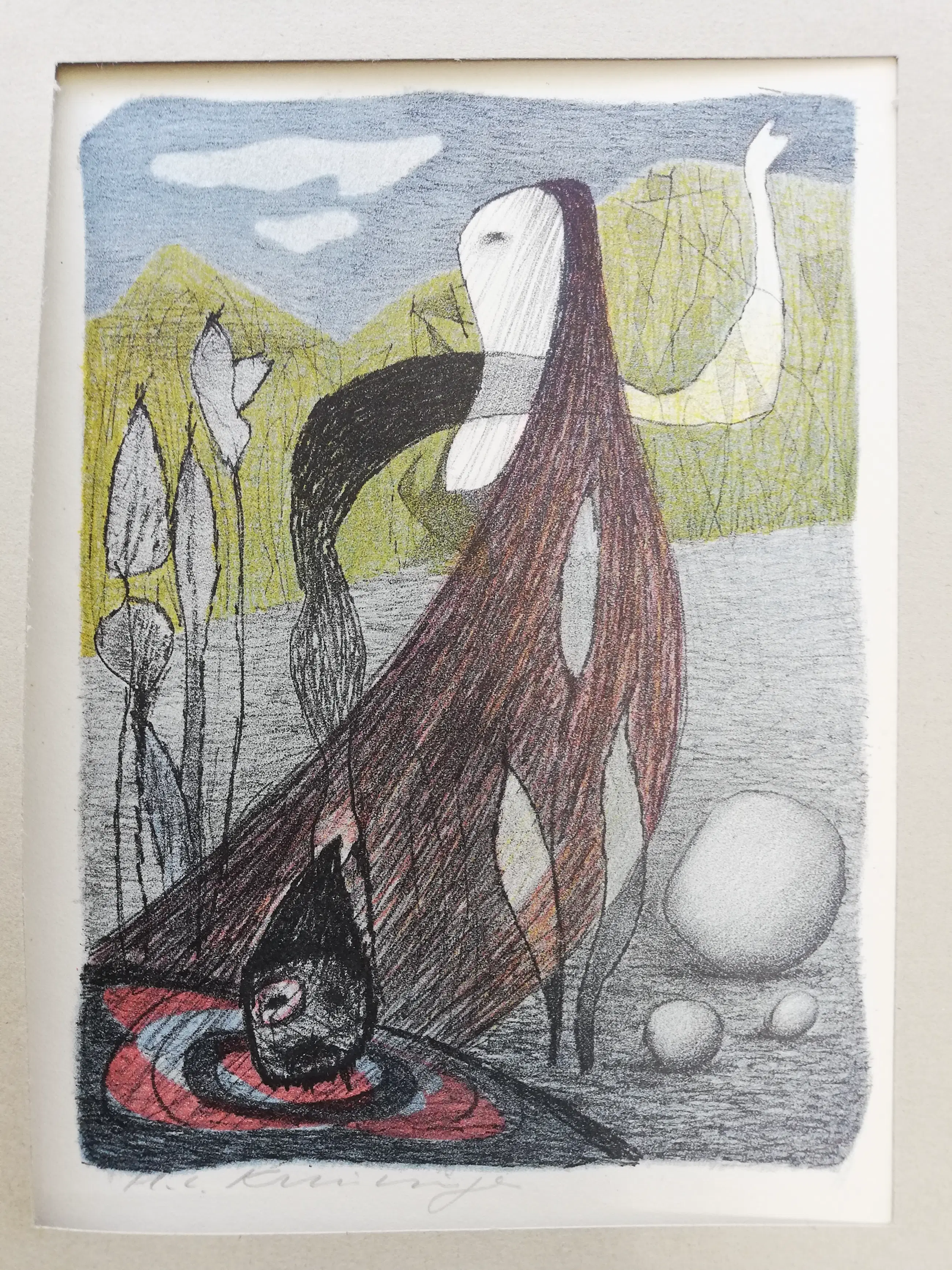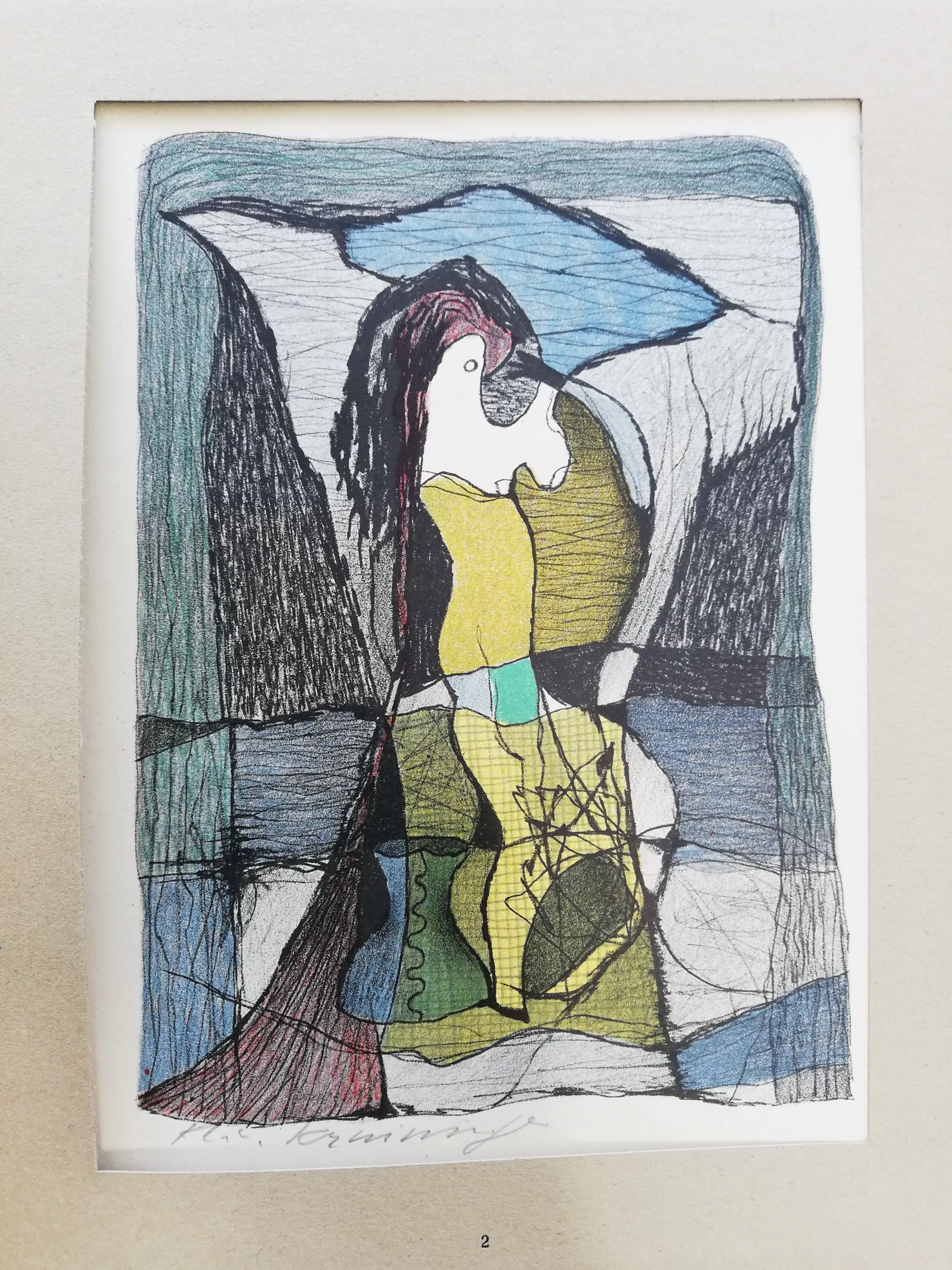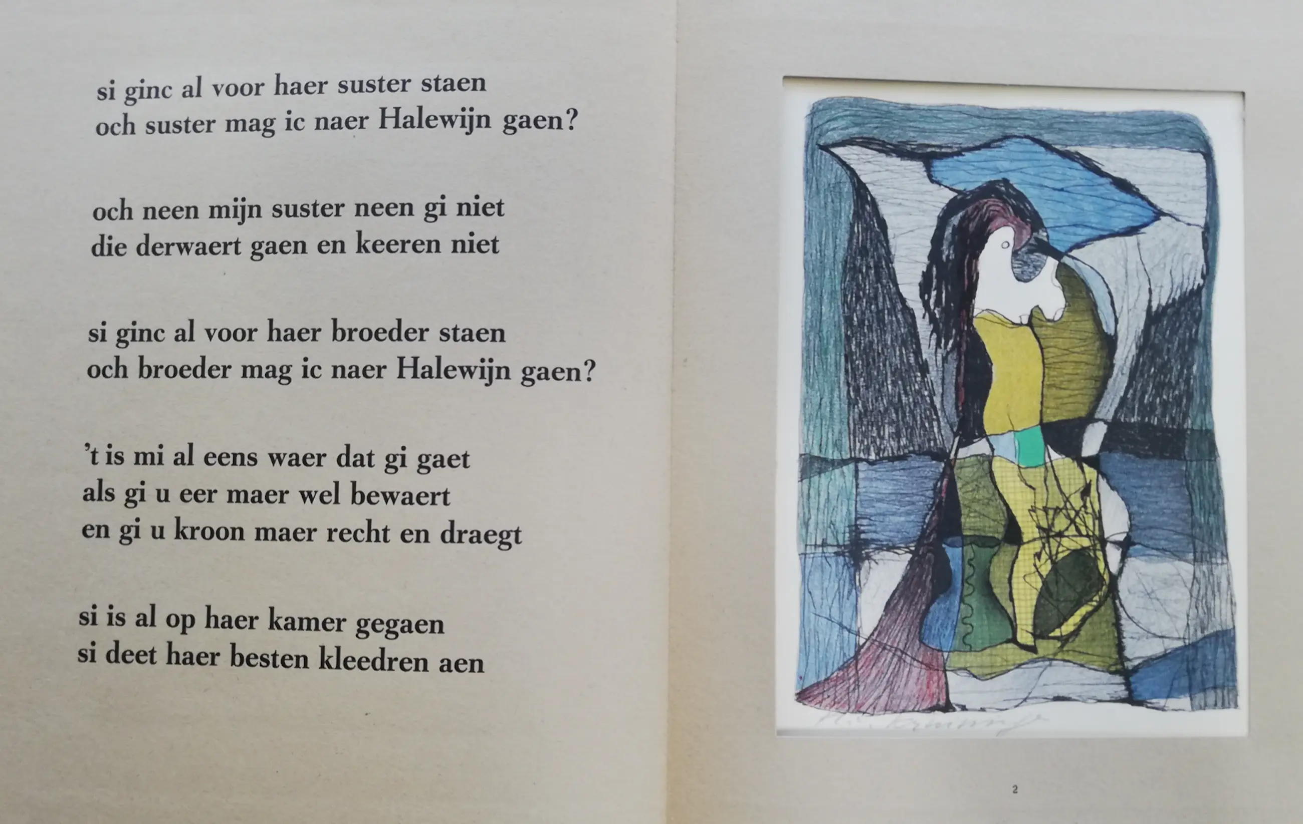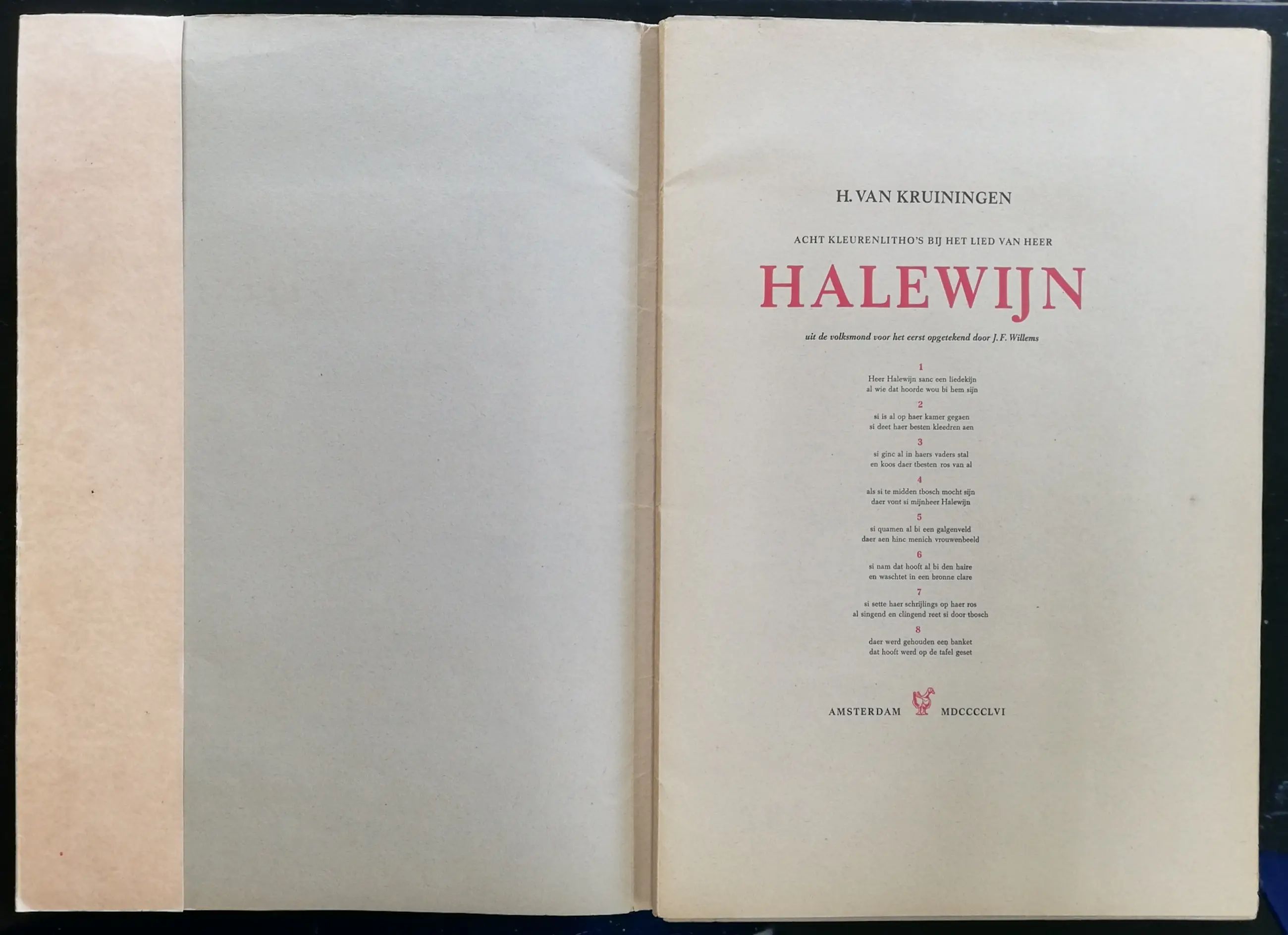 8 gesigneerde kleurenlitho's van Harry van Kruiningen in passepartouts in de publicatie 'het lied van heer Halewijn'. Worden vaak per stuk verkocht, dit is de complete set met de verhalen erbij. Handgesigneerd per litho en in de colofon en genummerd 223 van 250 stuks.