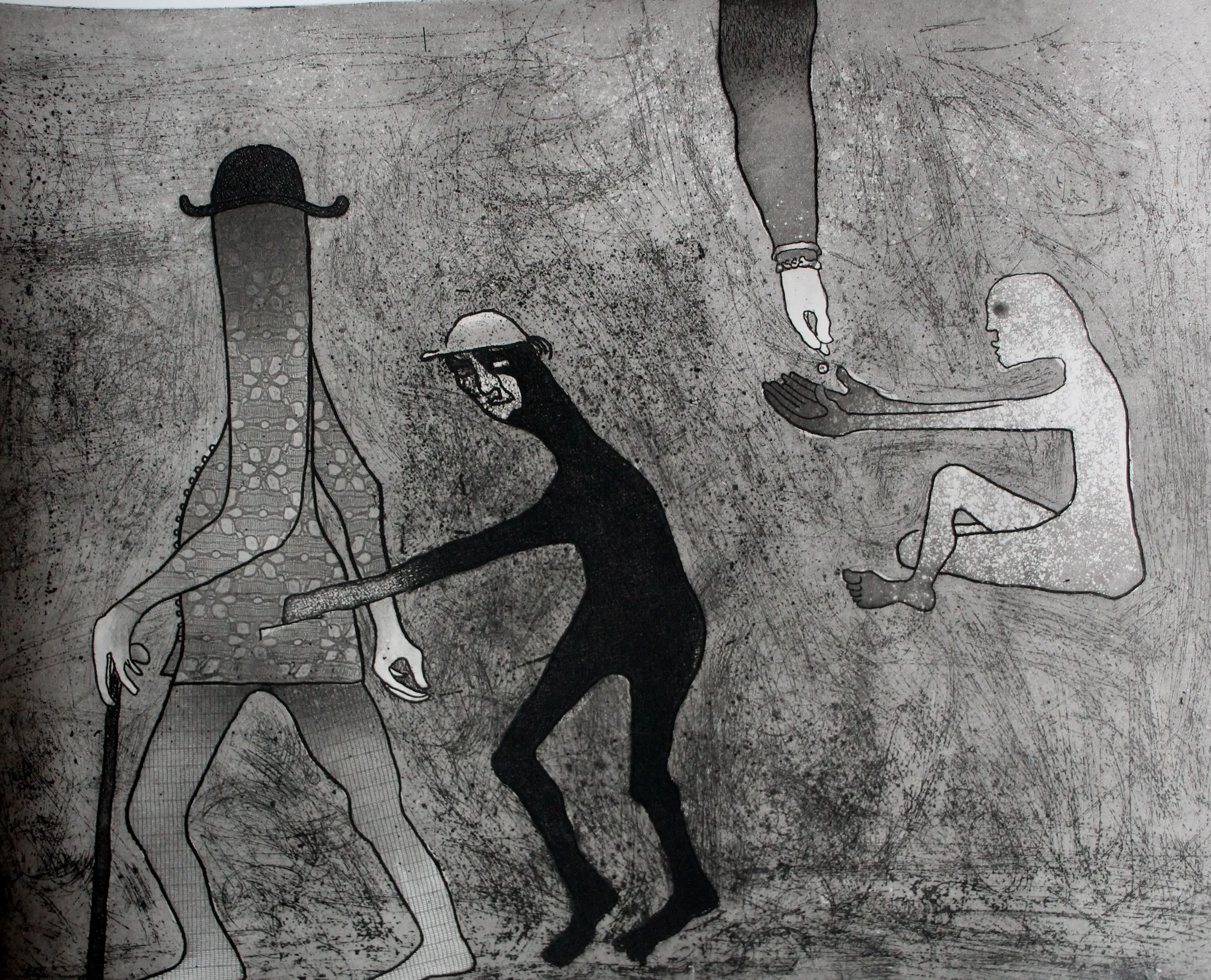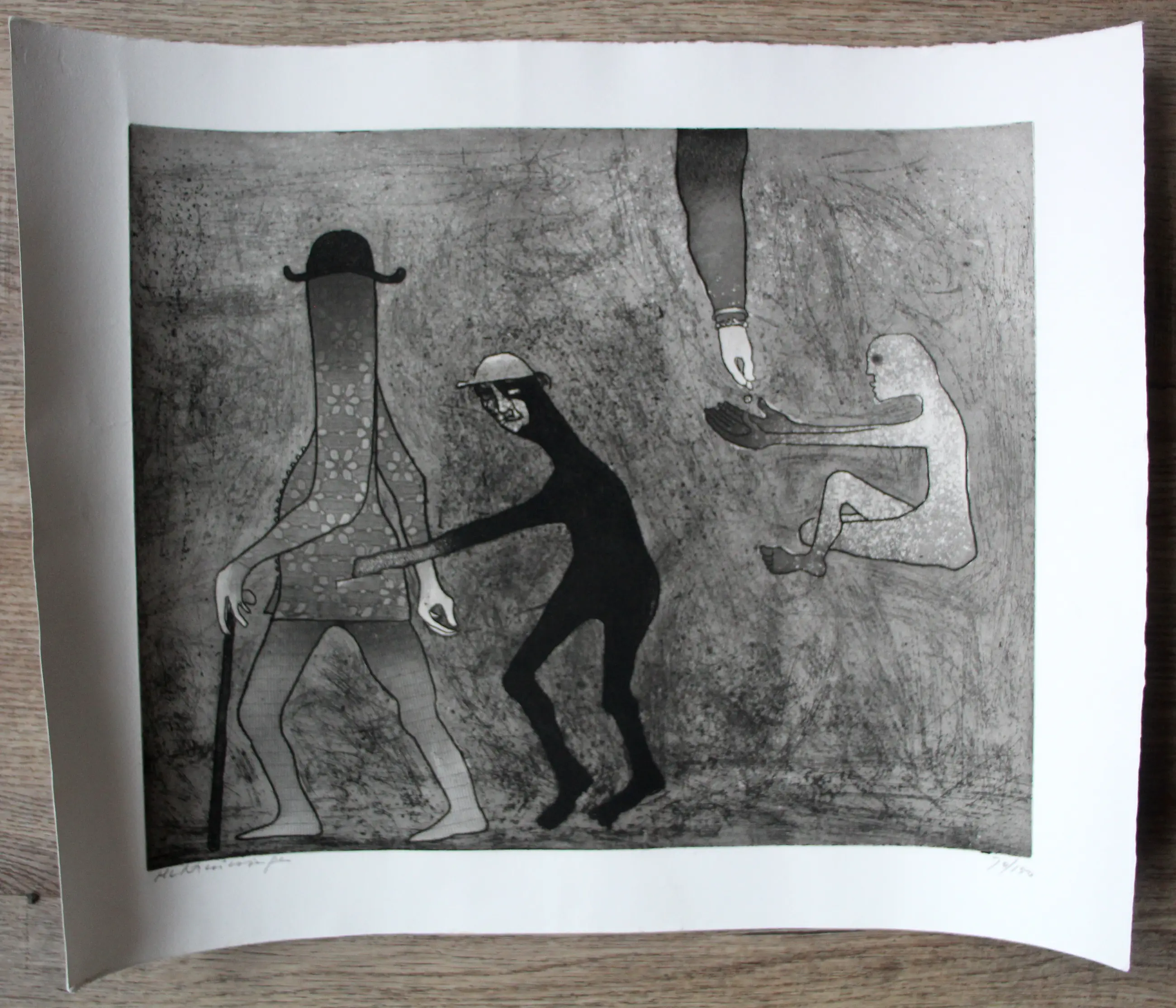 Ets van Harry van Kruiningen. Titel: De zakkenroller en de bedelaar. Oplage: 79/150. Afmetingen blad : H39.5 x b49.5cm. Afmetingen voorstelling: H32 x b39cm. Het werk is links onder, met potlood, gesigneerd door de kunstenares. De authenticiteit van het, aangeboden, werk wordt volledig gegarandeerd. Een certificaat van echtheid kan, op aanvraag, worden gemaild.