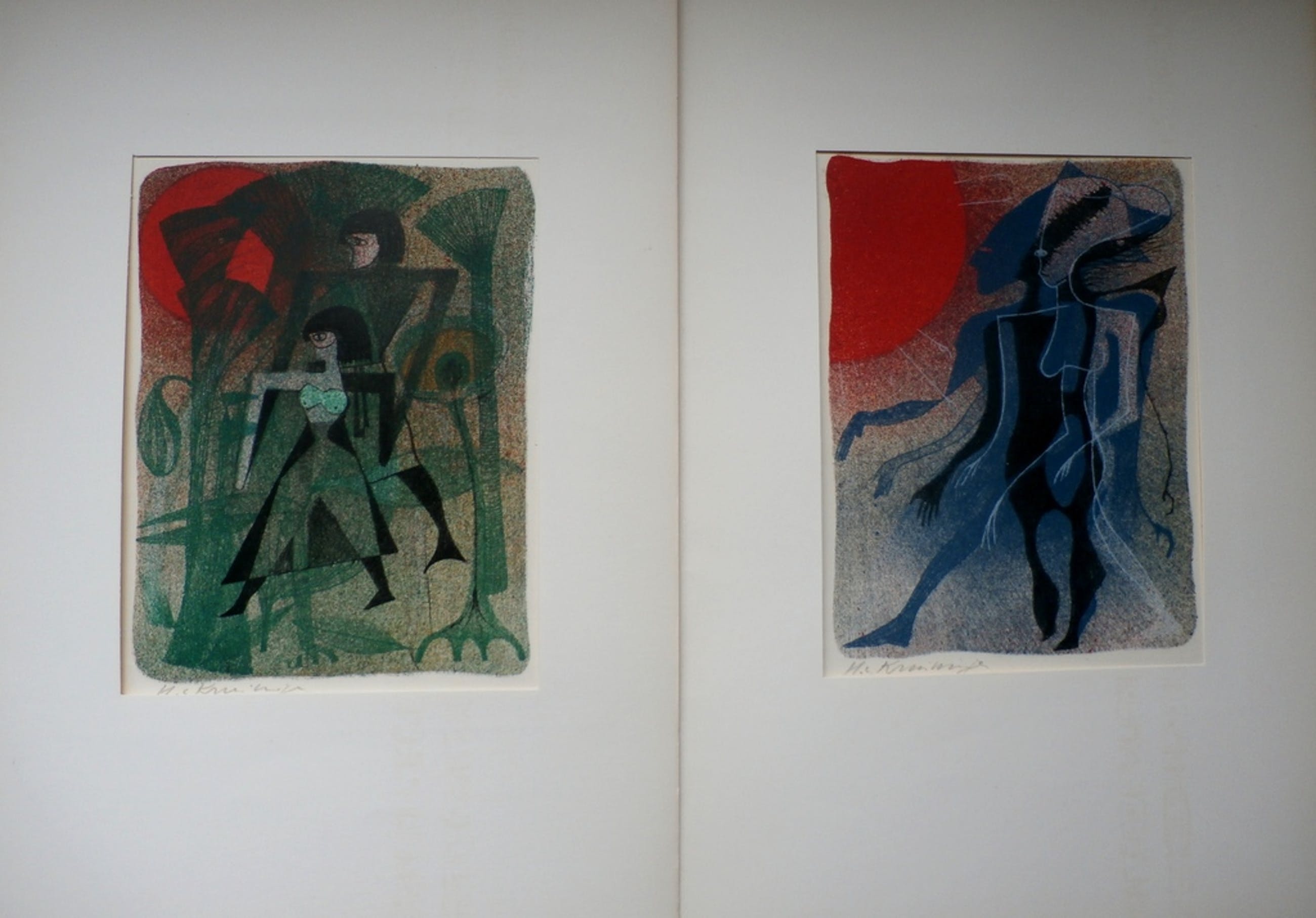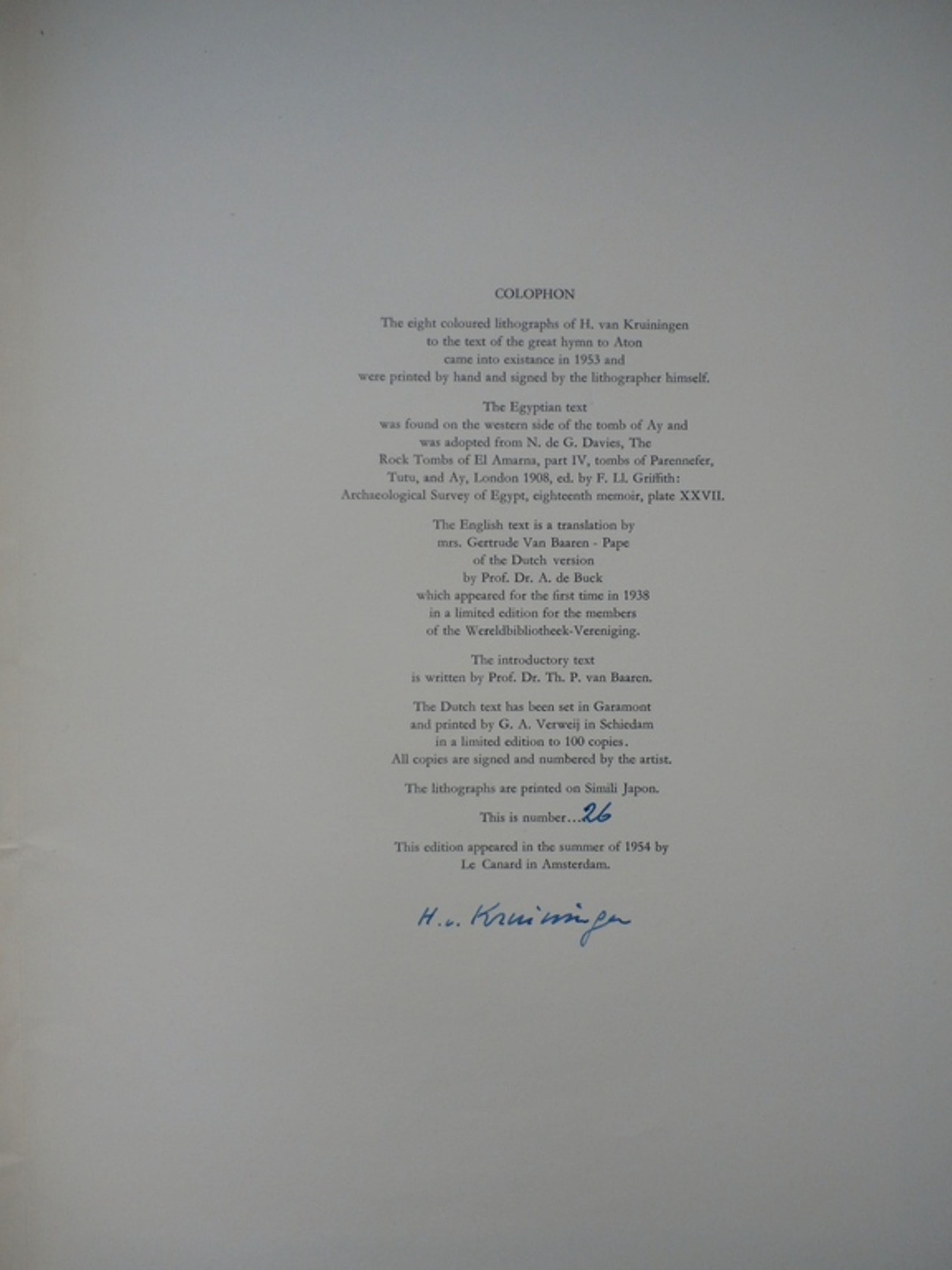 Complete uitgave van "Akhnaton"van Harry van Kruiningen met 8 kleurenlitho’s op Simili Japon. Elke litho plus de colophon is handgesigneerd door van Kruiningen. Uitgegeven in een oplage van 100 stuks door "Le Canard" te Amsterdam in 1954. De litho's zijn gemaakt in 1953. Dit is nummer: 26. Afmetingen bladen: H39,5 x b53 cm (= incl. tekstblad). Afmetingen voorstelling litho: H21 x b16 cm. Dit is één van de Engelse uitgaves. De authenciteit van dit werk wordt volledig gegarandeerd. Een certificaat van echtheid kan, op verzoek, worden meegeleverd.