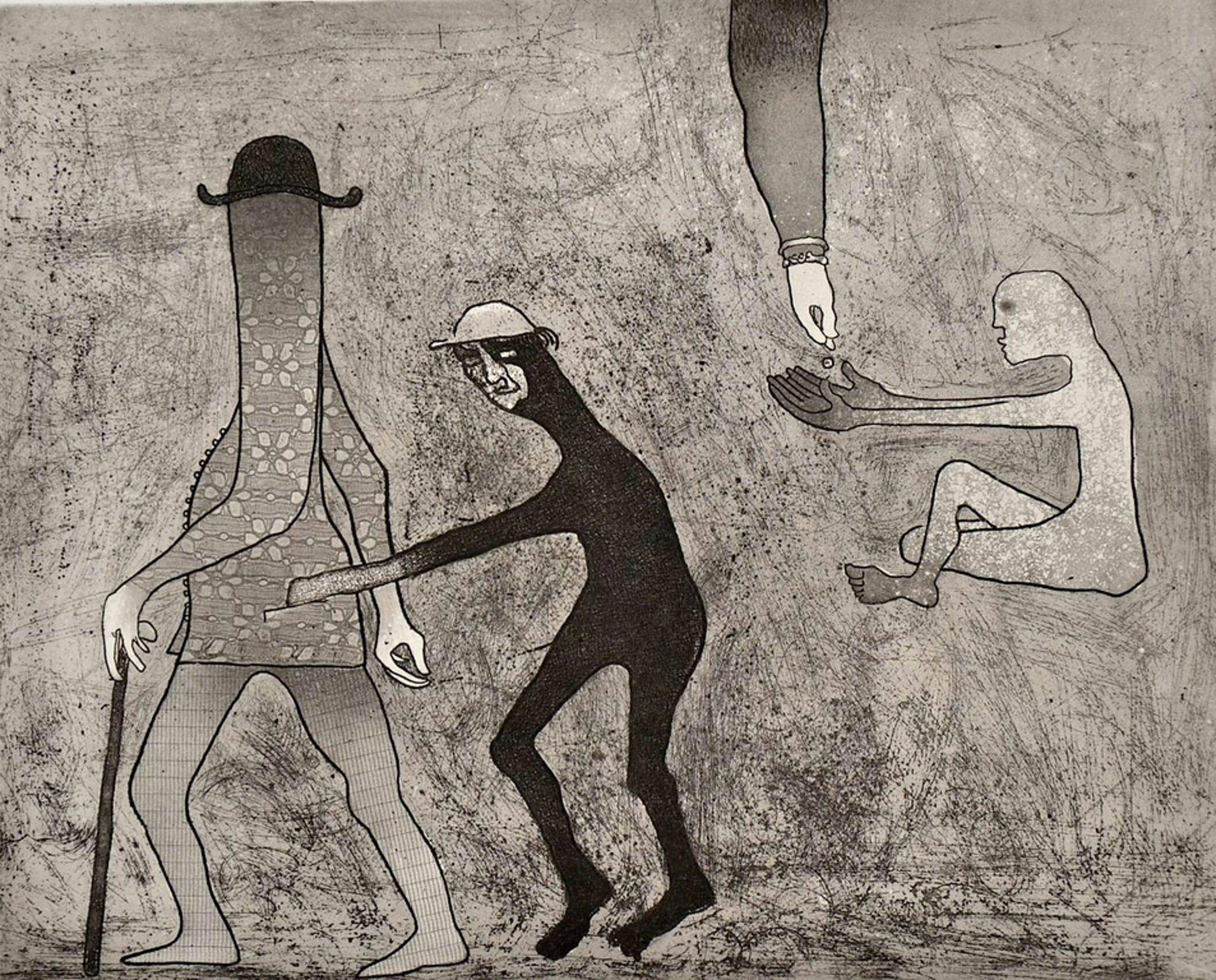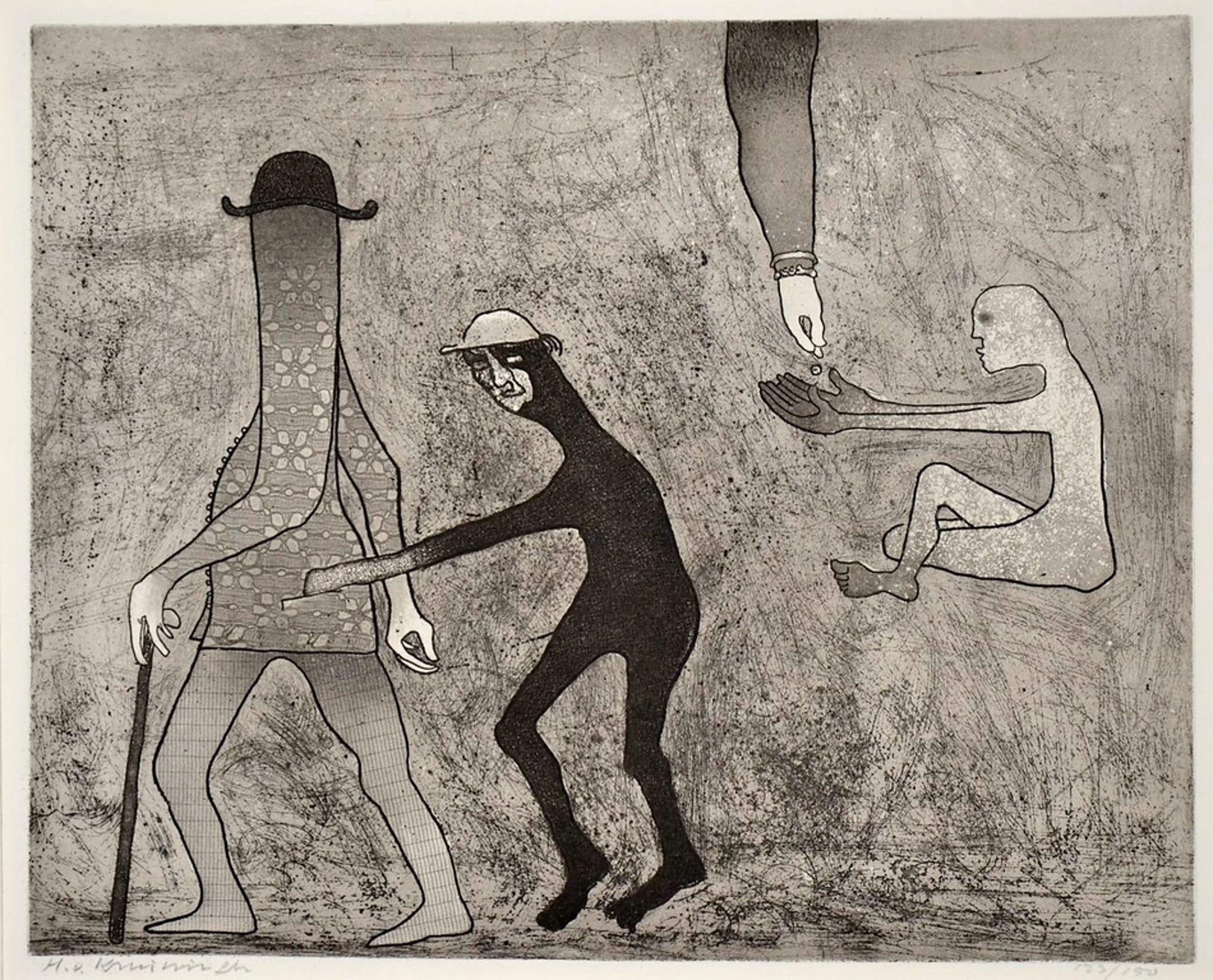 Zeer mooie grote ets/aquatint van Harry van Kruiningen waarop een zakkenroller en bedelaar in beeld zijn weergeven. In mooi passe-partout.