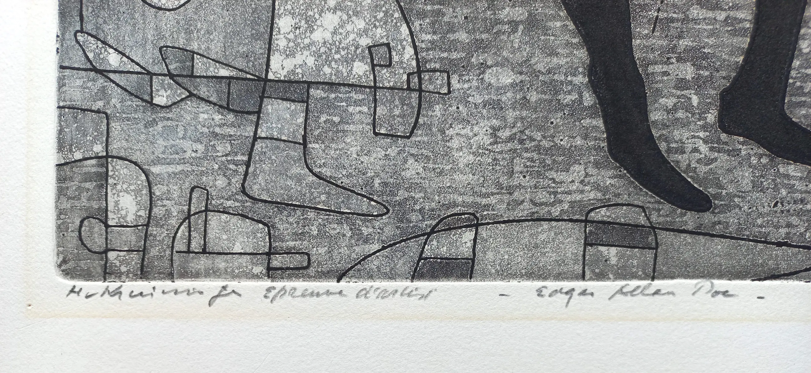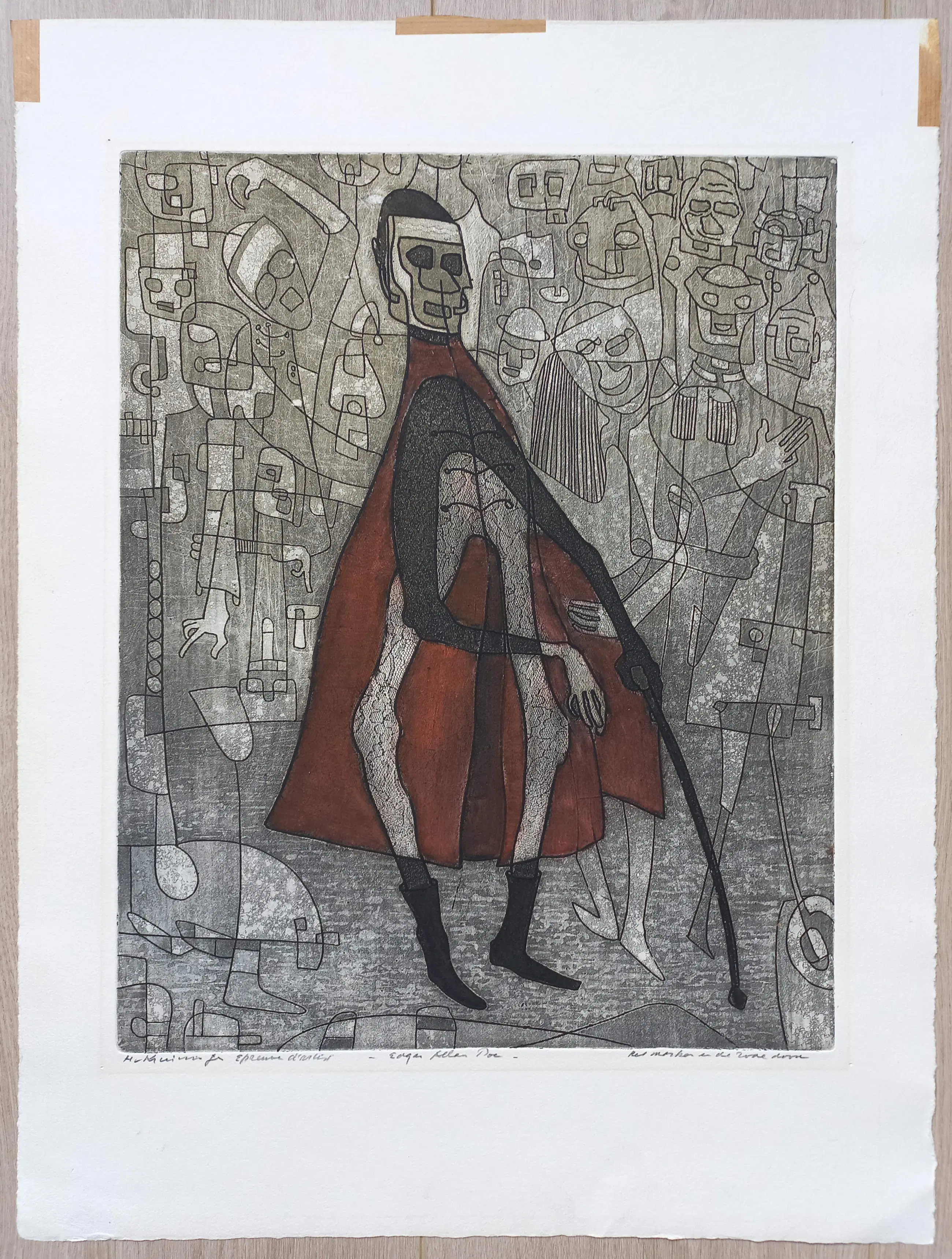 Zeer mooie, gelaagde ets van Harry van Kruiningen, uit de serie Edgar Allan Poe. Kleurenets op geschept papier, met potlood gesigneerd en getiteld, een Épreuve d’Artiste exemplaar. In goede conditie.