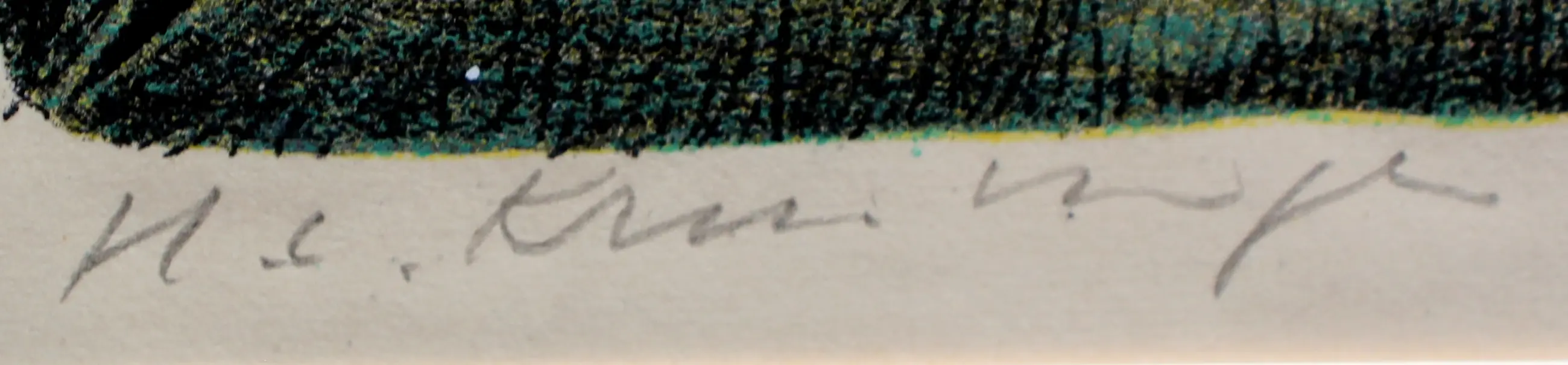 Kleuren litho van Harry van Kruiningen. Titel: Metamorphosen. Jaar: 1952. Oplage: 41/100. Afmetingen incl passe-partout: H39 x b26.5cm. Afmetingen voorstelling: H21 x b15.5cm. Het werk is links onderaan, gesigneerd door de kunstenaar. De authenticiteit van dit werk wordt volledig gegarandeerd. Een certificaat van echtheid kan, op aanvraag, worden gemaild.