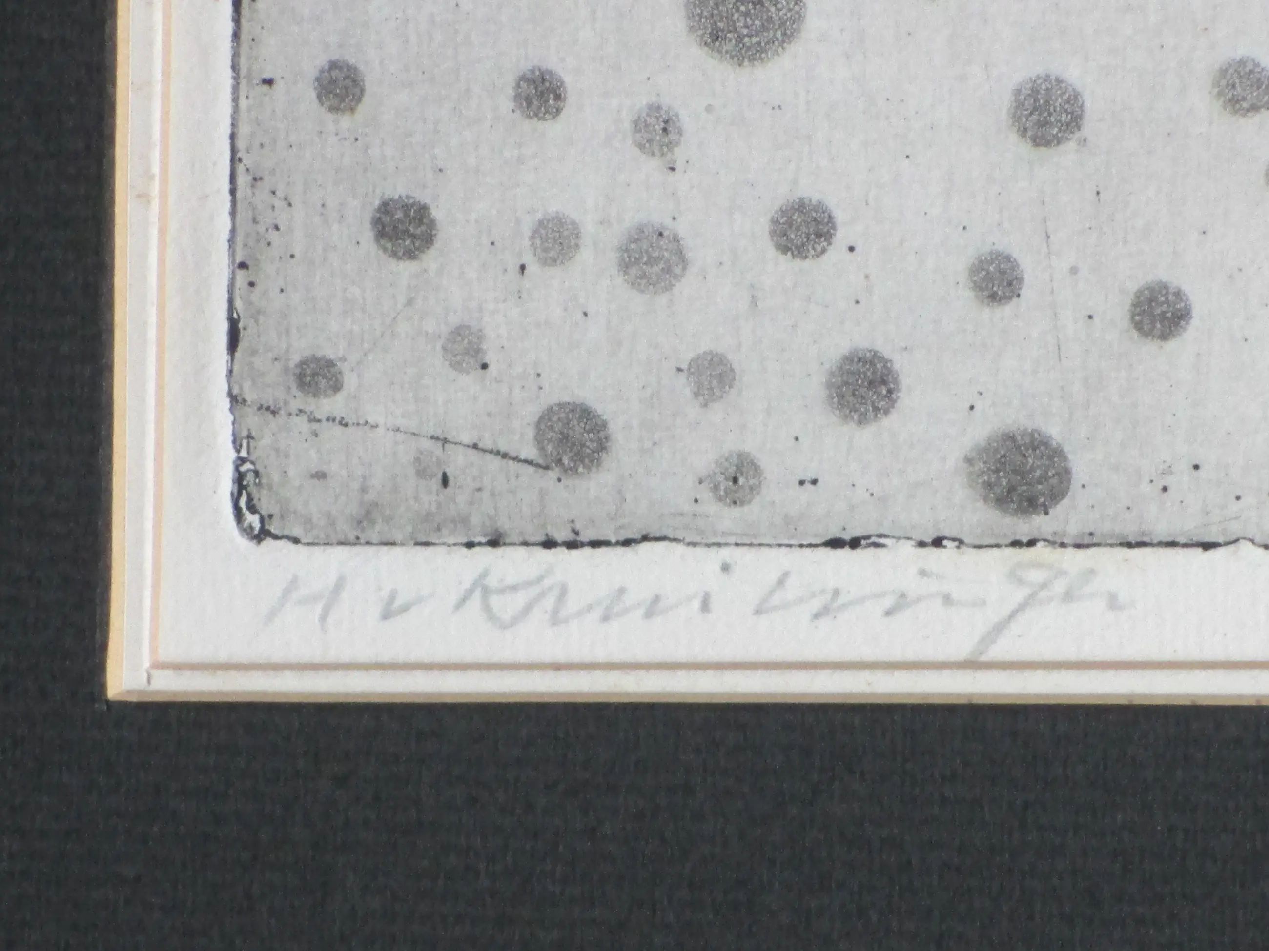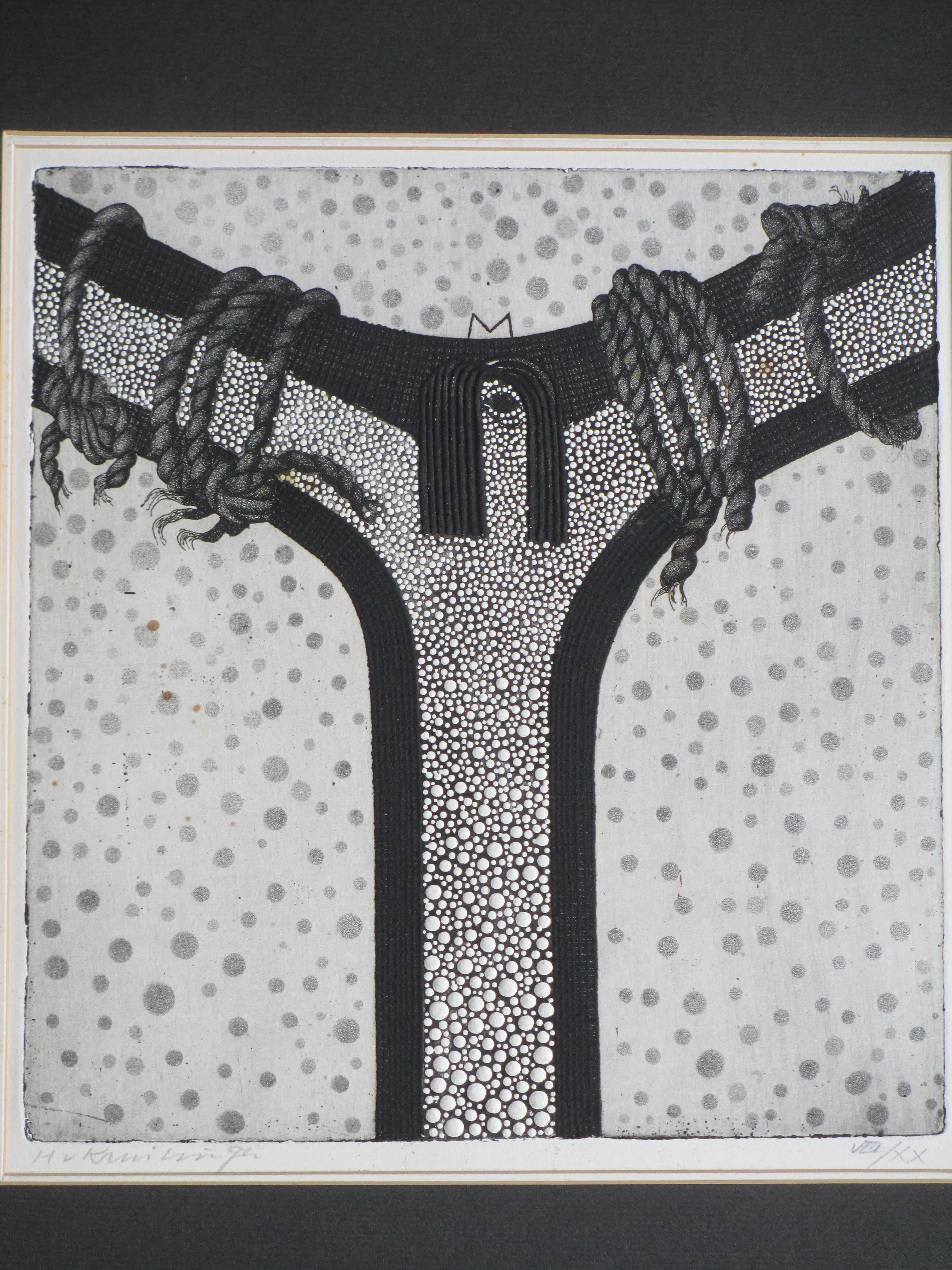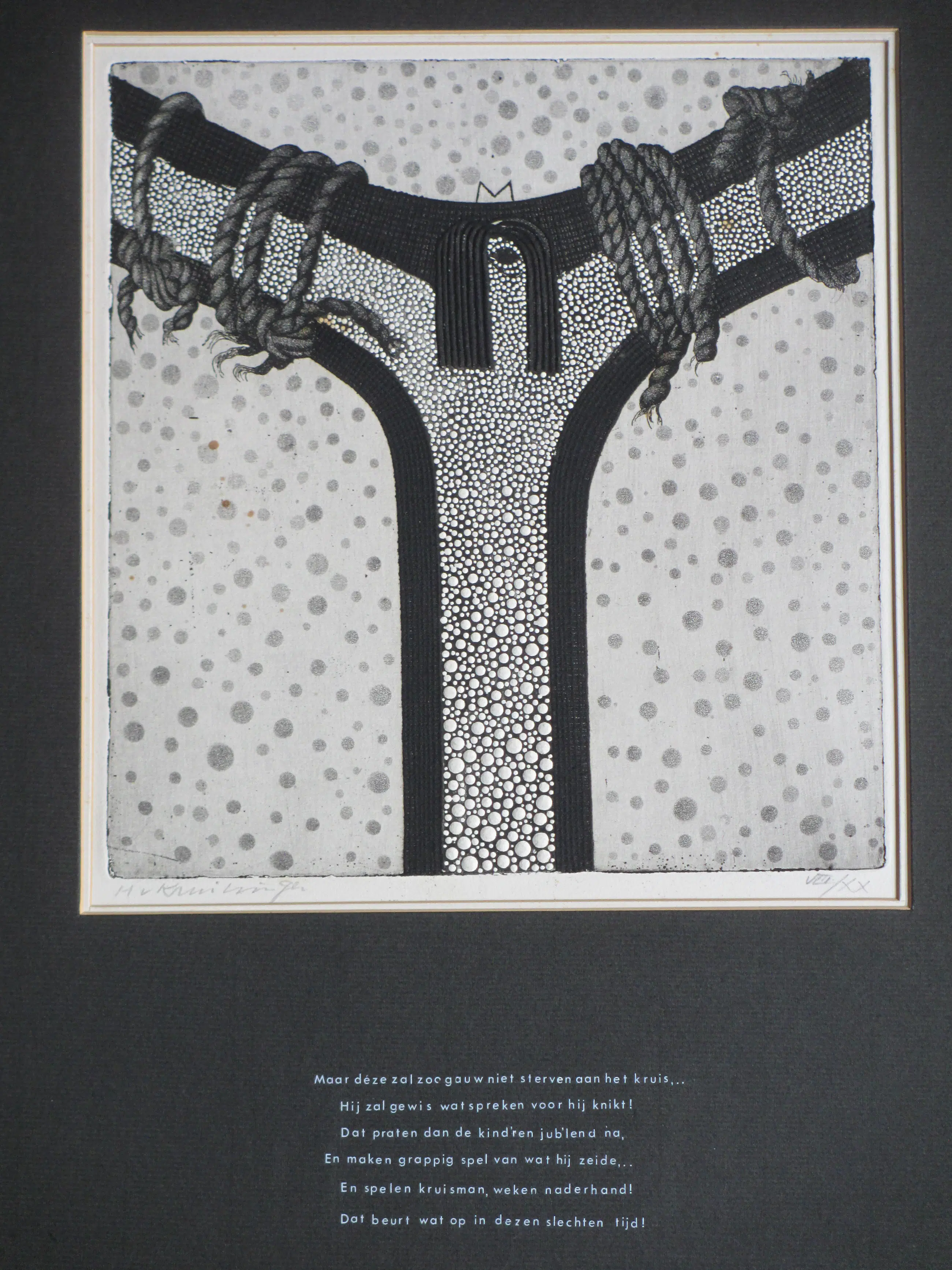 Zelden geziene ets door Harry van Kruiningen Fraaie diepdruk in reliëf Voorstelling van een figuur aan het kruis Ets onder passe-partout, beeldmaat 28x26, bladmaat 33x33, p.p.maat 63x48 Gesigneerd in potlood l.o.: 'H v Kruiningen' Romeins genummerd in potlood r.o.: 'VIII/XX' Met afgedrukt gedicht op zwart passe-partout
