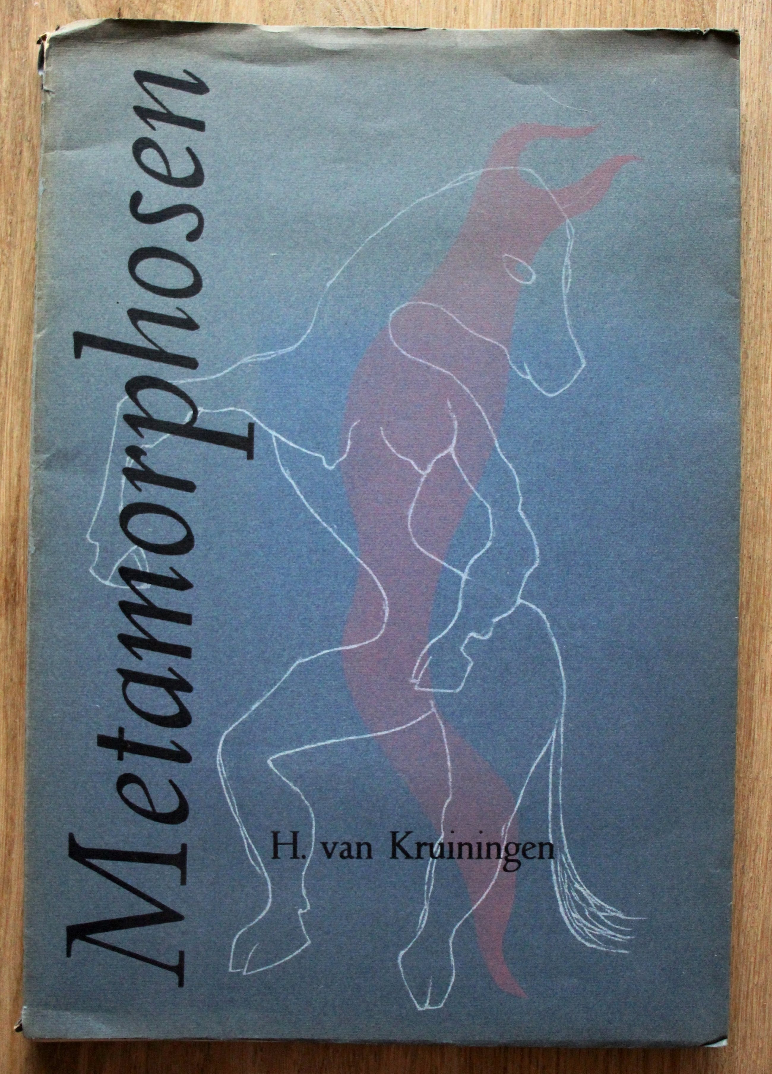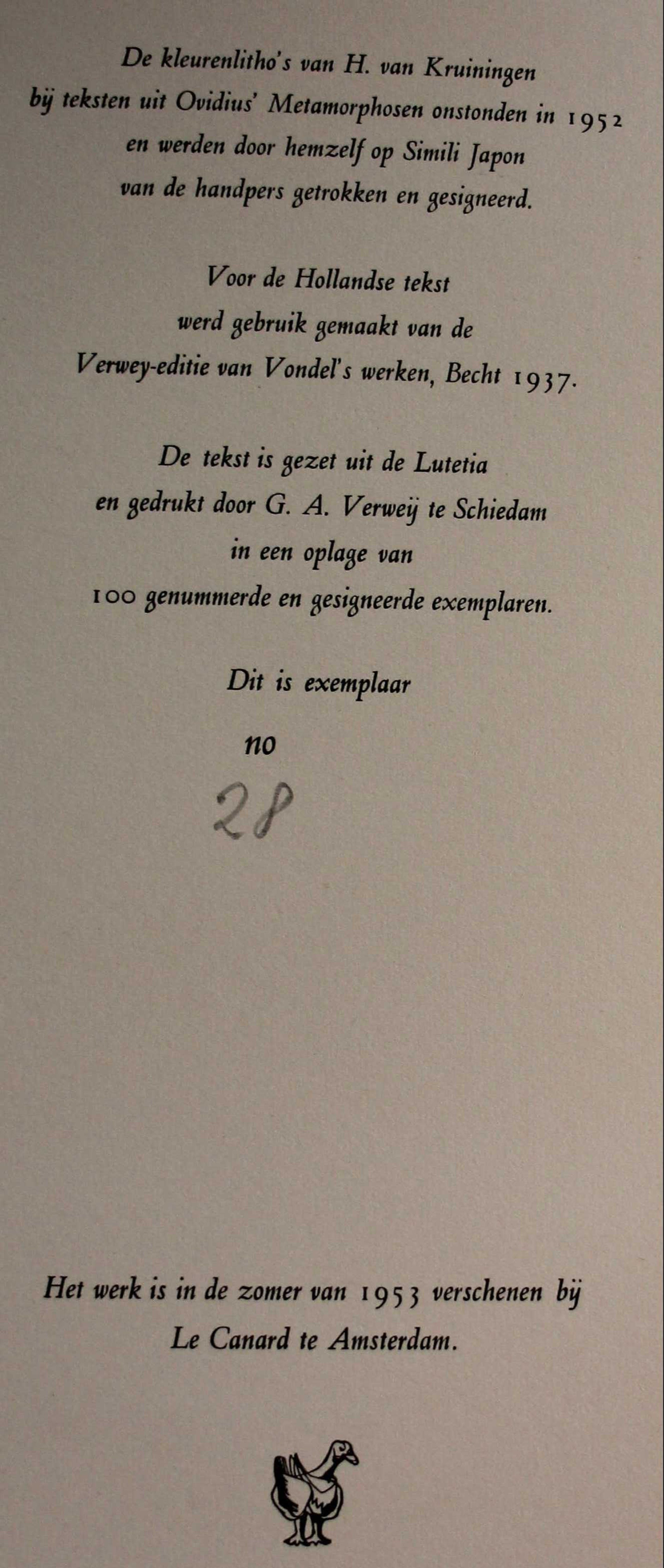 Map met 8 kleurenlitho’s van Harry van Kruiningen. Titel: Metamorphosen. Complete uitgave van "Bij de gedaanteverwisselingen van P. Ovidius Naso". Uitgegeven door Le Canard in Amsterdam in 1953. Nummer: 28/100. Afmetingen map: H40cm x b28cm. Afmetingen per voorstelling: H21cm x b16cm. Elke litho is handgesigneerd door van Kruiningen. De authenticiteit van het aangeboden werk wordt volledig gegarandeerd. Een certificaat van echtheid kan, op aanvraag, worden gemaild.
