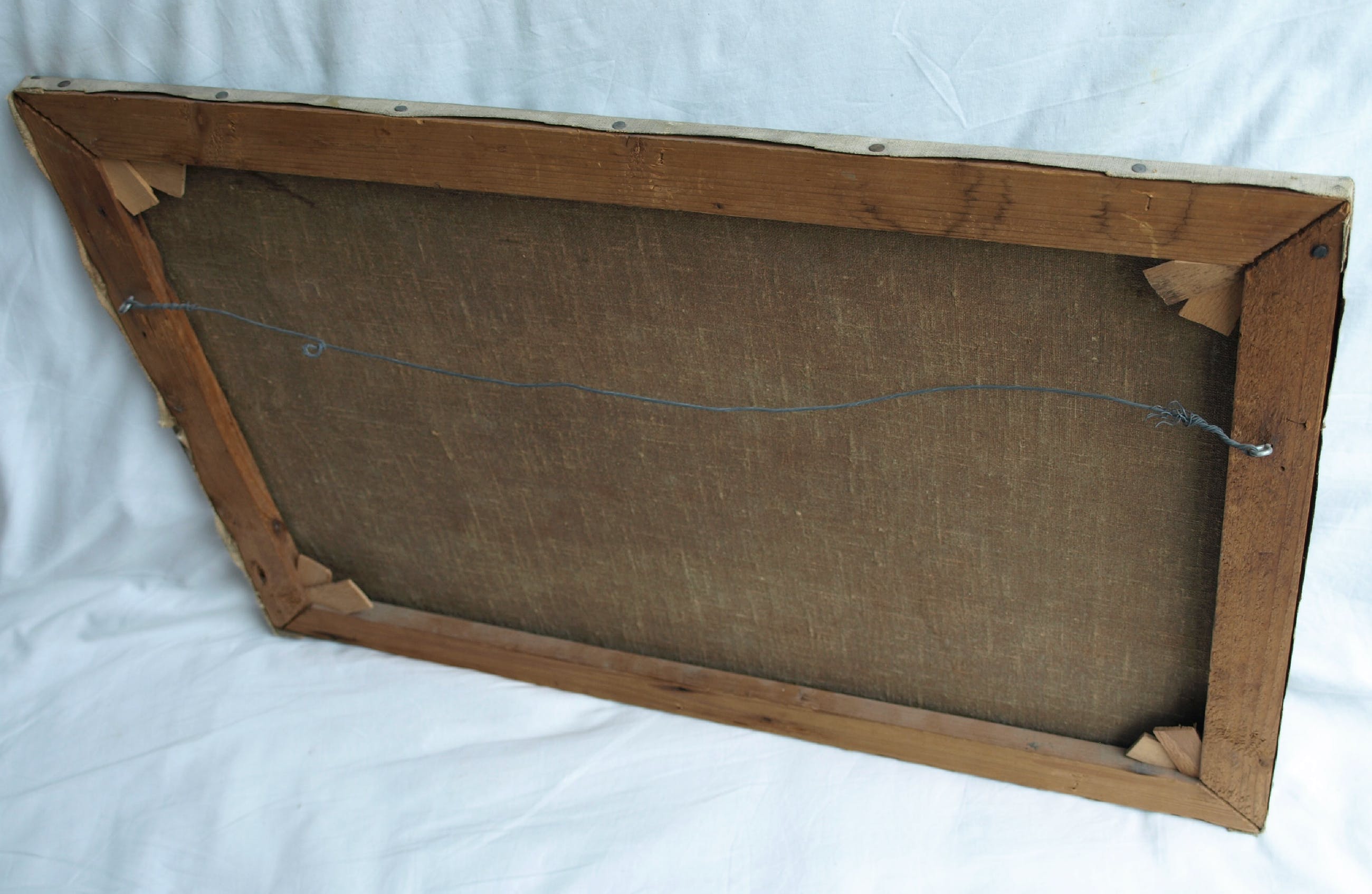 -Het werk is niet ingelijst en nooit ingelijst geweest. Er zaten wel ‘expositie-latjes’ om het spieraam, maar deze zijn verwijderd.