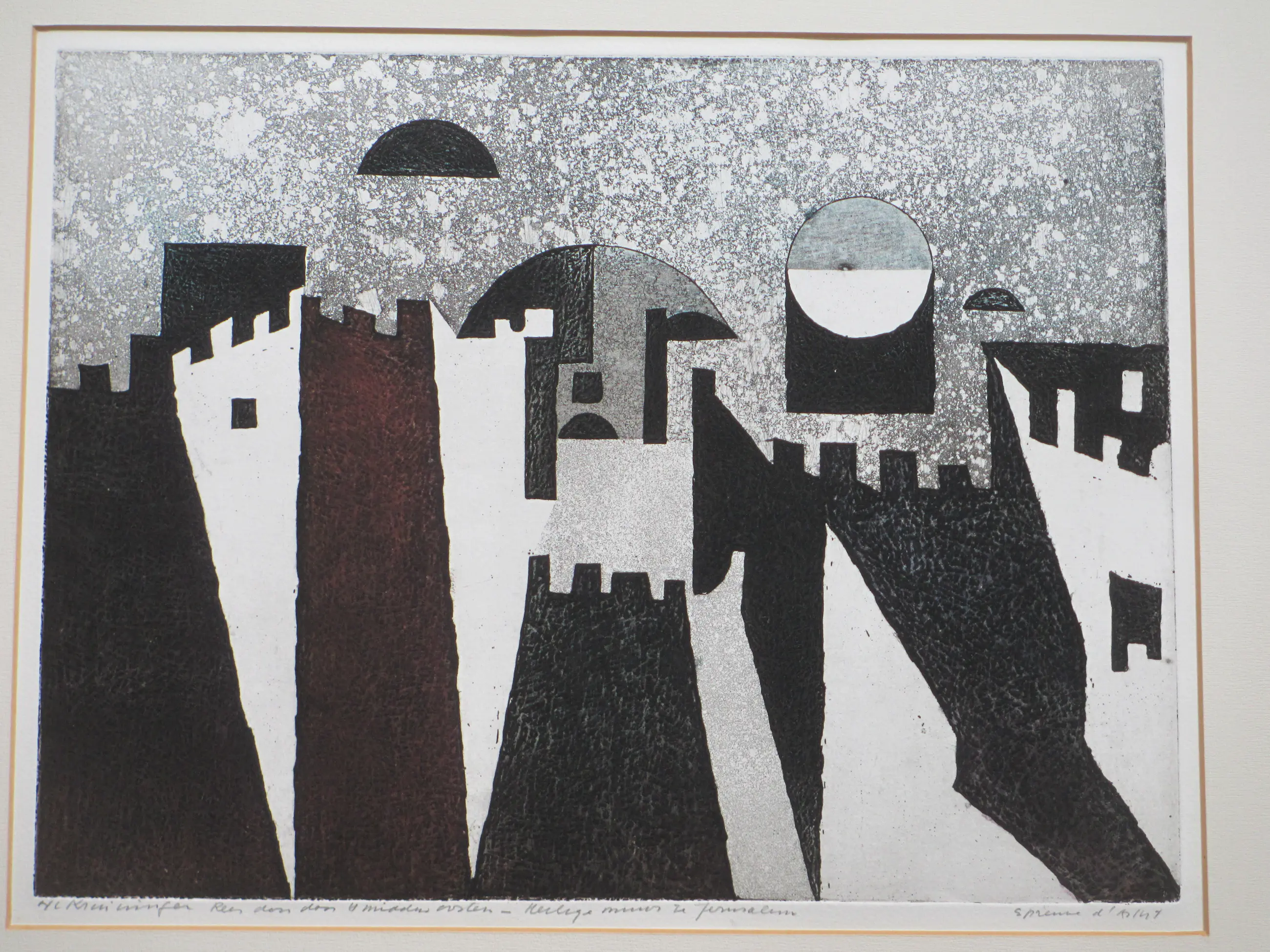 Karakteristieke en weinig geziene ets door Harry van Kruiningen Voorstelling van een reis door het Midden-oosten, met de Heilige Muur te Jeruzalem Losbladig onder passepartout, beeldmaat 30x39, p.p.maat 50x65 Gesigneerd in potlood l.o.: 'H v Kruiningen' Getiteld in potlood m.o. Annotatie in potlood r.o.: 'epreuve d'artist' Authenticiteit volledig gegarandeerd