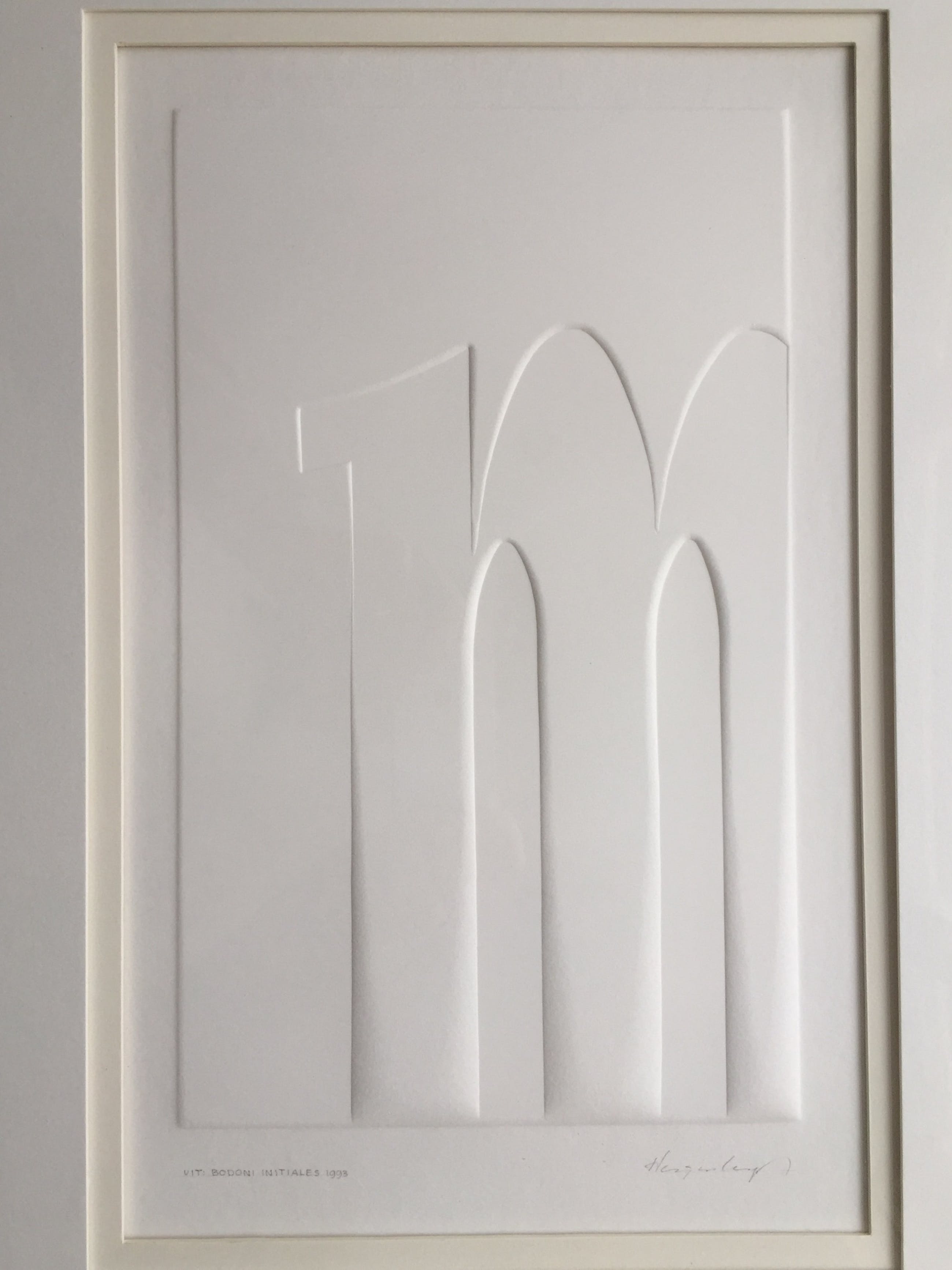 Na het in 1973 verschenen Groot Abecedarium - een serie prenten met letters als onderwerp - verschijnt in 1993 opnieuw een reeks letters, de BODONI INITIAlIS. Het gaat om acht volledige cassettes met alle letters uit het alfabet. Een van deze cassettes is opgenomen in de Koninklijke Bibliotheek. De kunstenaar heeft enkele prenten buiten de cassettes afgedrukt, waarvan deze letter M. Een schitterende reliëf prent van het uitzonderlijke niveau, waarvoor Harrie van Kuyk garant stond. Deze uitzonderlijke letter is ingelijst door de kunstenaar in een dunne aluminium lijst en verkeert in een zeer goede staat. Een buitenkans voor verzamelaars.