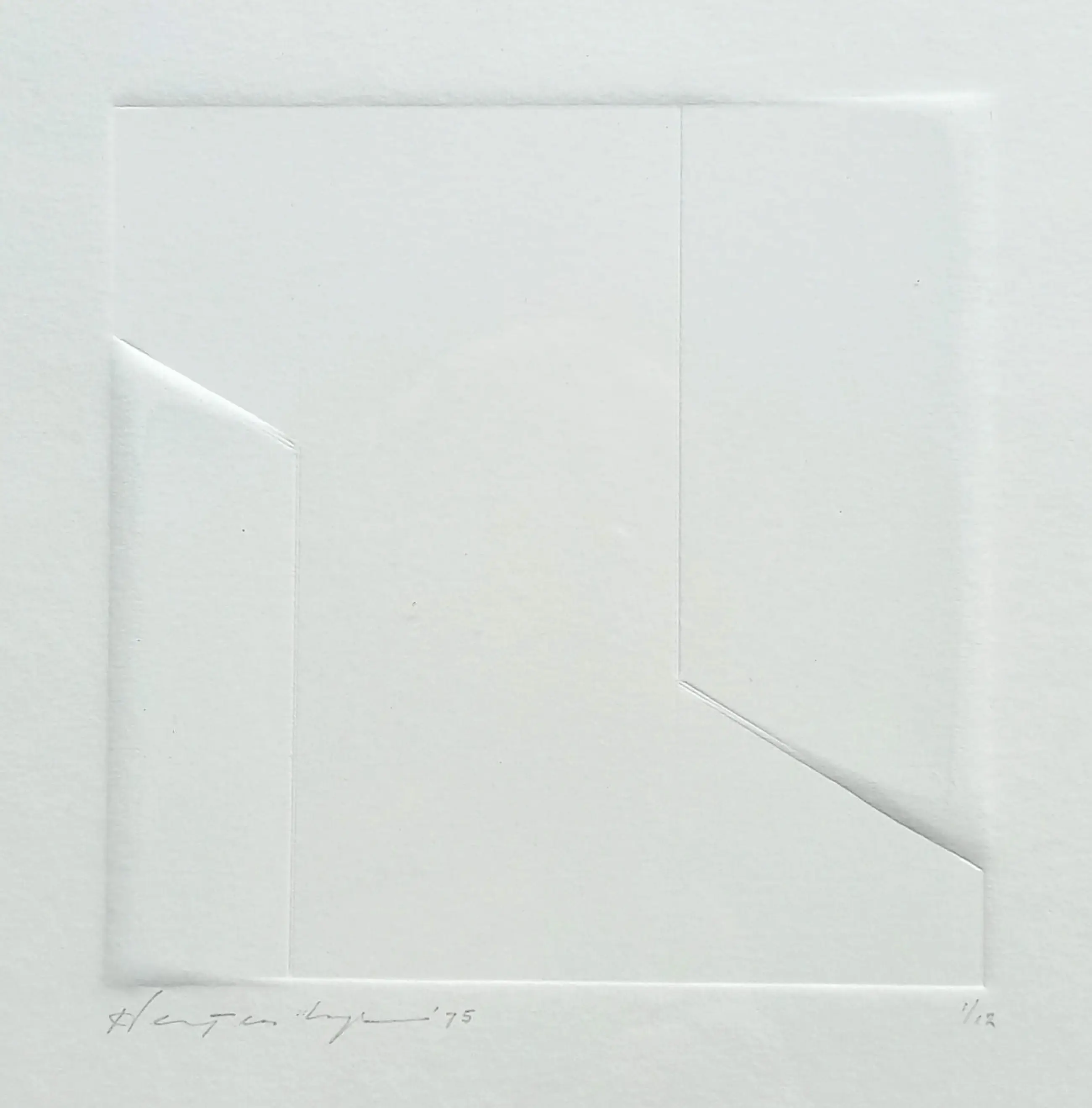 Mooi geometrisch werk van Harry van Kuyk, de uitvinder van de reliëfdruk.  Reliëfdruk in zeer dik papier, met potlood gesigneerd, gedateerd (1975) en genummerd (1-12).  In zilverkleurige lijst, achter glas.  In zeer goede conditie.  Herkomst: Galerie Asselijn, Amsterdam.