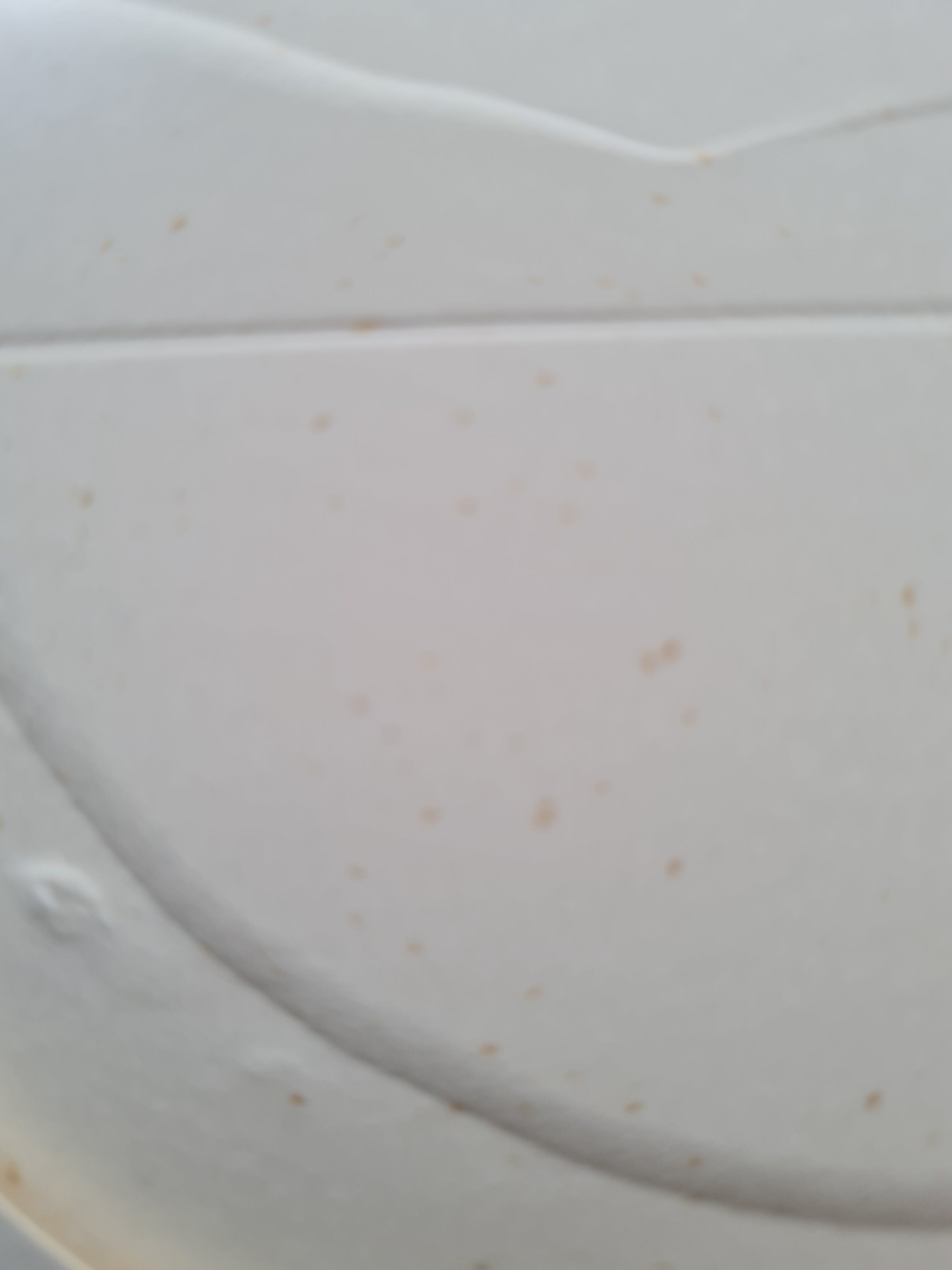 Licht vergeeld, een klein 'blutsje' en wat kleine bruine vlekjes. Zie foto.