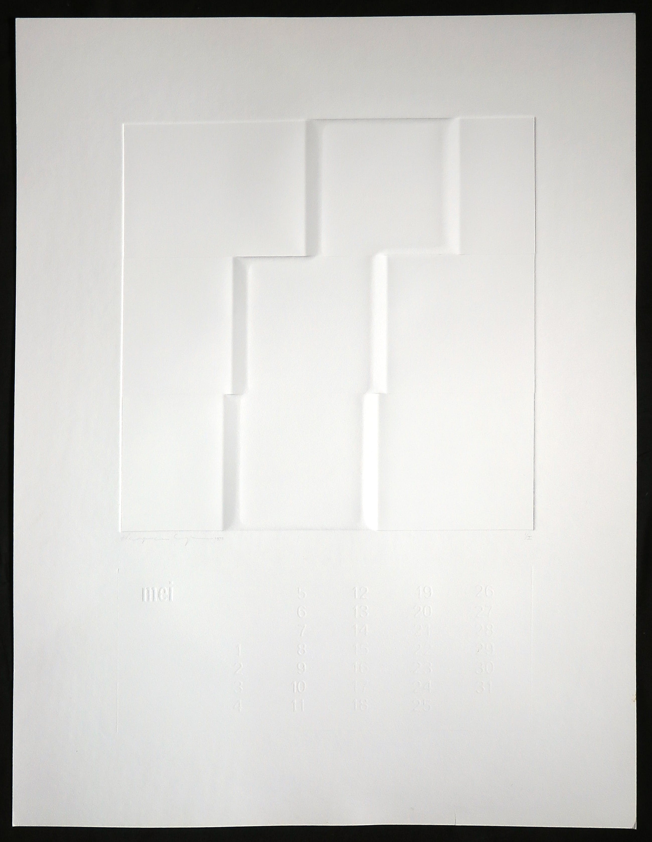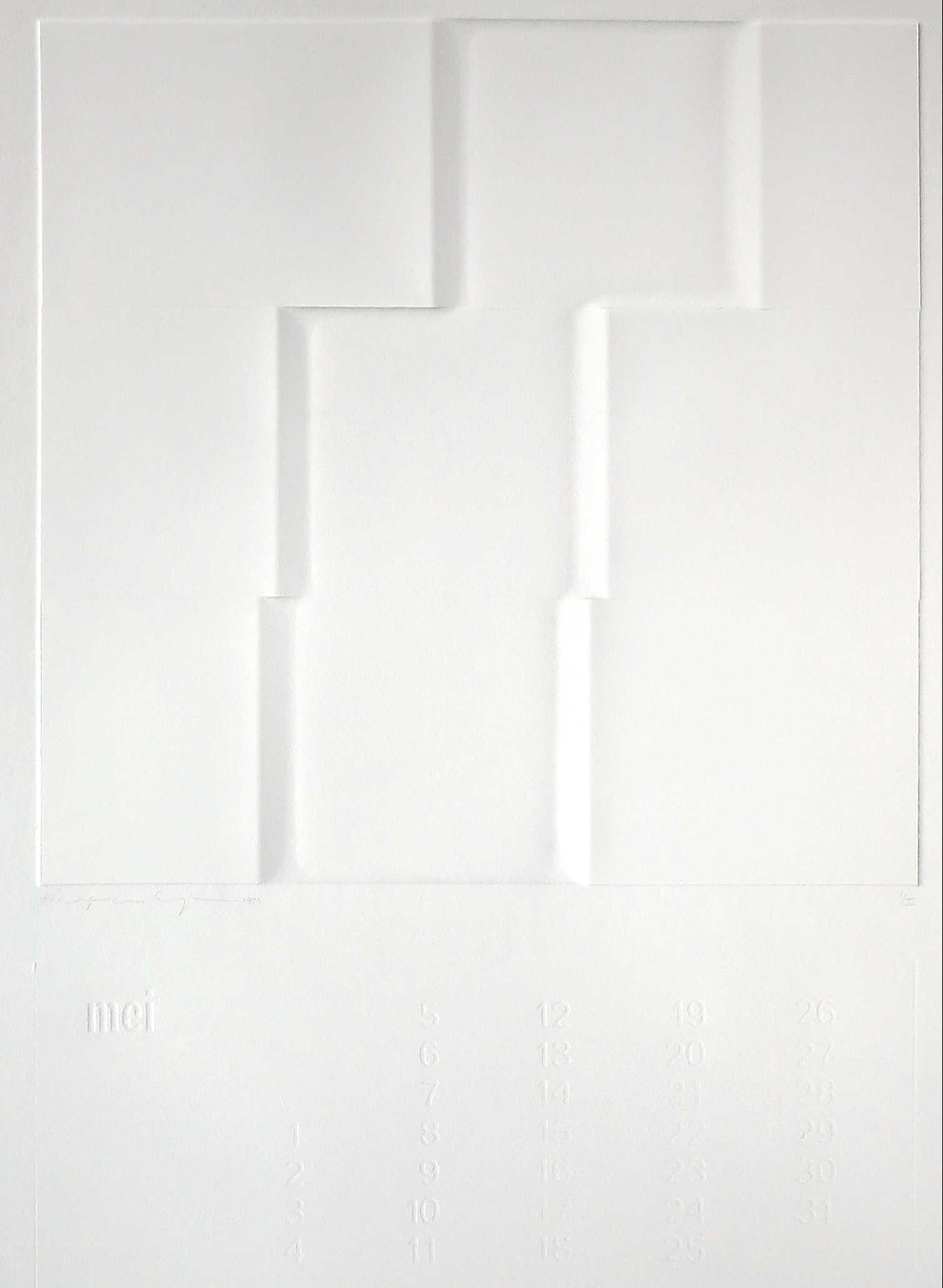 Mooie reliëfdruk gemaakt door kunstenaar Harry van Kuyk met onder de voorstelling een druk in het papier van de maand mei.