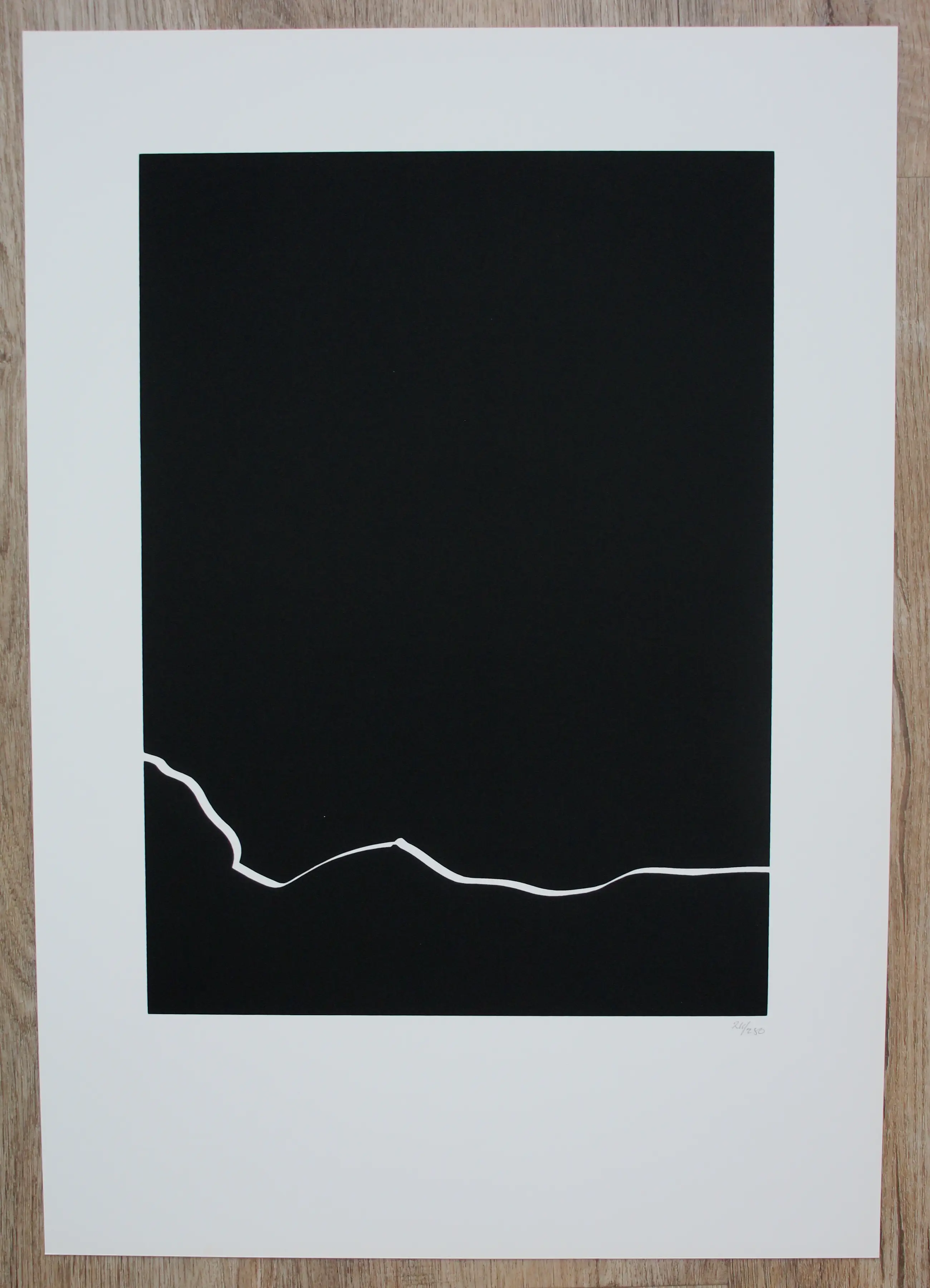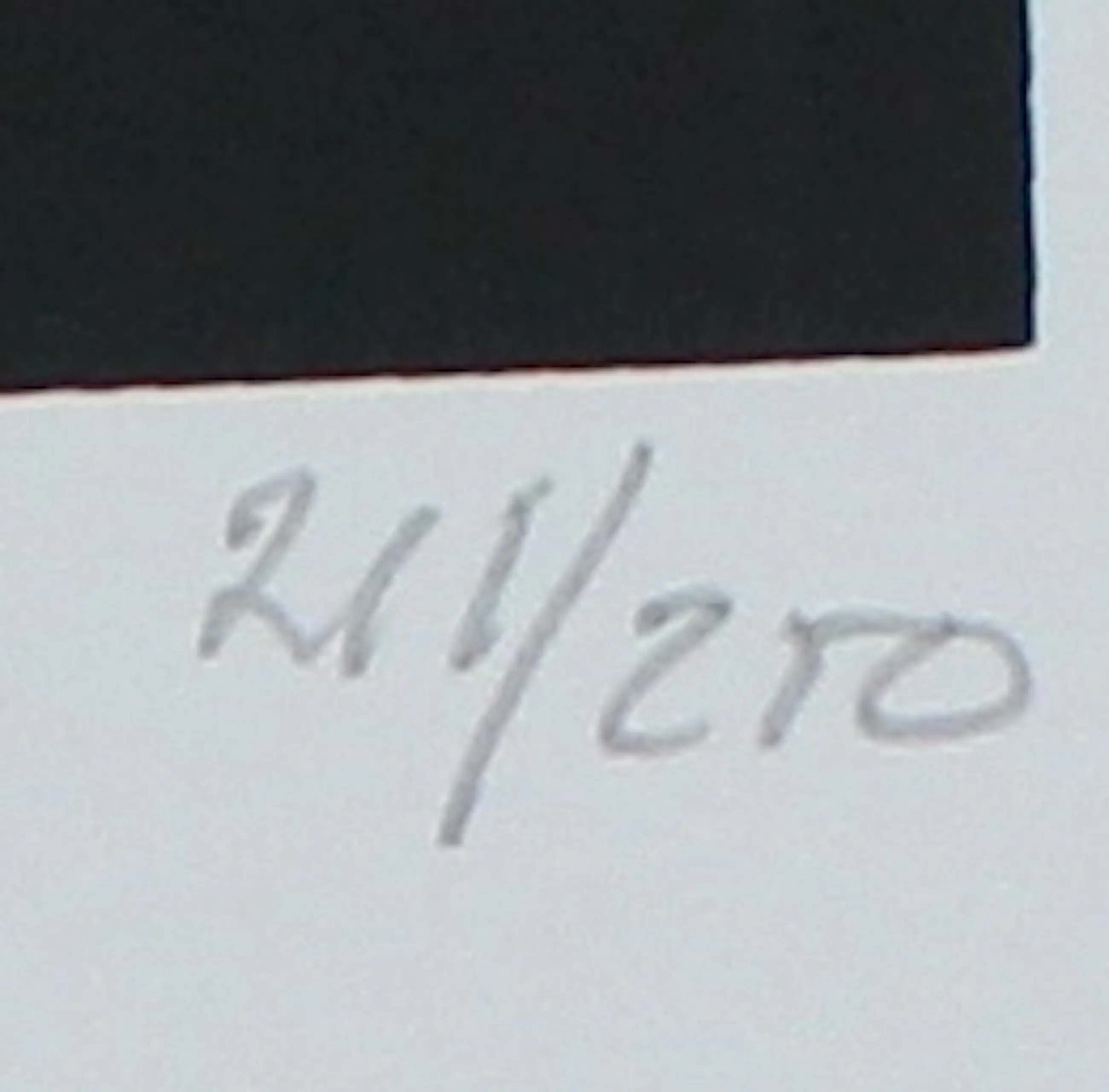 Zeefdruk van Harry van Kuyk. De map 'Grafinu - Harry van Kuyk' met 24 zeefdrukken verscheen in 1976. Afmetingen blad: H62.5 x b44cm. Het geheel werd in eigen atelier ontworpen en samengesteld. De band met stempel werd vervaardigd door boekbinderij van der Heijden. De zeefdrukken zijn gedrukt in het bedrijf van Midoscreen in een oplage van 250. Dit is nummer 211/250. De zeefdrukken zijn afzonderlijk genummerd maar niet gesigneerd. De map is gesigneerd op het achterste blad in de map (zie foto).