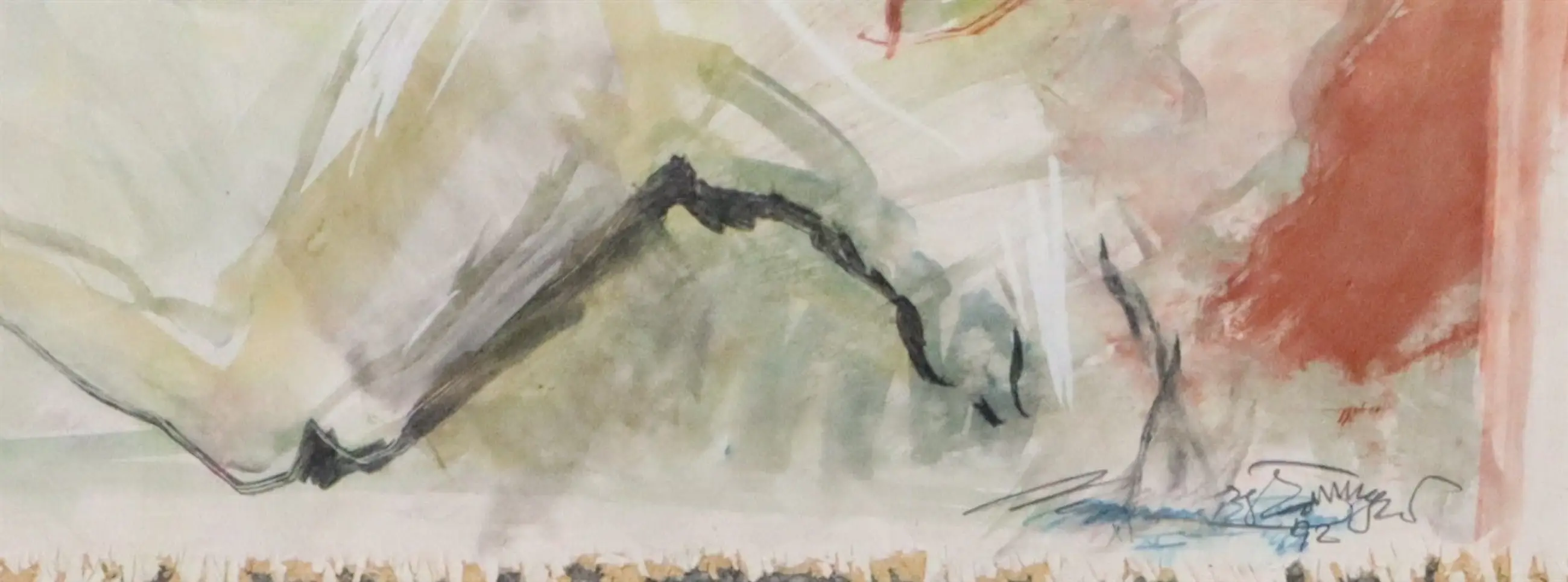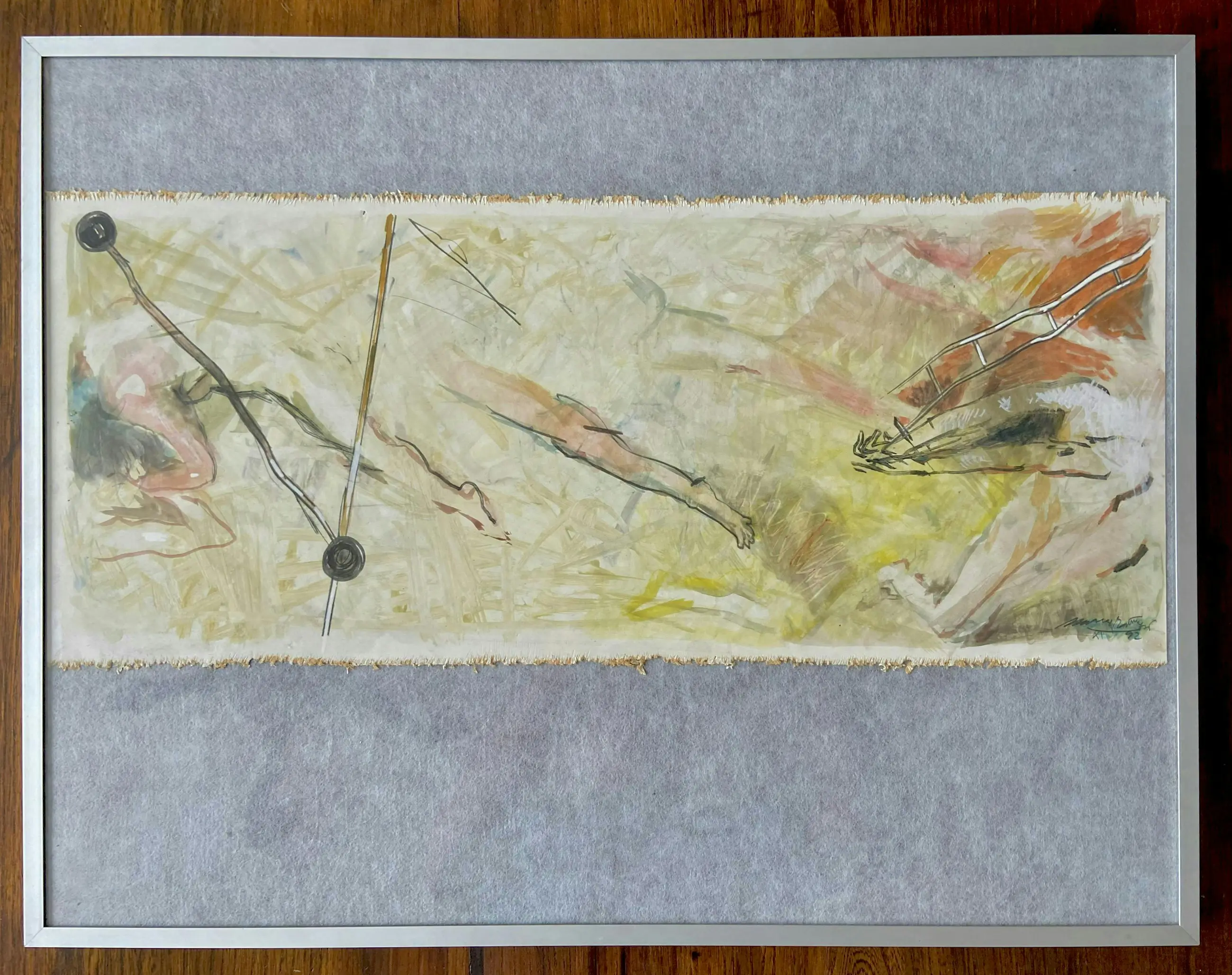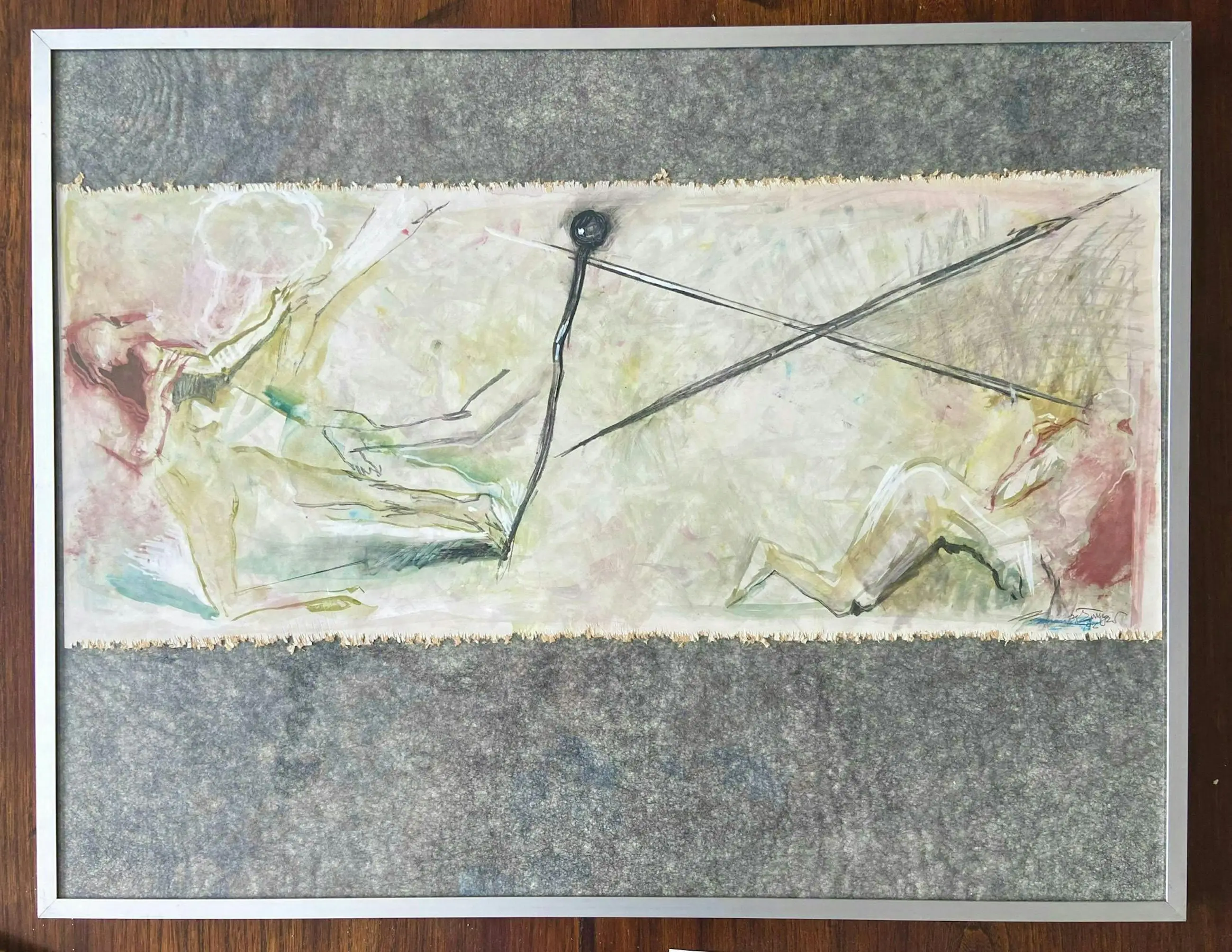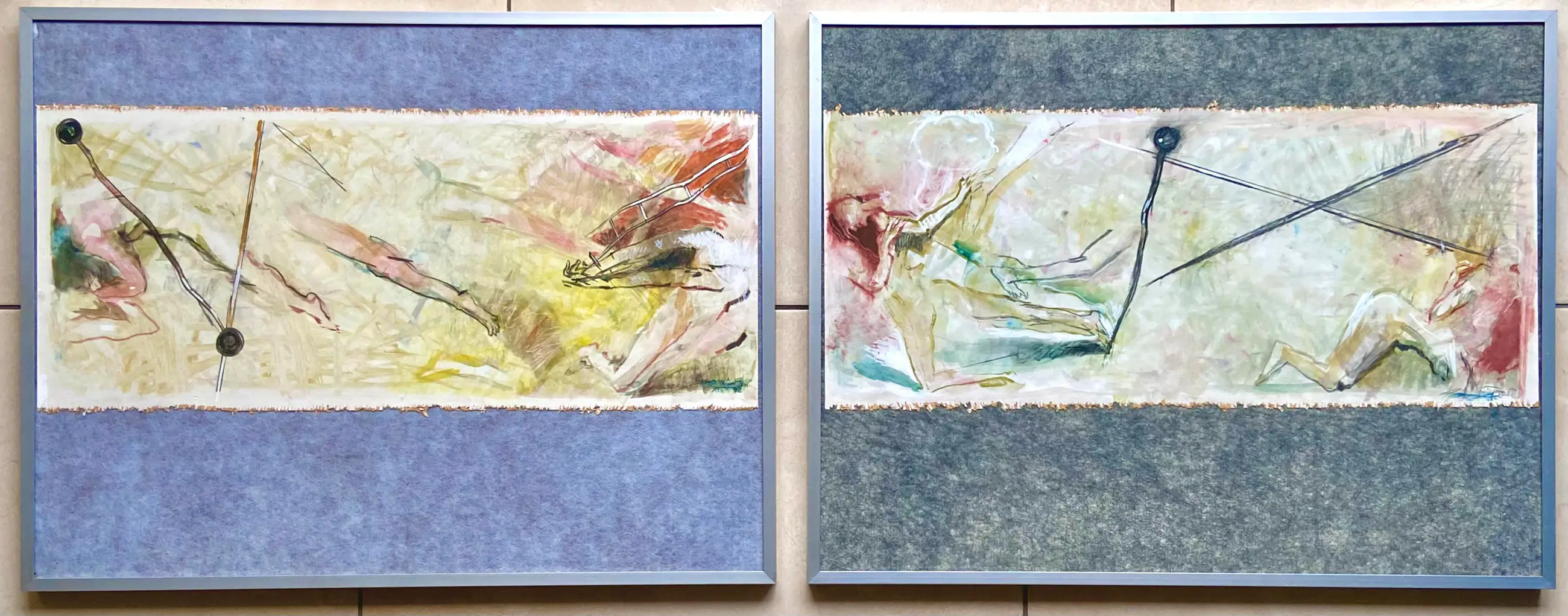 Zeer fraai tweeluik met abstracte voorstelling van figuren in beweging (nadering en benadering). Kleurrijk en vertelt een verhaal.