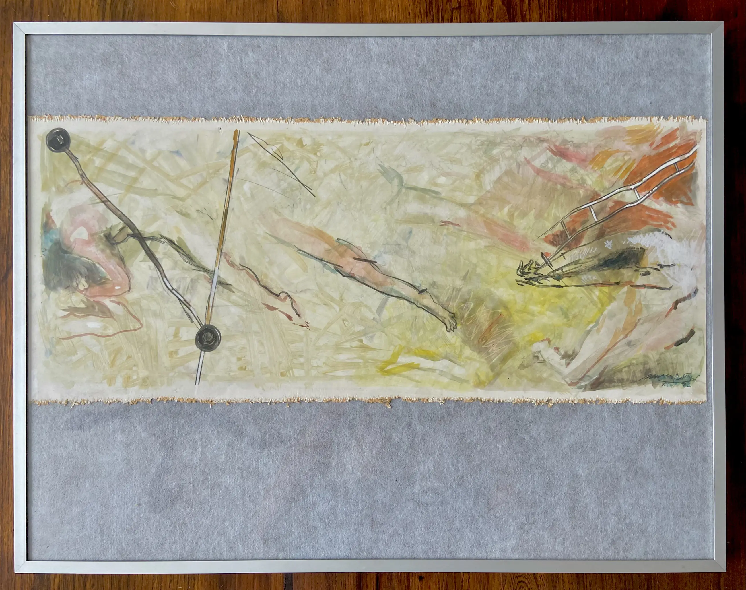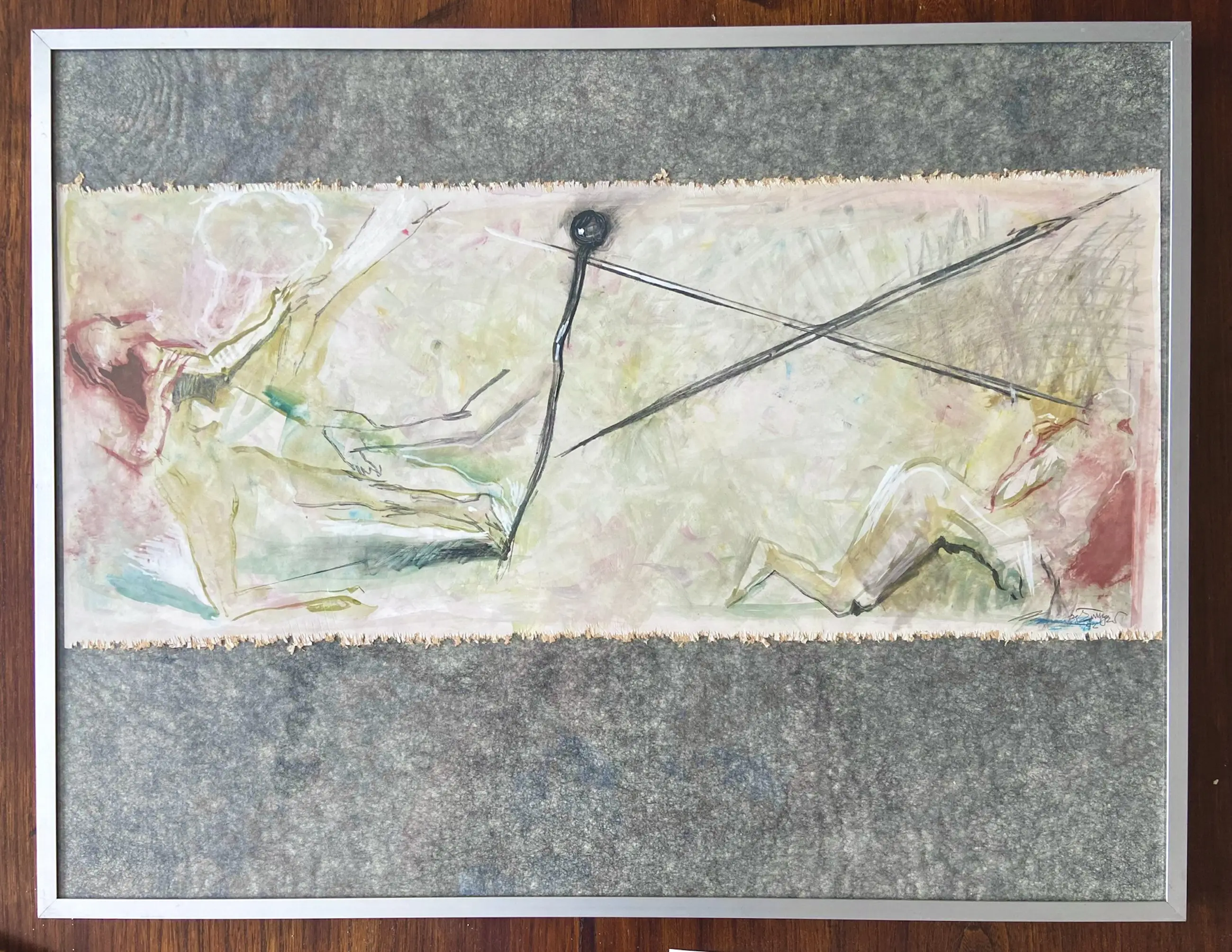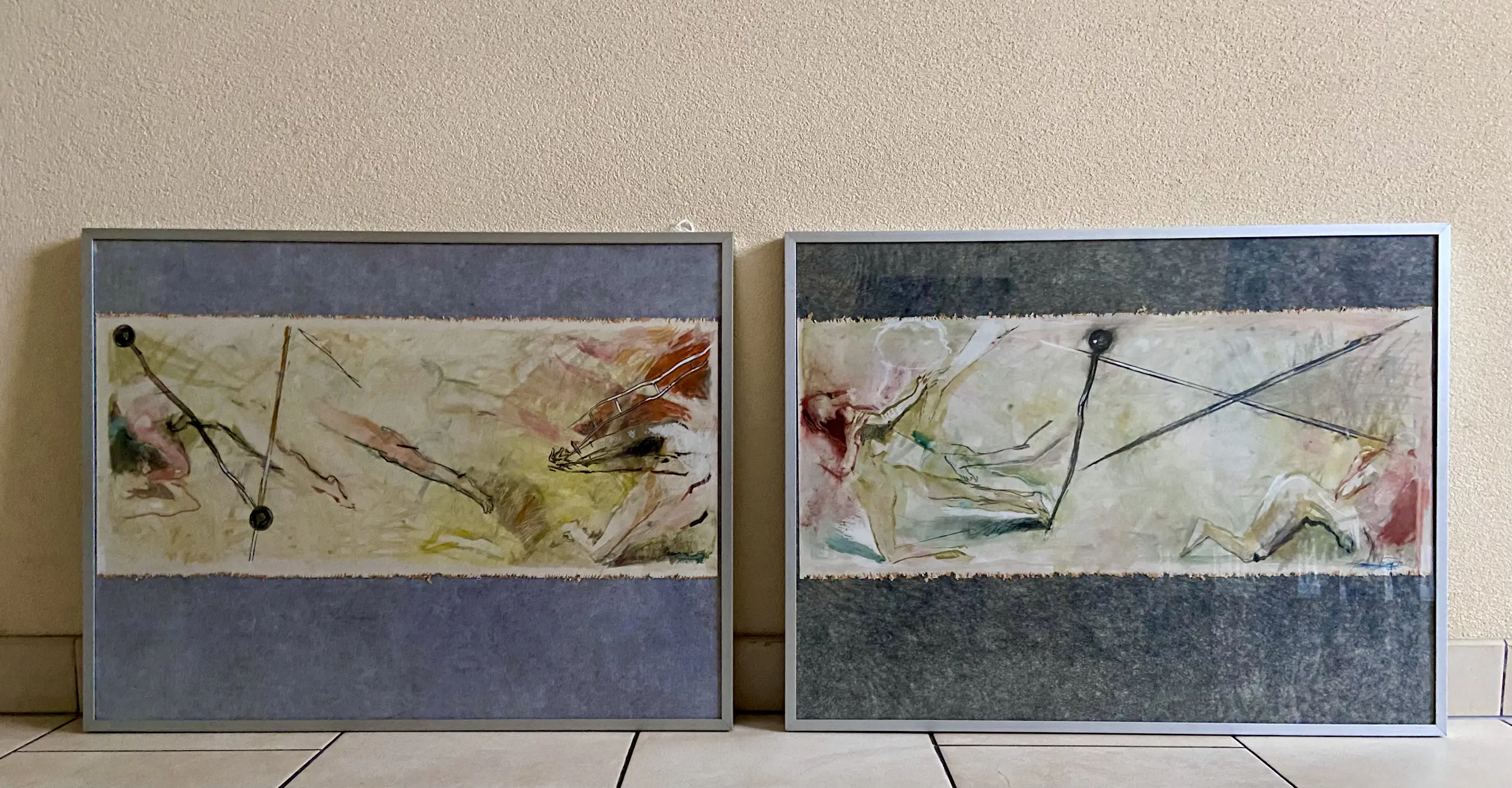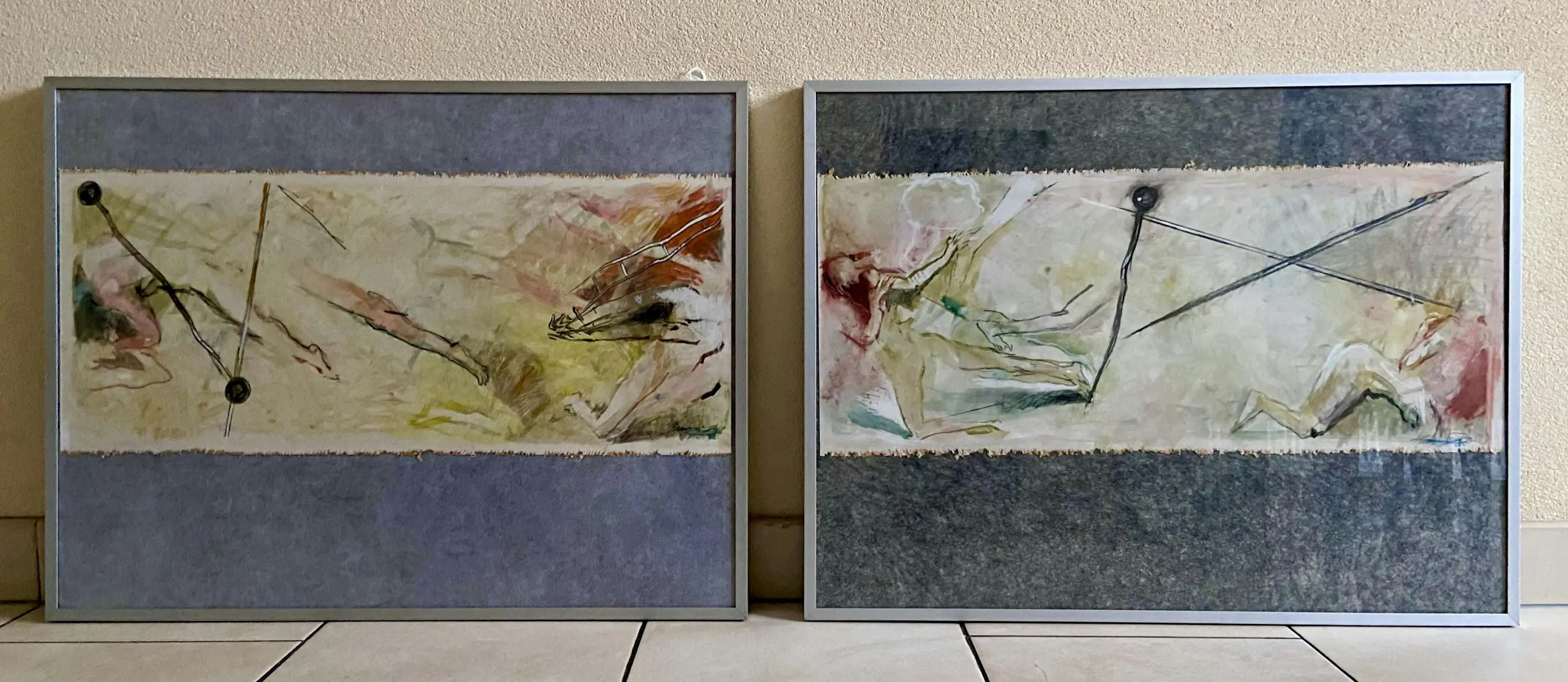 Zeer fraai tweeluik met abstracte voorstelling van figuren in beweging (nadering en benadering). Kleurrijk en vertelt een verhaal.