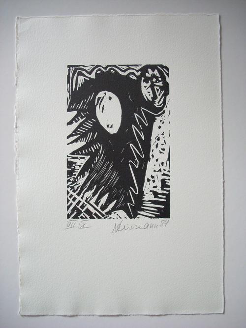 Original-Holzdruck von 1989, gedruckt auf festem Bütten mit gerissenem Rand (sehr schön), vom Künstler mit Bleistift handsigniert, datiert und nummeriert, hier Exemplar-Nr. VI / X. Format: 20 x 13 auf 39,5 x 26,5 cm. Sehr guter Erhaltungszustand. Weitere Arbeiten aus dieser Serie im Angebot. Frühe, für diese Zeit typische Arbeit dieses Künstlers. Verkauf aus einer Privatsammlung (Sammlungsauflösung), kein Umtausch, keine Gewähr. Beachten Sie bitte auch meine weiteren eART-Einlieferungen - es lohnt sich !
