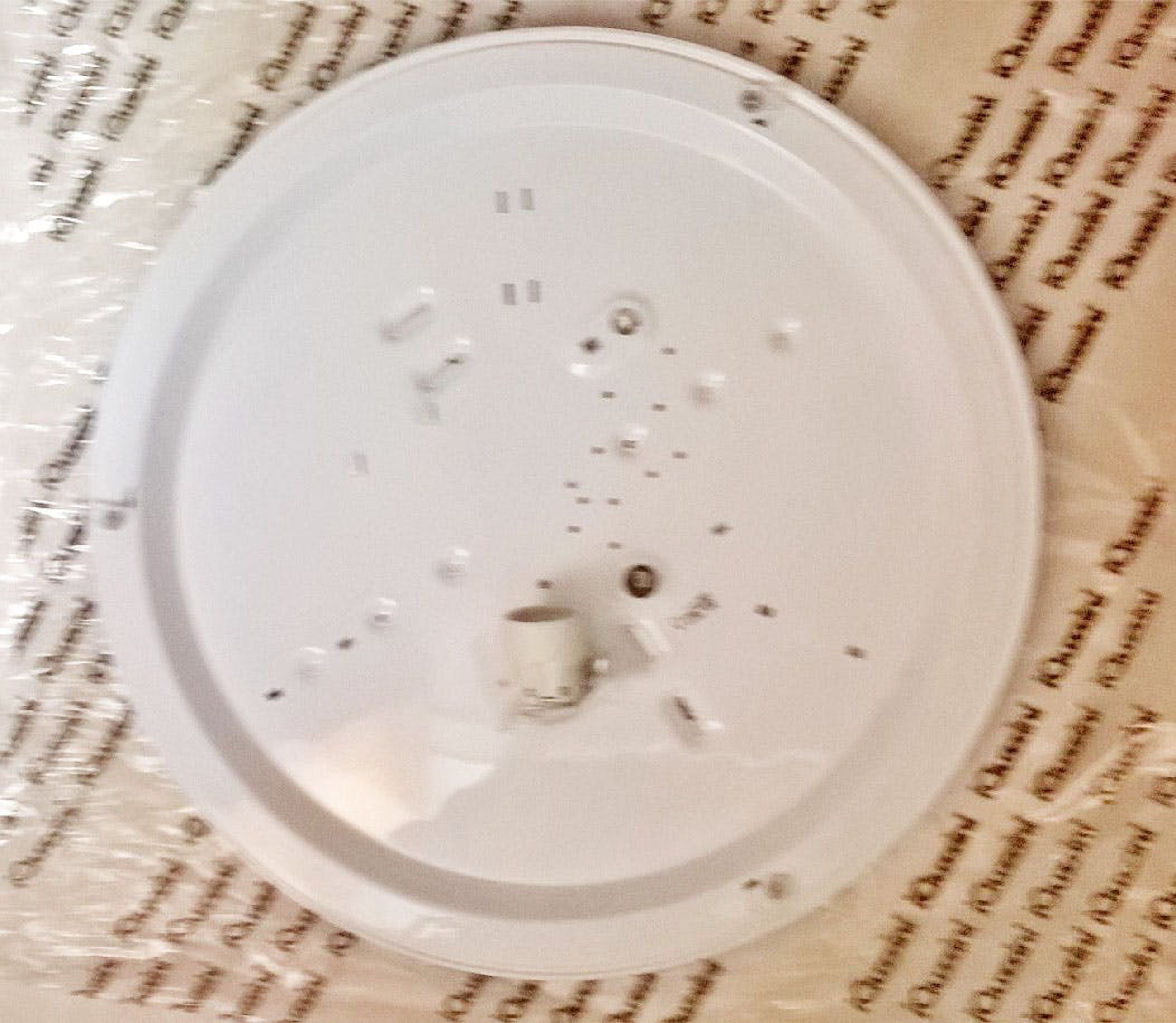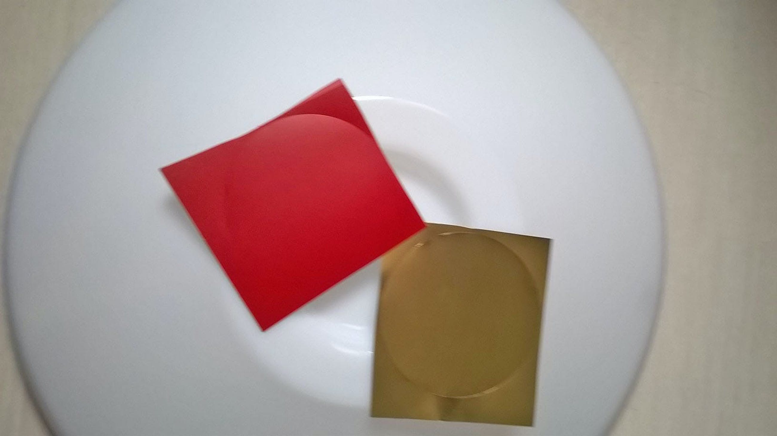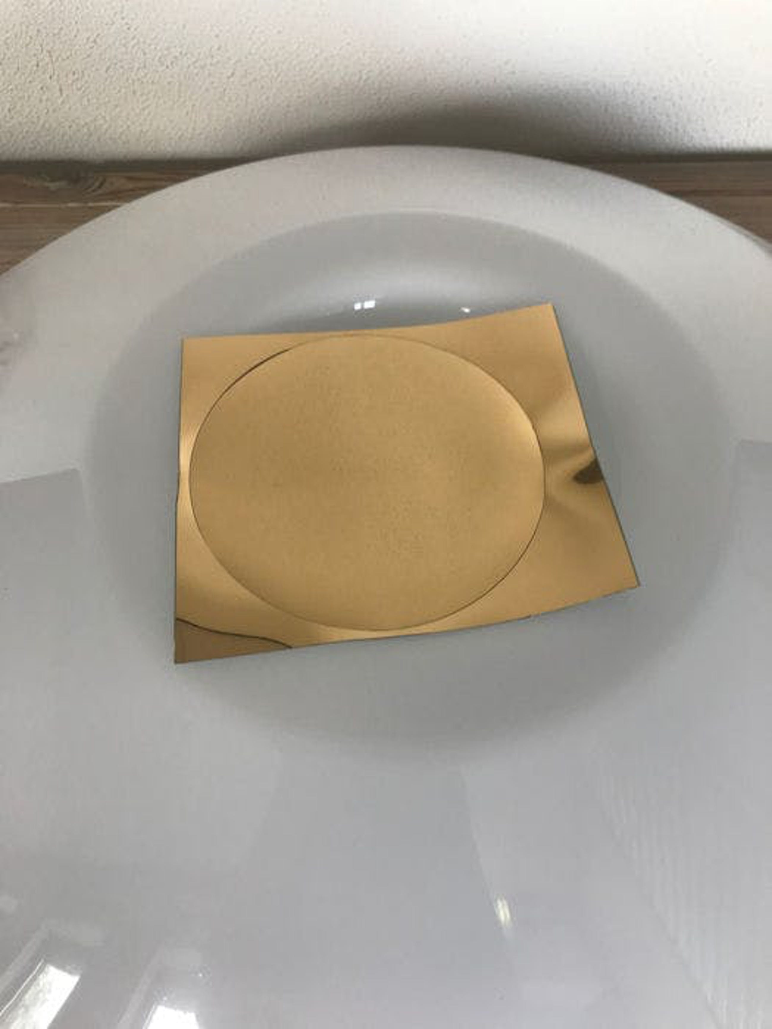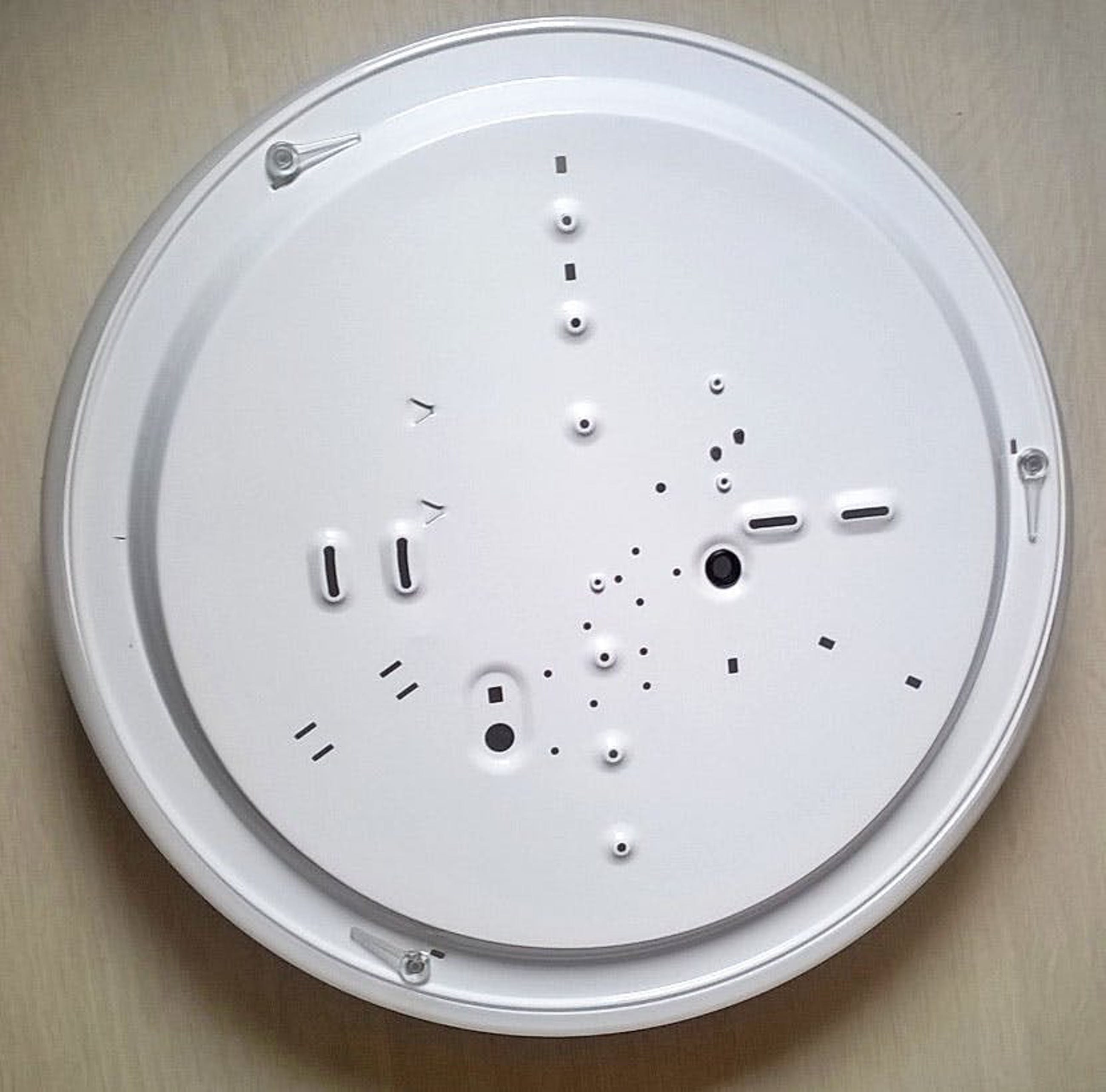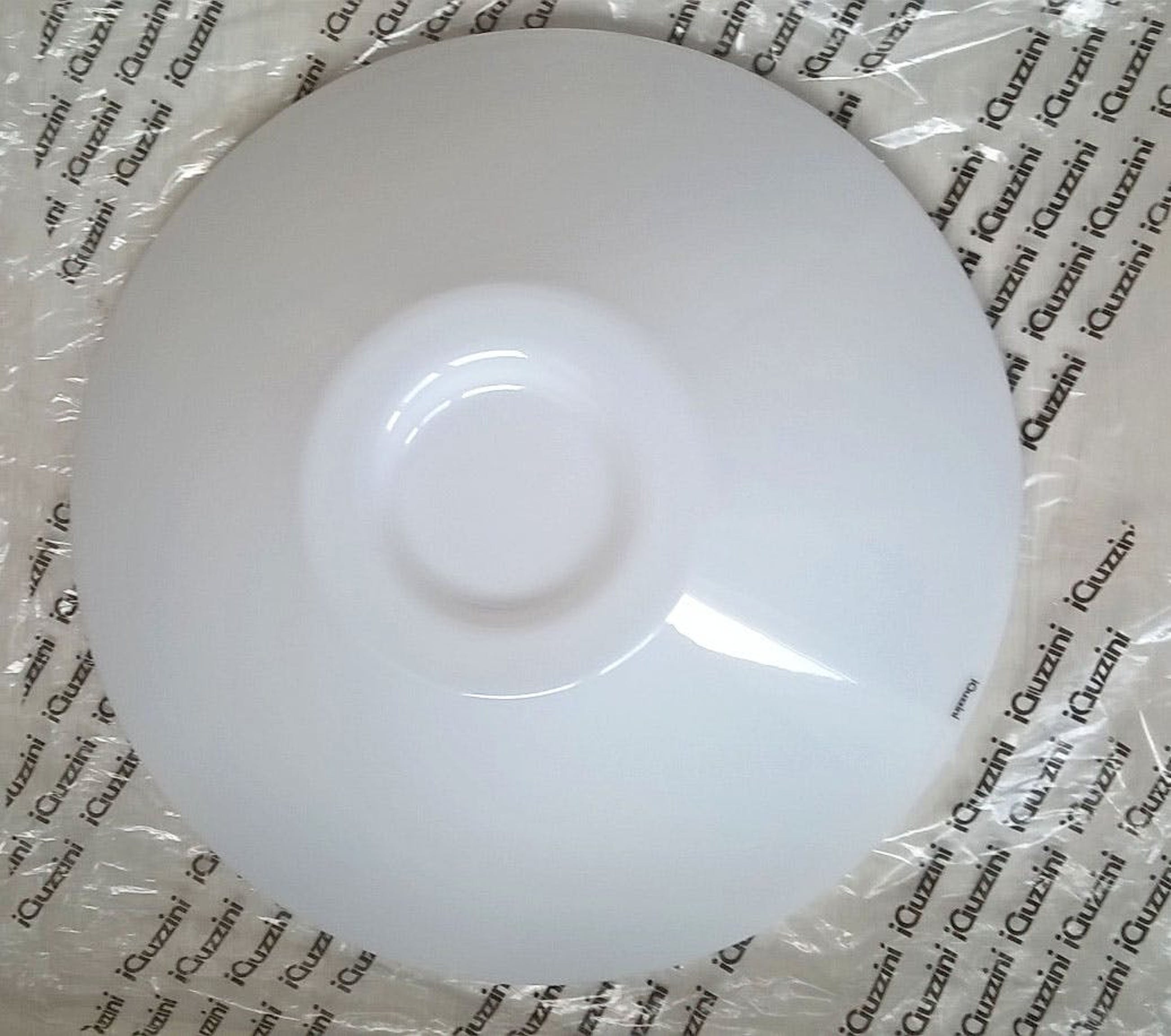 Grote iGuzzini plafondlamp uit de jaren zeventig/tachtig, plafondplaat metaal, kap kunststof. Nieuwstaat ( nooit gebruikt ). Erbij 2 stickers in de kleuren goud en rood die eventueel in het midden kunnen worden geplakt. Oorspronkelijk was er ook een zwarte en zilverkleurige sticker, maar die zijn verloren gegaan. Afmetingen: 52 cm diameter en 15 cm hoog.