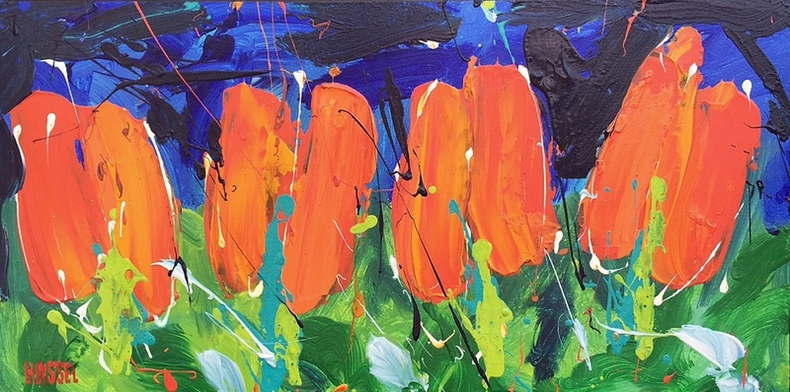 Origineel werk: acryl op doek. Formaat 60x30 cm. Gesigneerd linksonder en voorzien van tekst door Ad van Hassel op achterzijde.