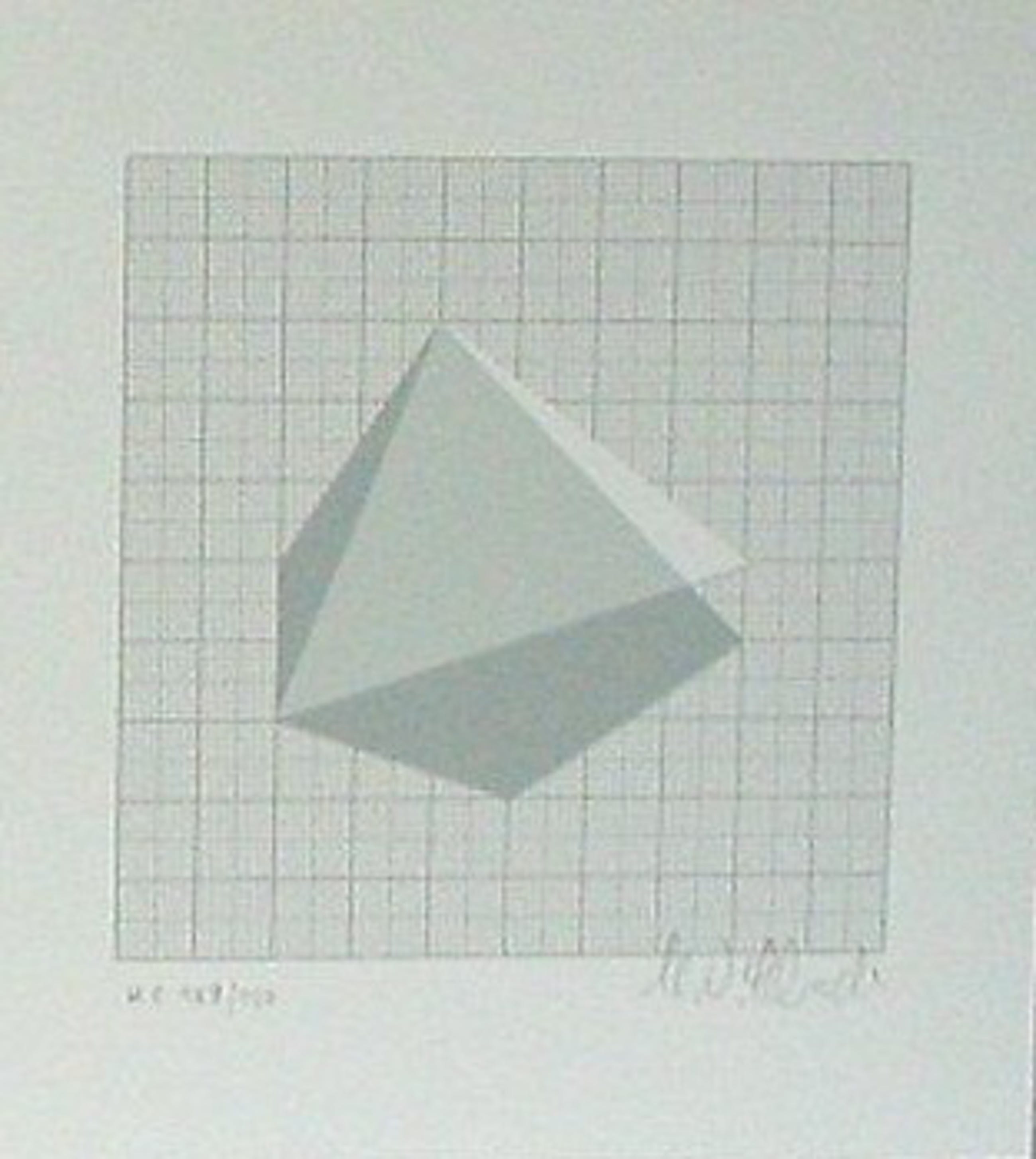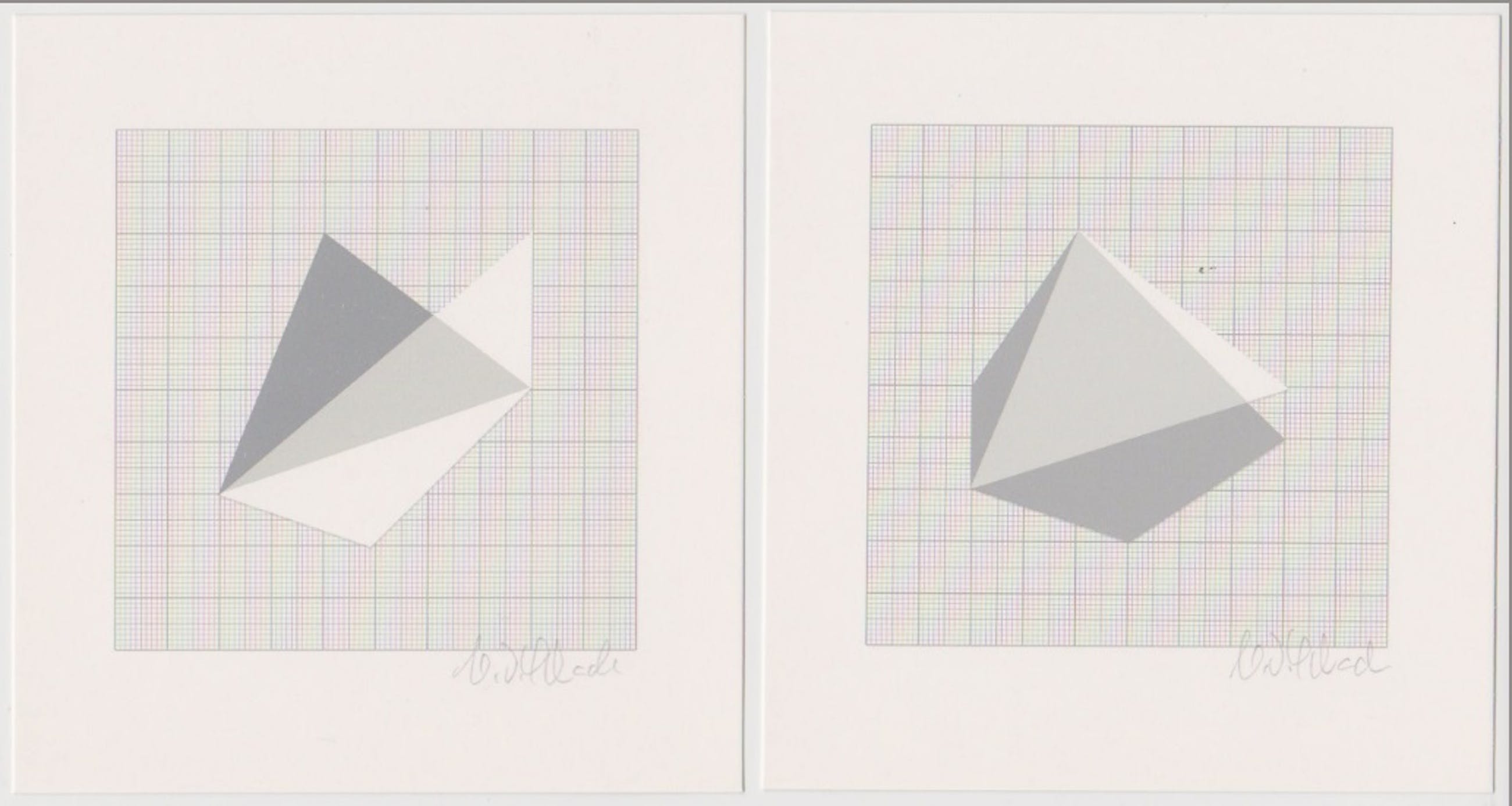 Twee fraaie handgesigneerde lithografien van H.D. Schrader. Titels: Geometrische Composities I en II. Afmetingen: 15 x 14 cm.