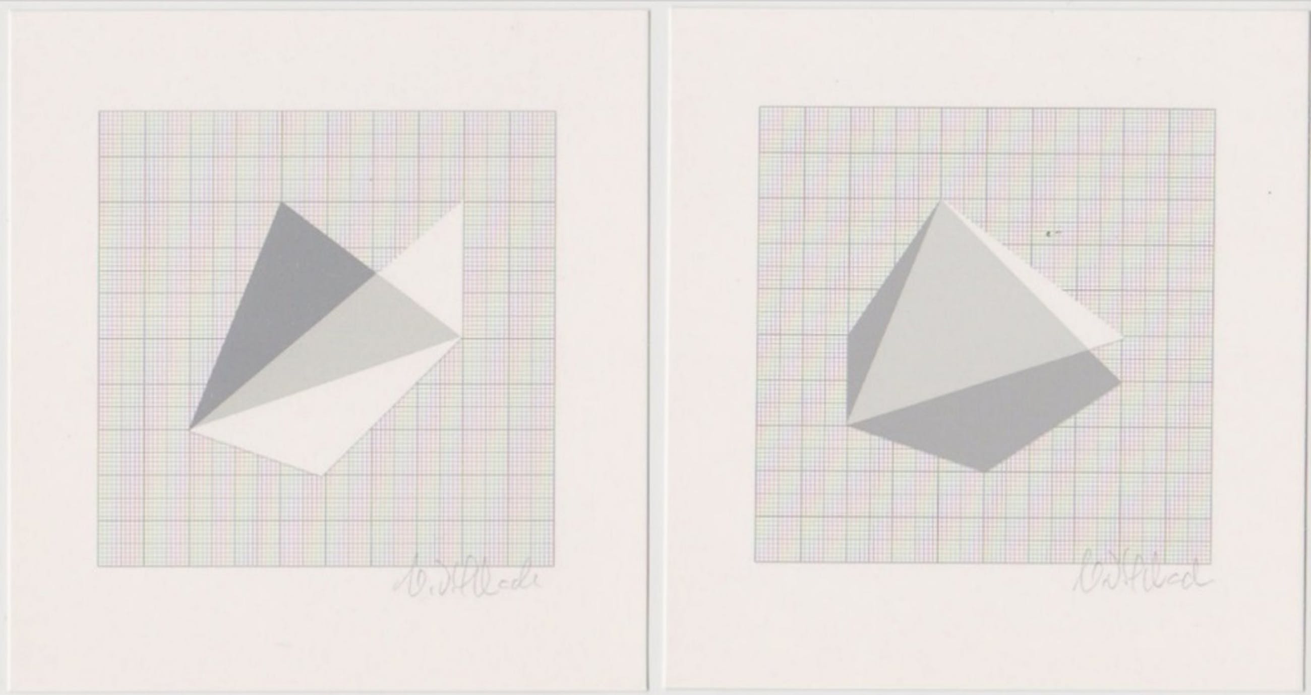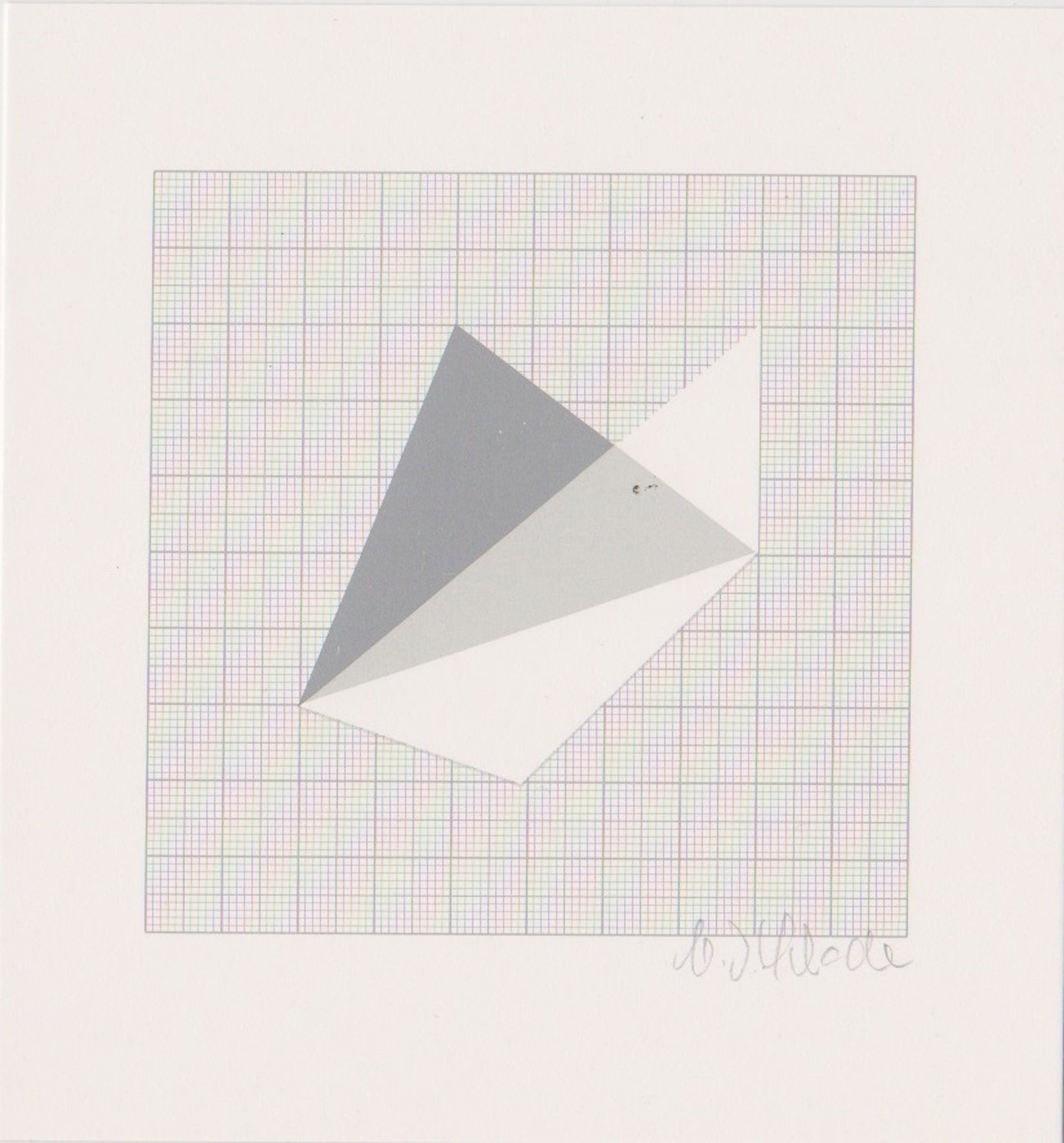 Twee fraaie handgesigneerde lithografien van H.D. Schrader. Titels: Geometrische Composities I en II. Afmetingen: 15 x 14 cm.