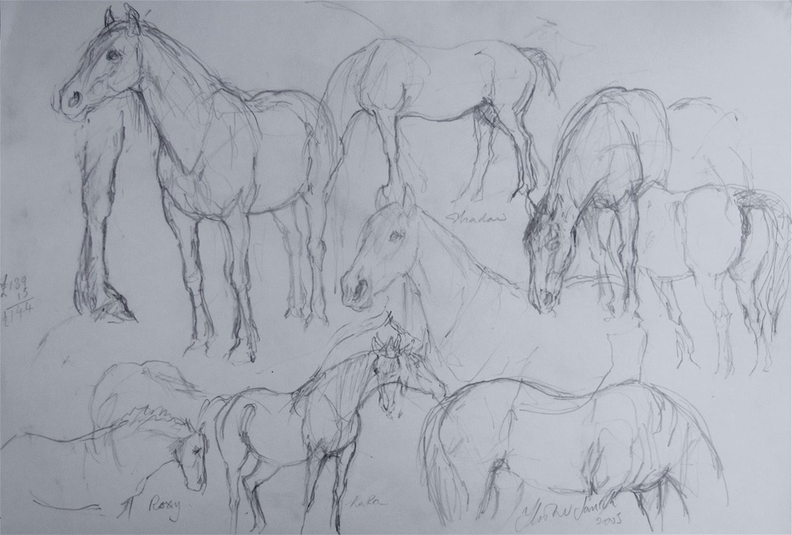 Op dit blad staan verschillende schetsontwerpen van haar beelden afgebeeld., 'Shadow', 'Roxy' en 'RaRa'.