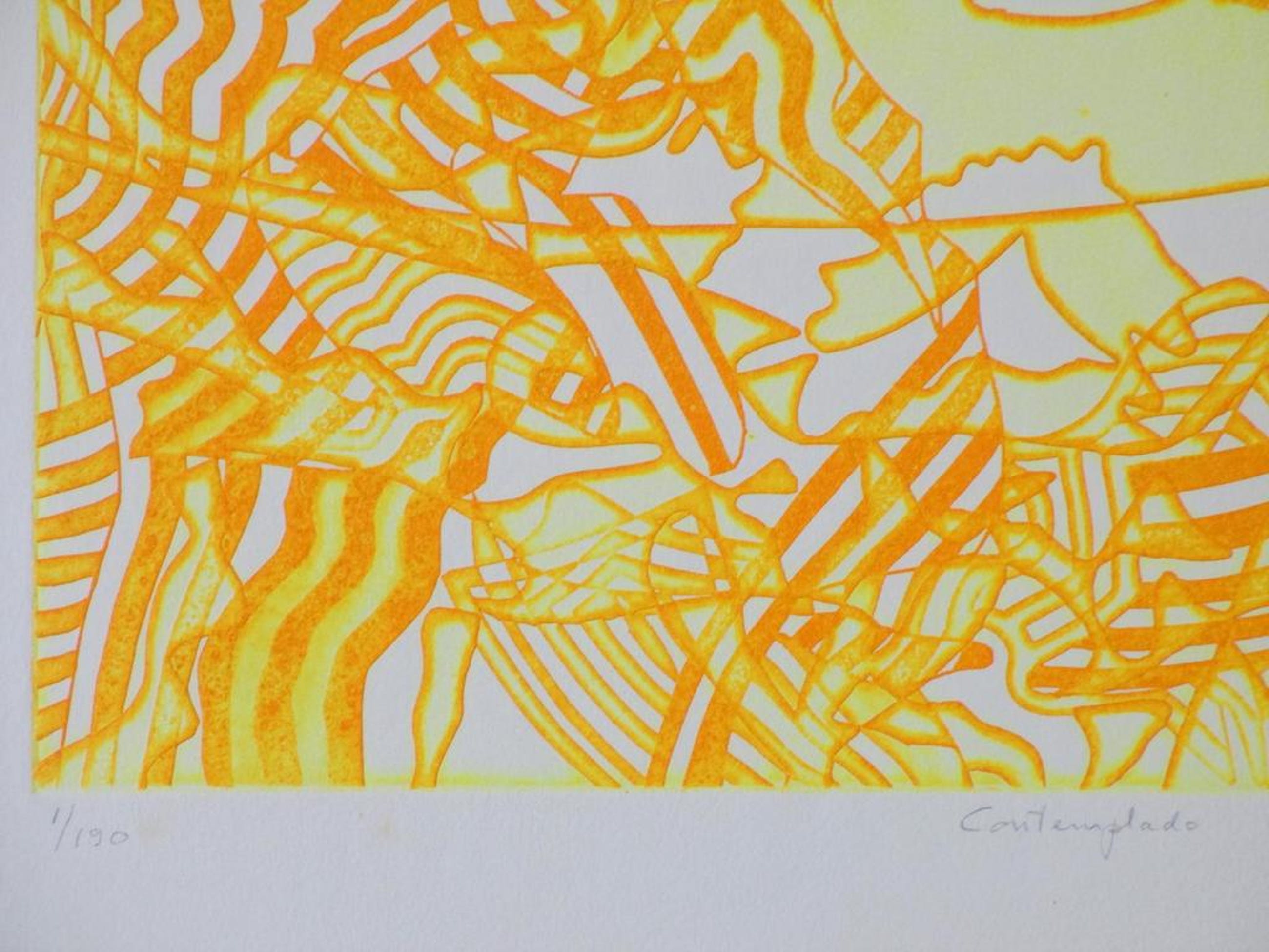 Voorstelling in geel reliëf, getiteld 'Contemplado'.
