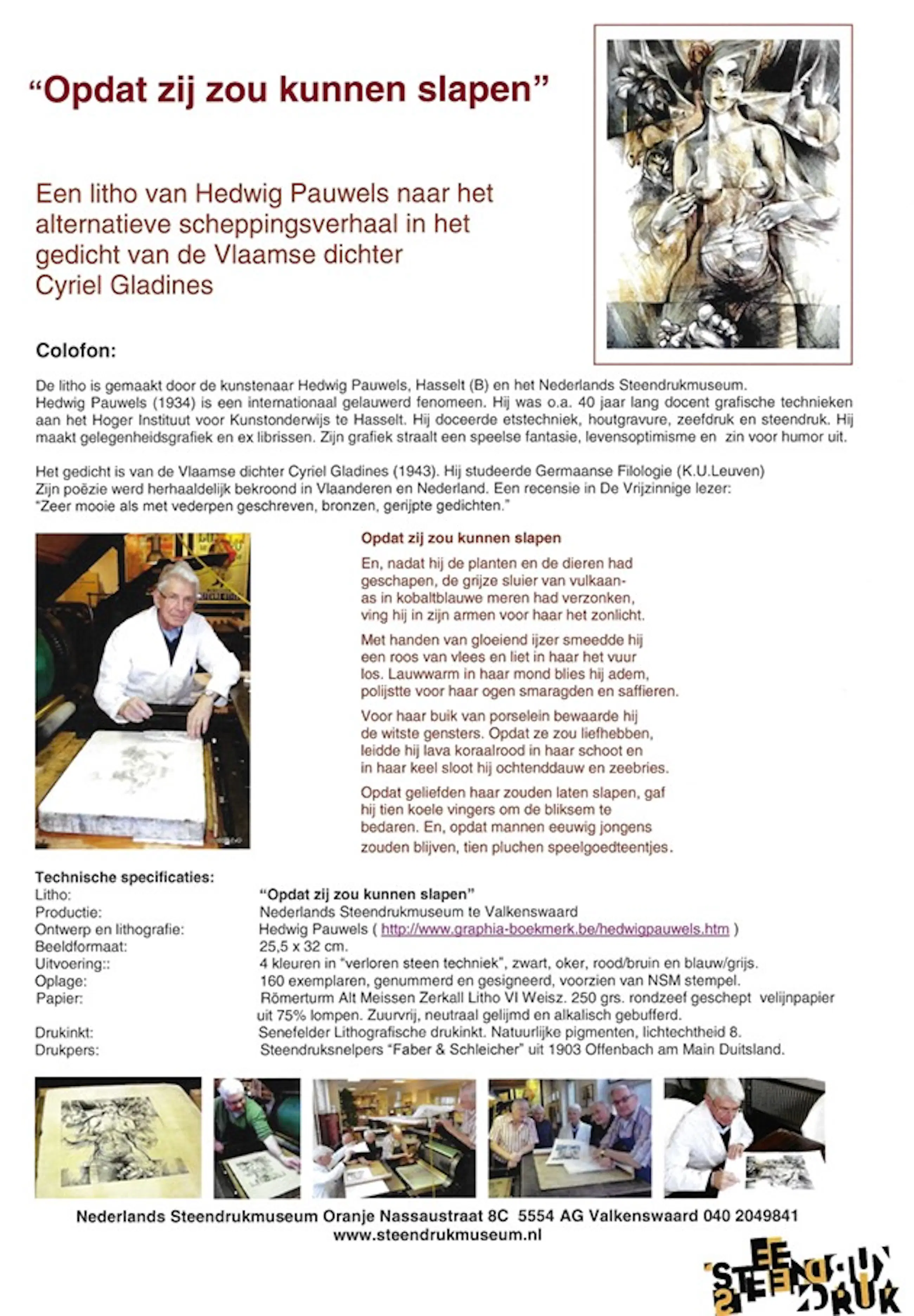 Litho in beperkte oplage gemaakt in Nederlands Steendruk Museum n.a.v. een gedicht van Cyriel Gladines. voor details zie de Colofon.