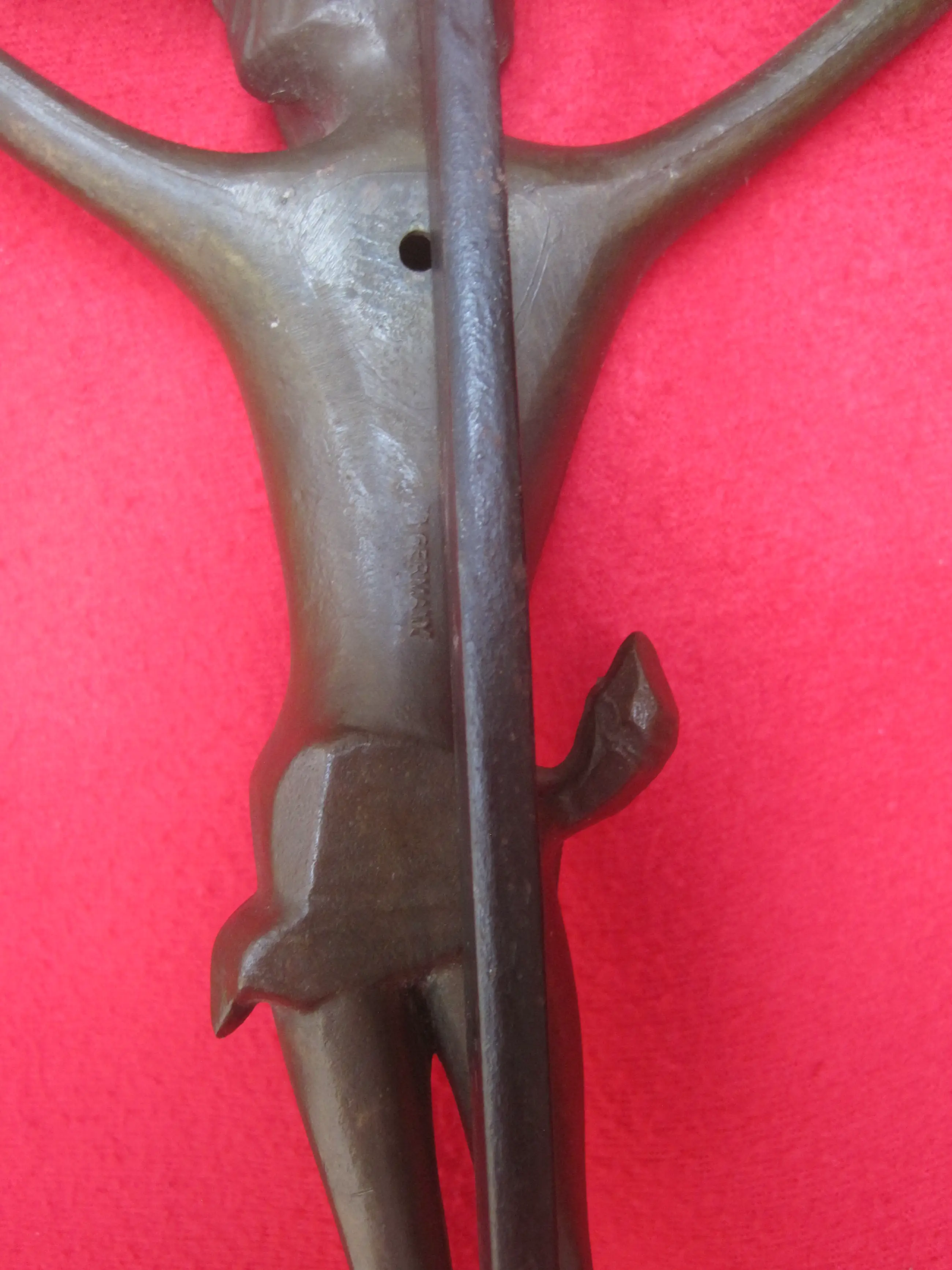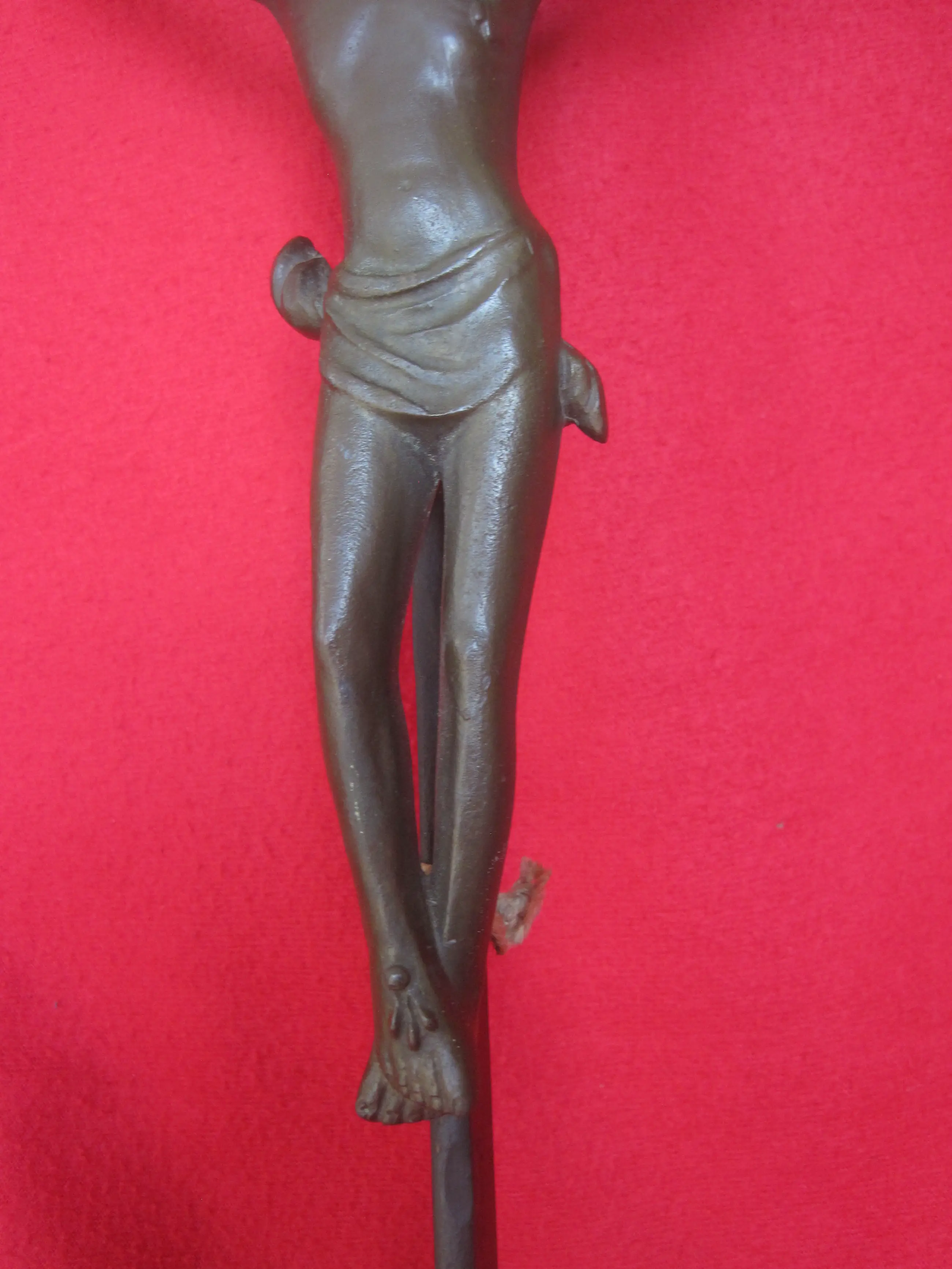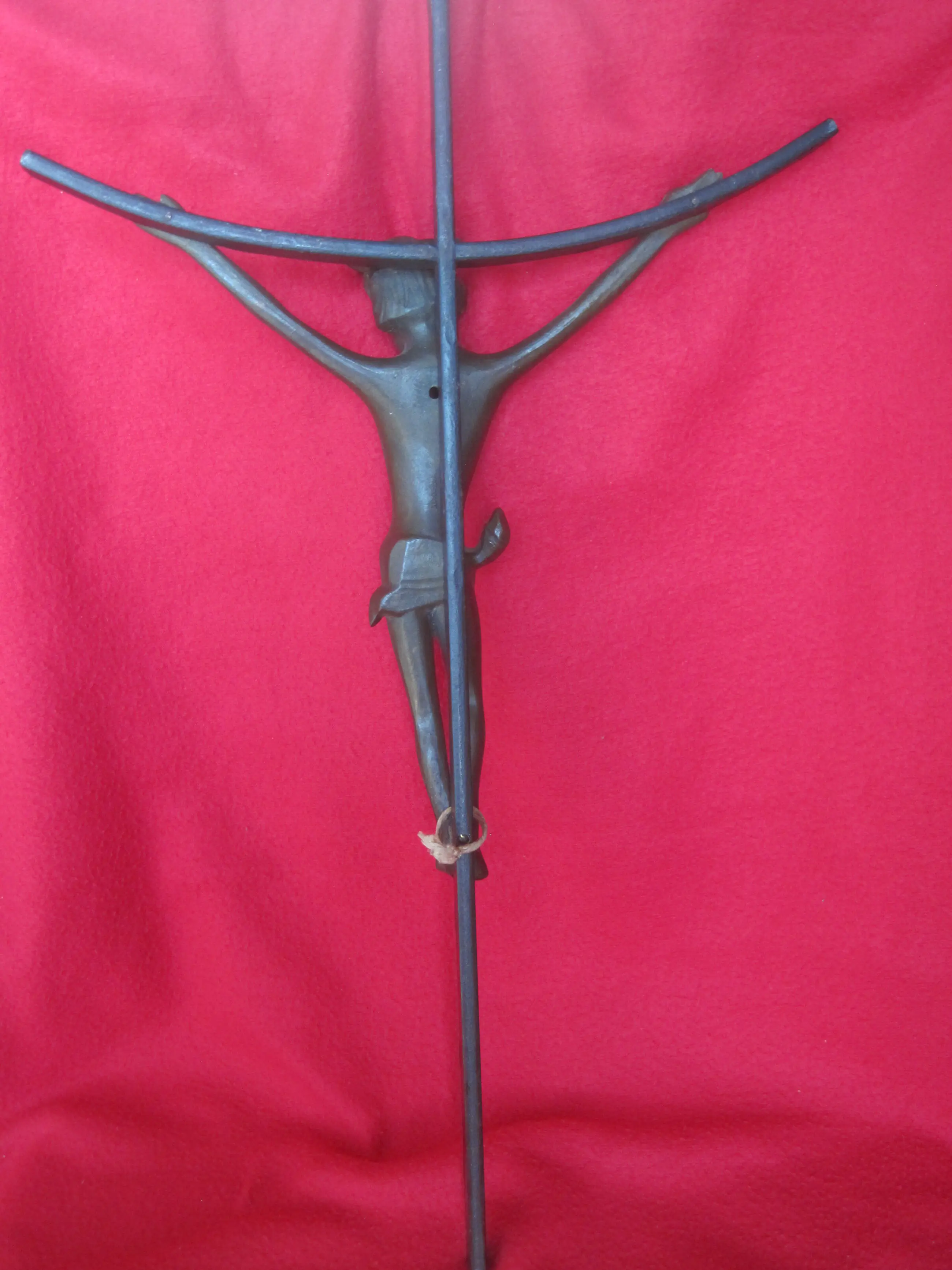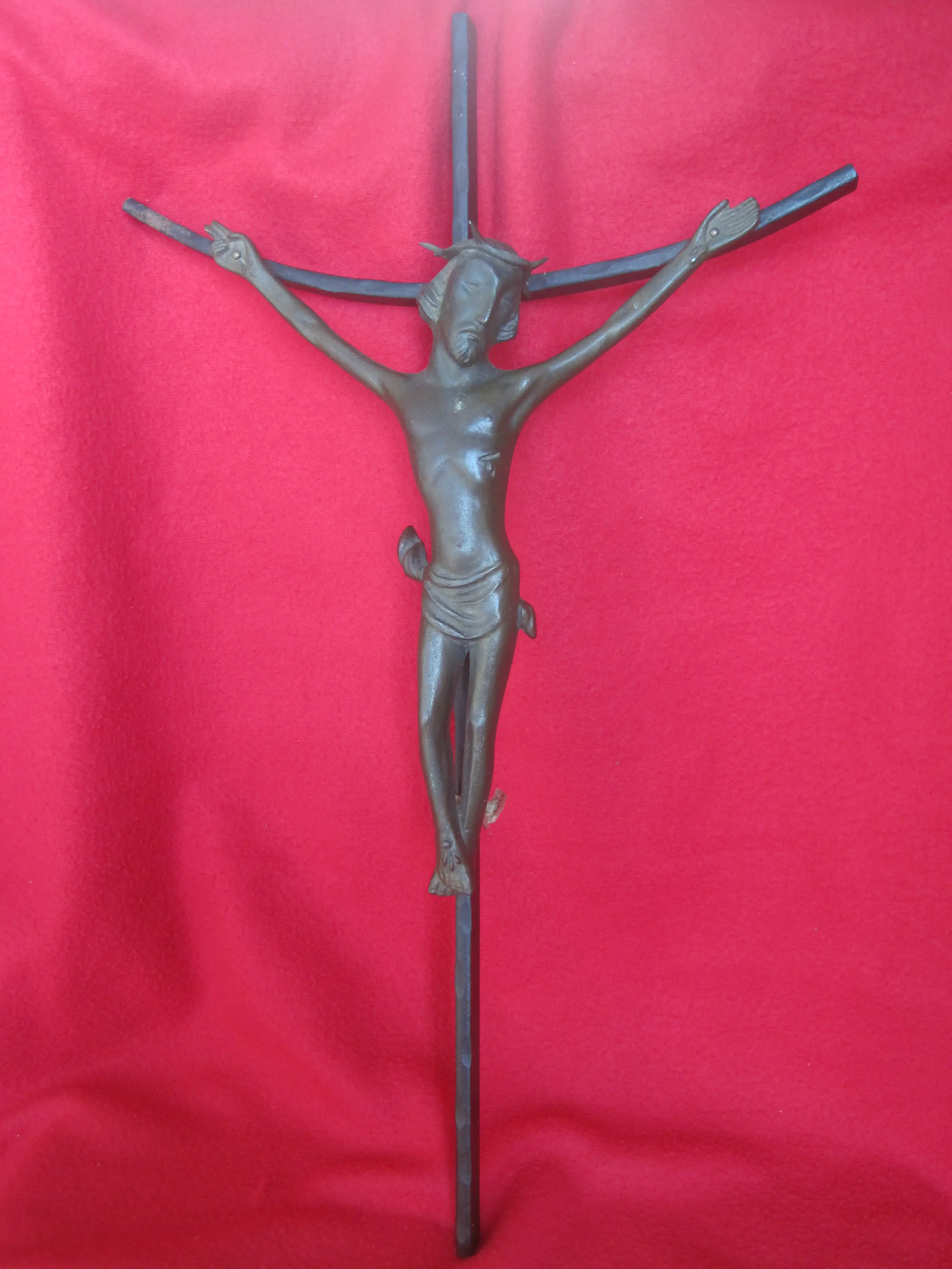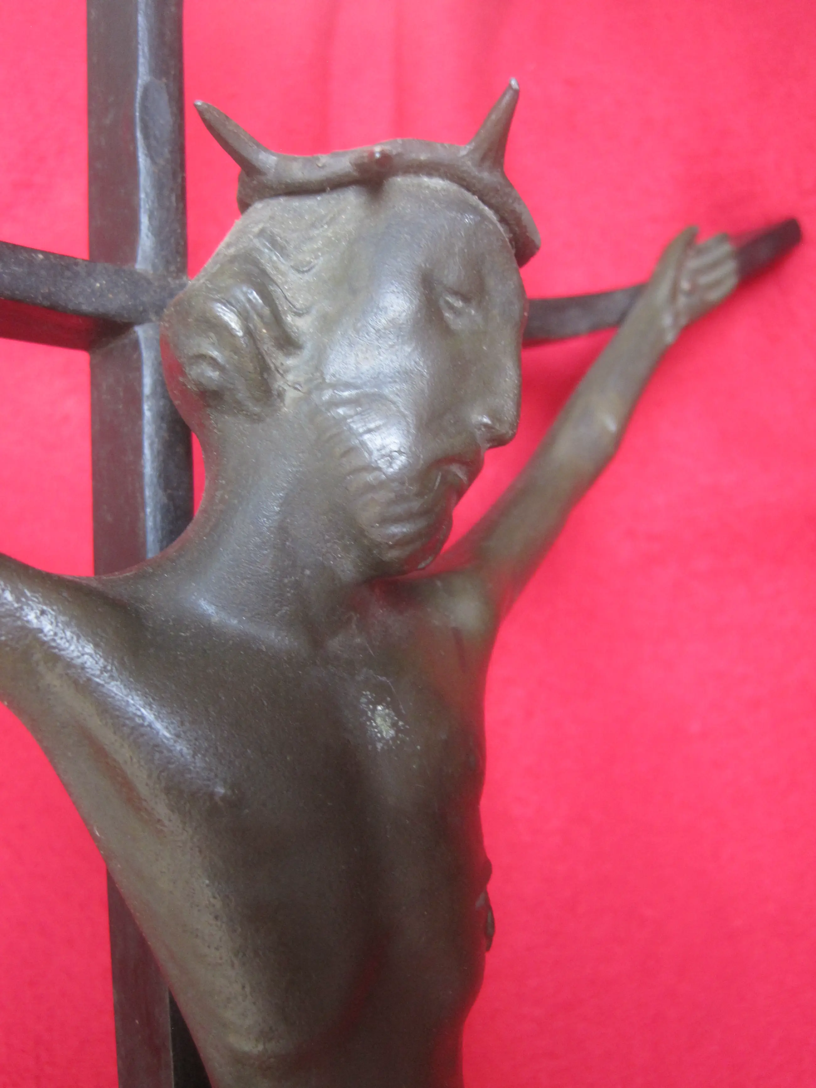 Een expressionistisch kruisbeeld met uitstraling. Het kruis is van staal, het corpus van een verbronsd gegoten legering.
