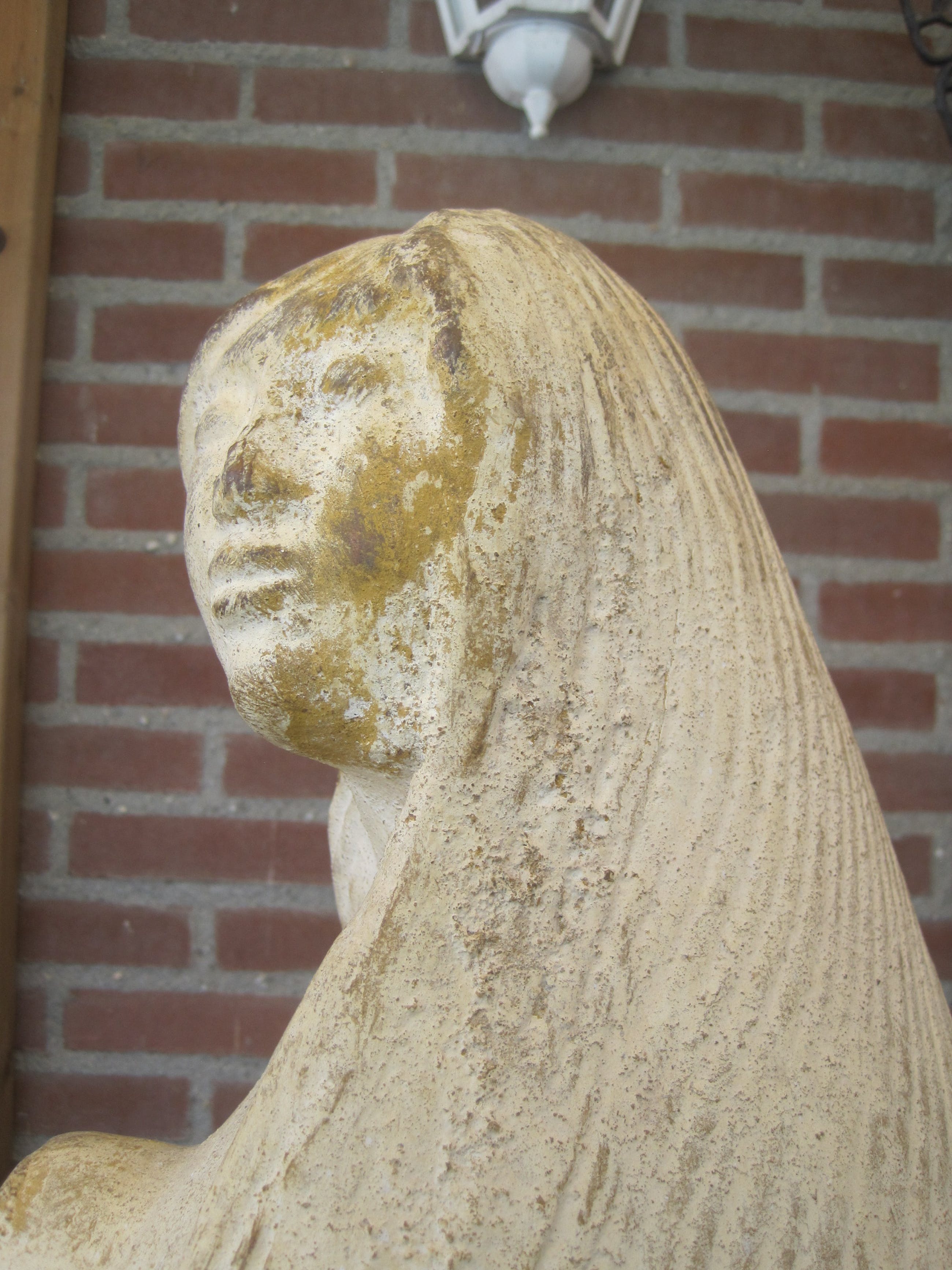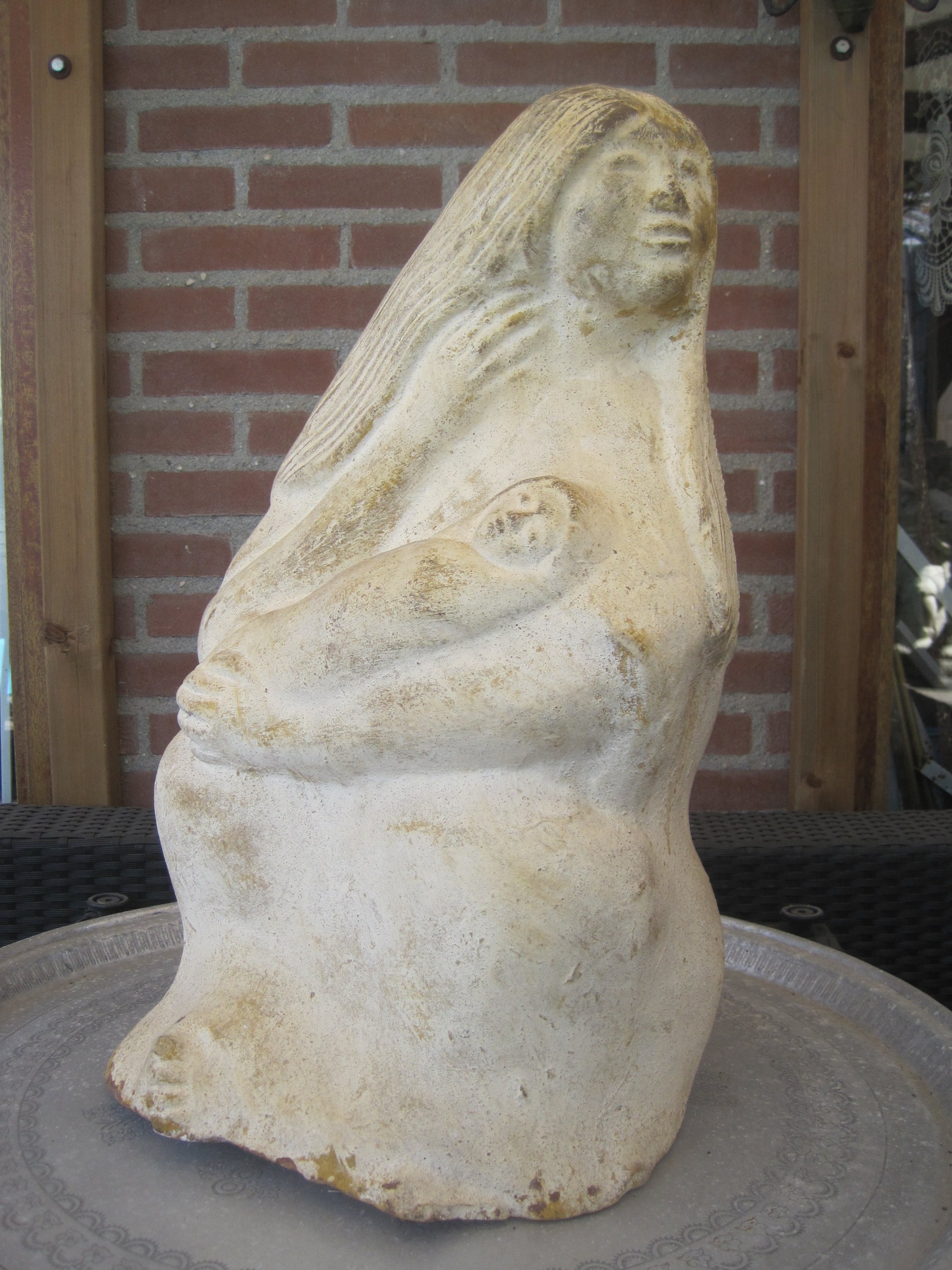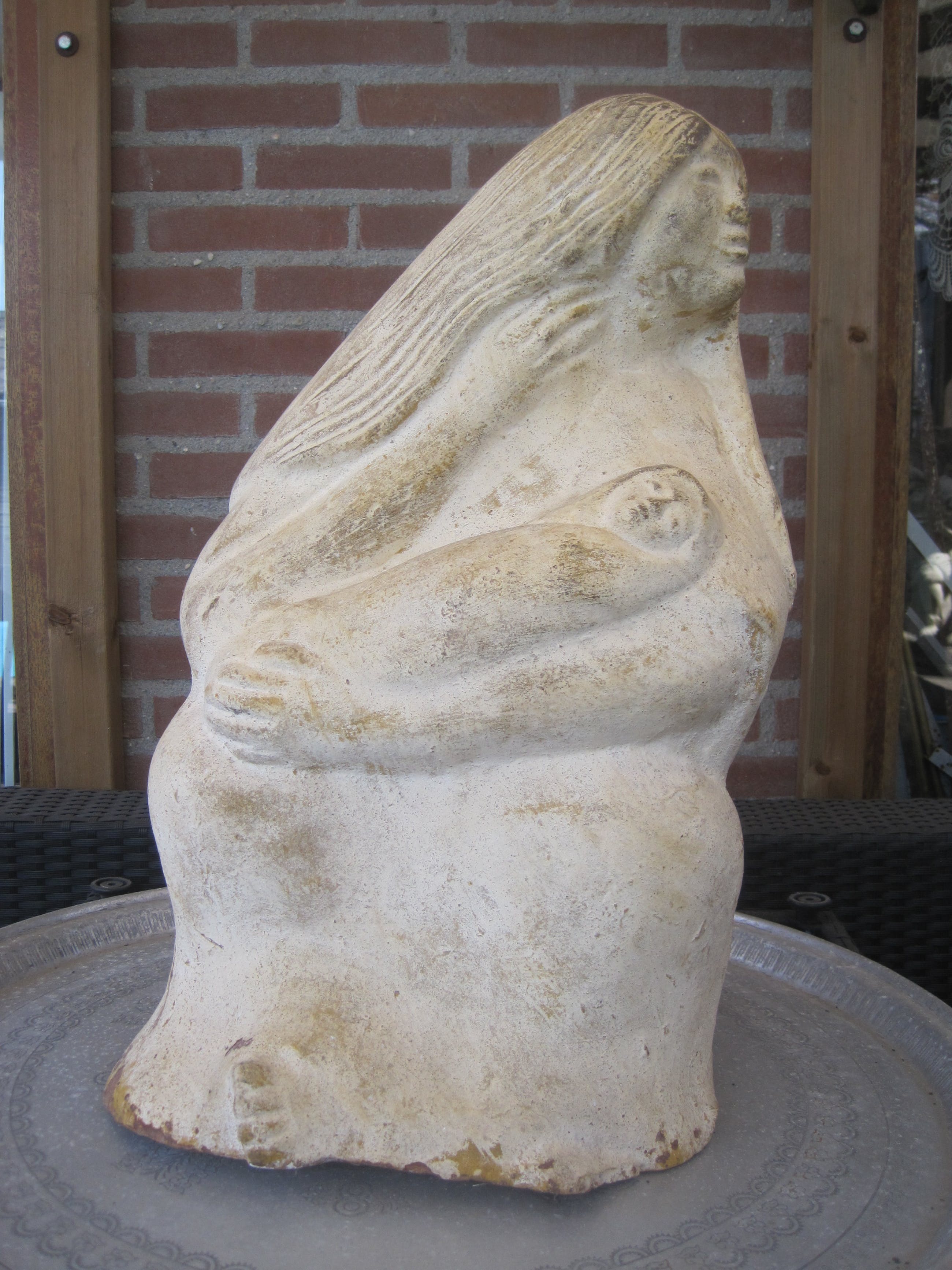 Een uniek, groot en zwaar terracotta beeld van de moeder Maria met Kind uit Mexico Zuid Amerika. Het beeld ademt de sfeer van de plastieken van Francisco Zuniga. Het beeld is gemaakt van rode klei en eerst beschilderd met een okerkleurige verf, daarna met een beige kleurige verf. Gesigneerd op de achterzijde, helaas voor mij onleesbaar. Verkeert in een goed staat met 'n chipje aan de voet. Dit beeld kan alleen worden afgehaald ivm het gewicht en de kwetsbaarheid van het materiaal. In de prijs is rekening gehouden met de afhaalkosten.