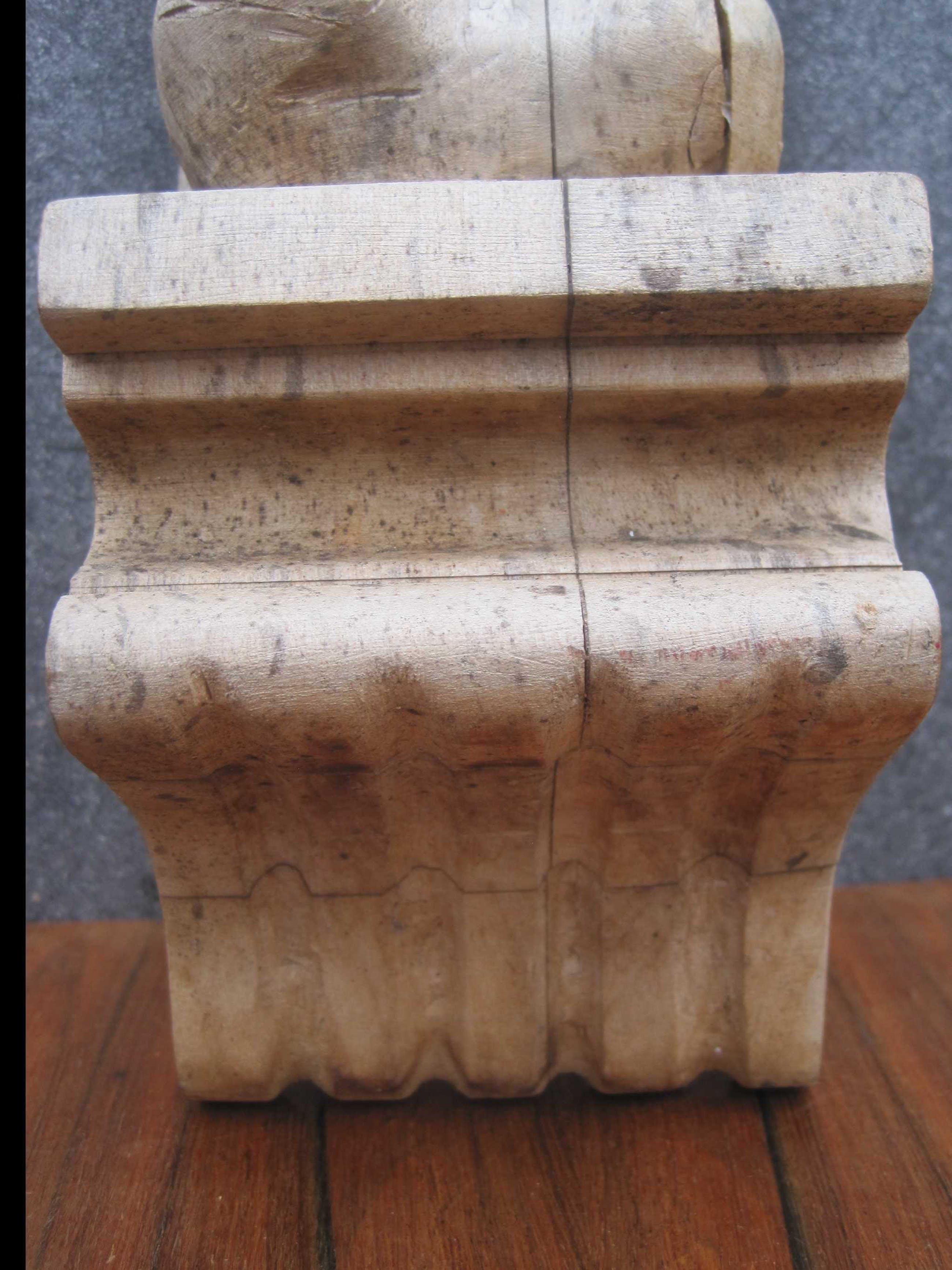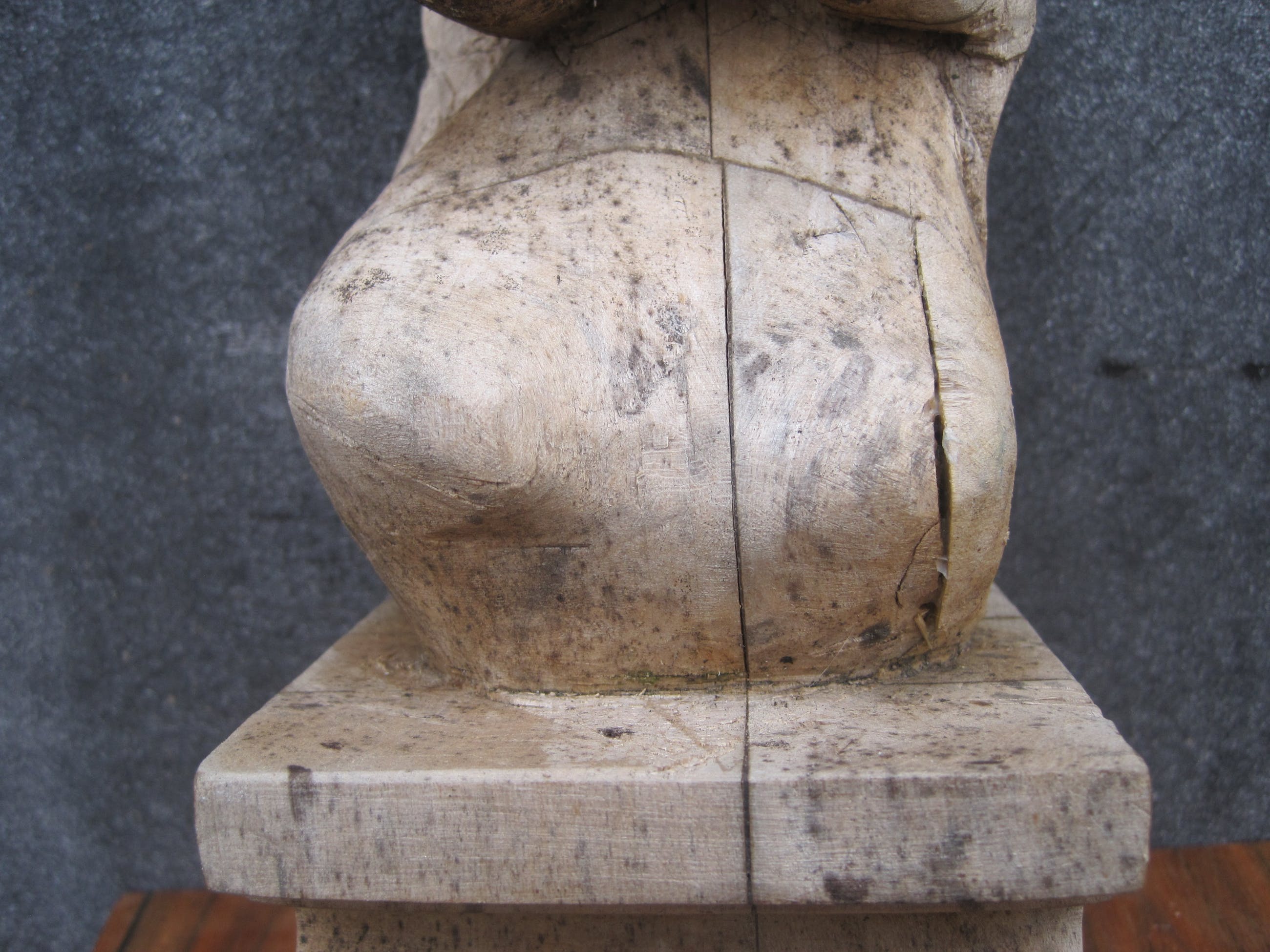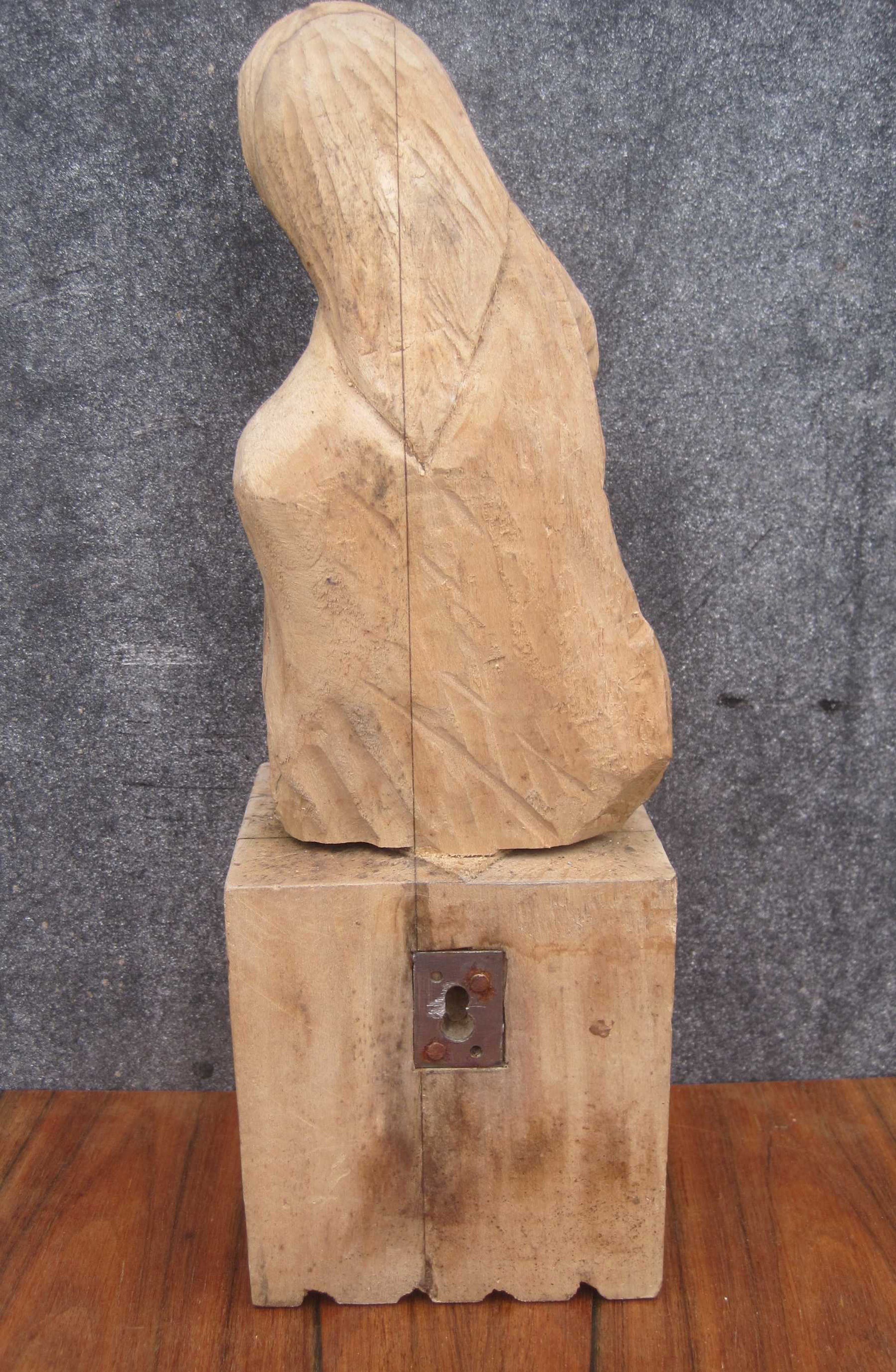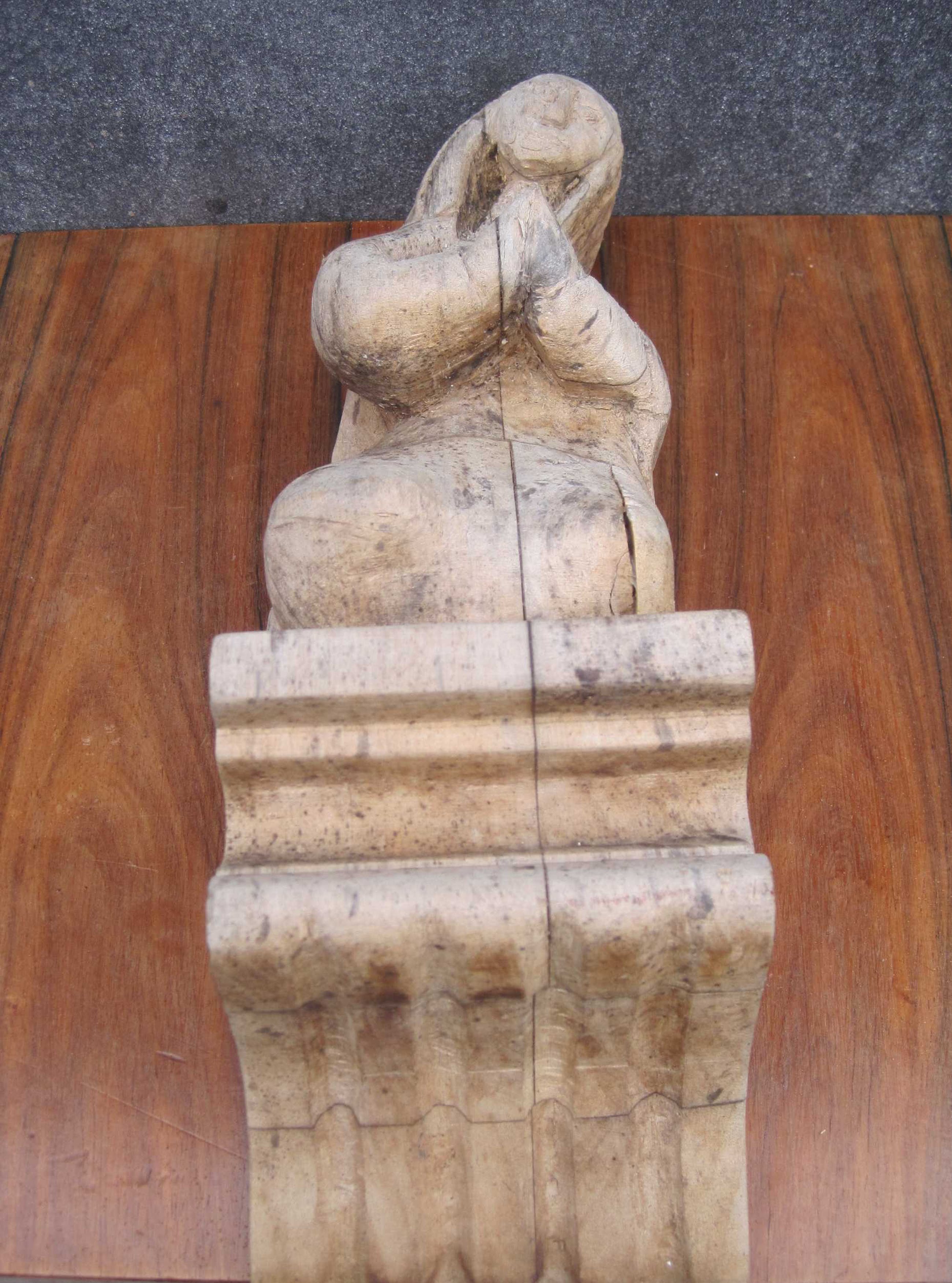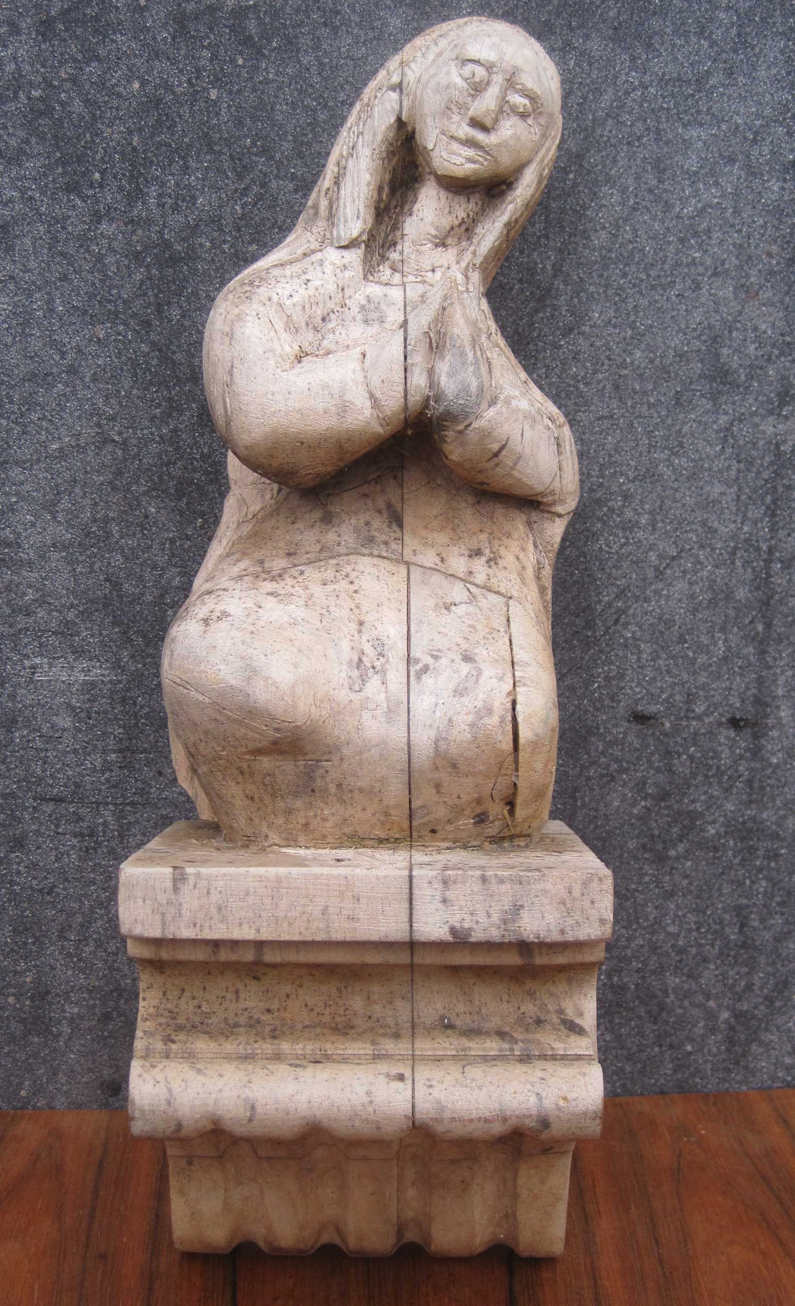 Een expressief en decoratief houten beeld van Maria. Ik denk dat het beeld bedekt is geweest met een plamuurlaag welke dmv loog is verwijderd. Het beeld en de console is uit delen opgebouwd. Mogelijk was het een polychroom beeld.