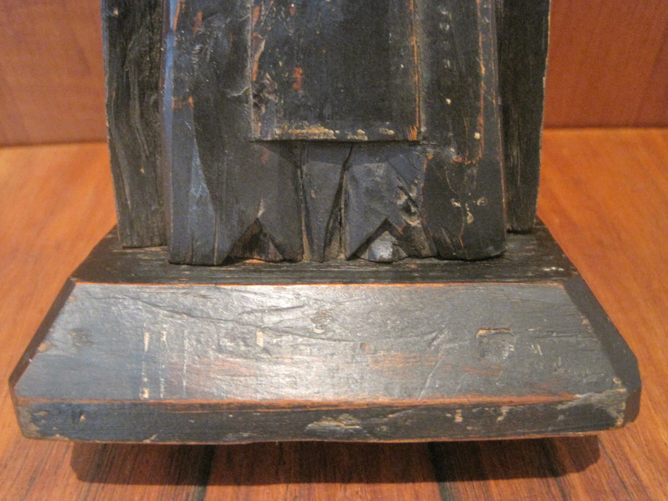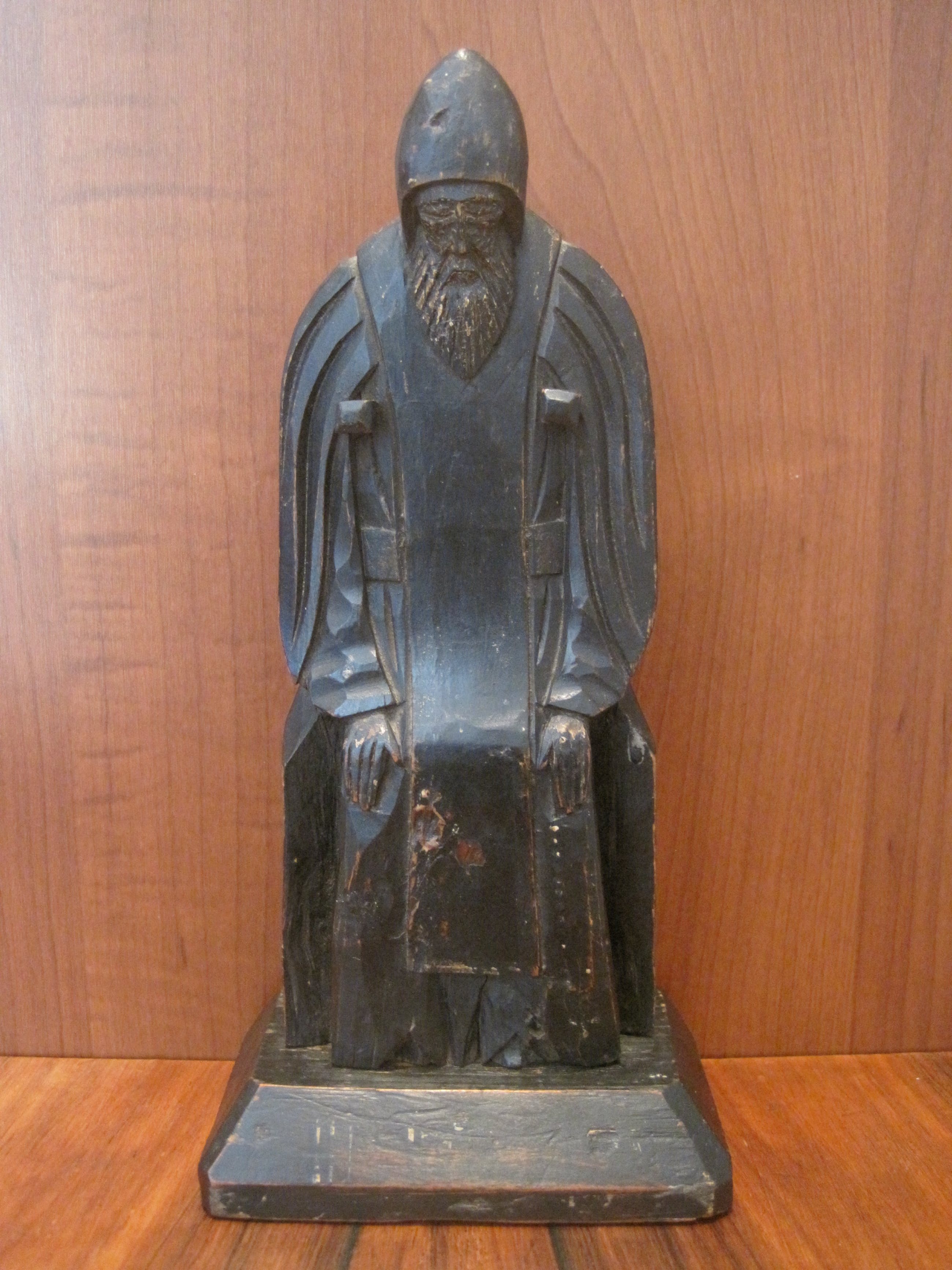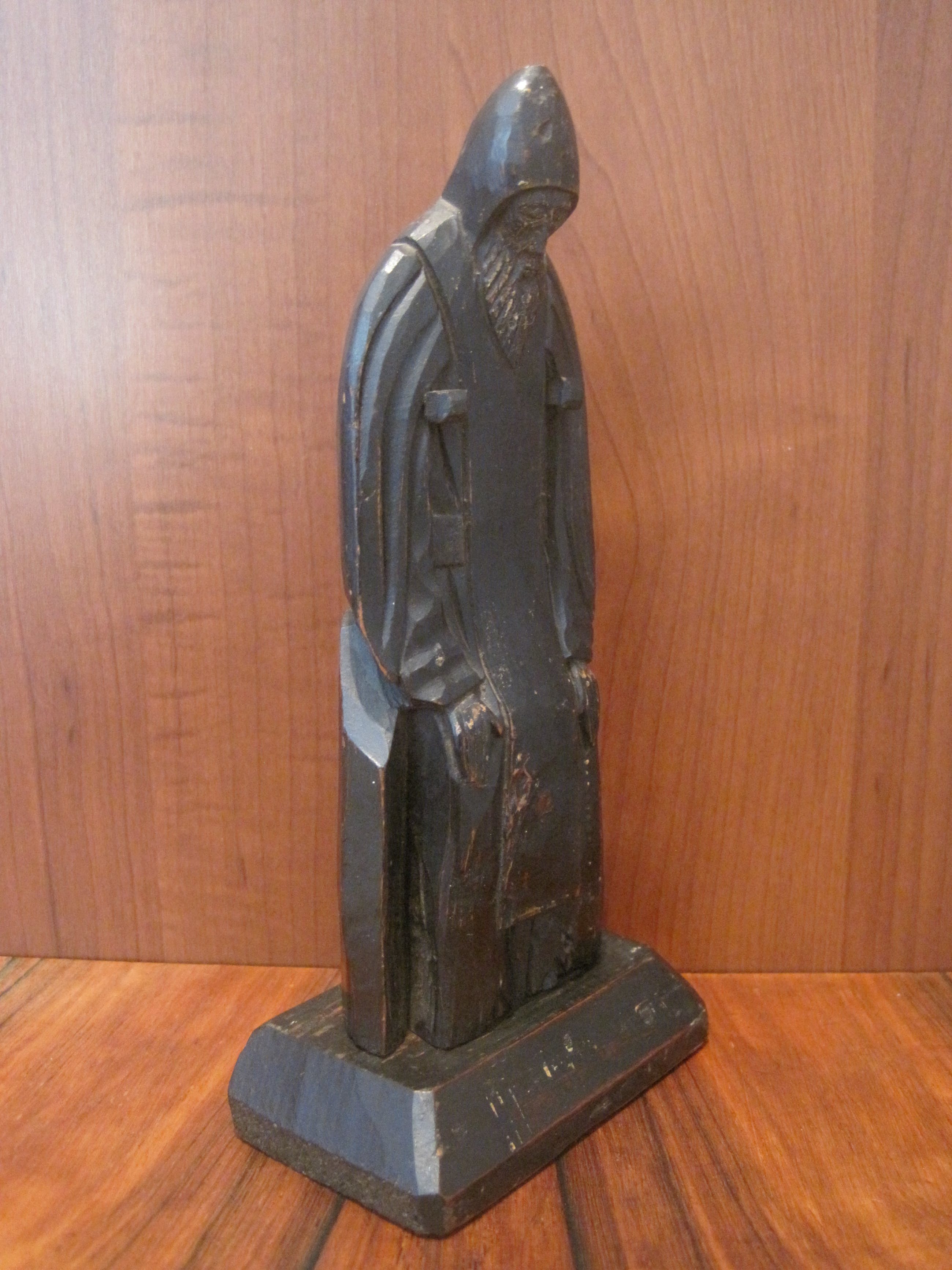Een houten beeldje van de Heilige St. Nil Stolbenski (+1554), stichter van het gelijknamig klooster, ook ruim vertegenwoordigd op ikonen in de Hermitage. Hij begon zijn leven als novice in het Krypets klooster in Pskov en trok zich na tien jaar terug als bosheremiet in het Rzhevsk woud aan de oever van de rivier Cheremkha, waar hij twaalf jaar doorbracht in gebed. In de laatste fase van zijn leven werd hij ingewijd in de Grote Schima, en woonde zesentwintig jaar totaal teruggetrokken als ‘stille kluizenaar’ op het eiland van Stolbensk in het Seliger Meer.