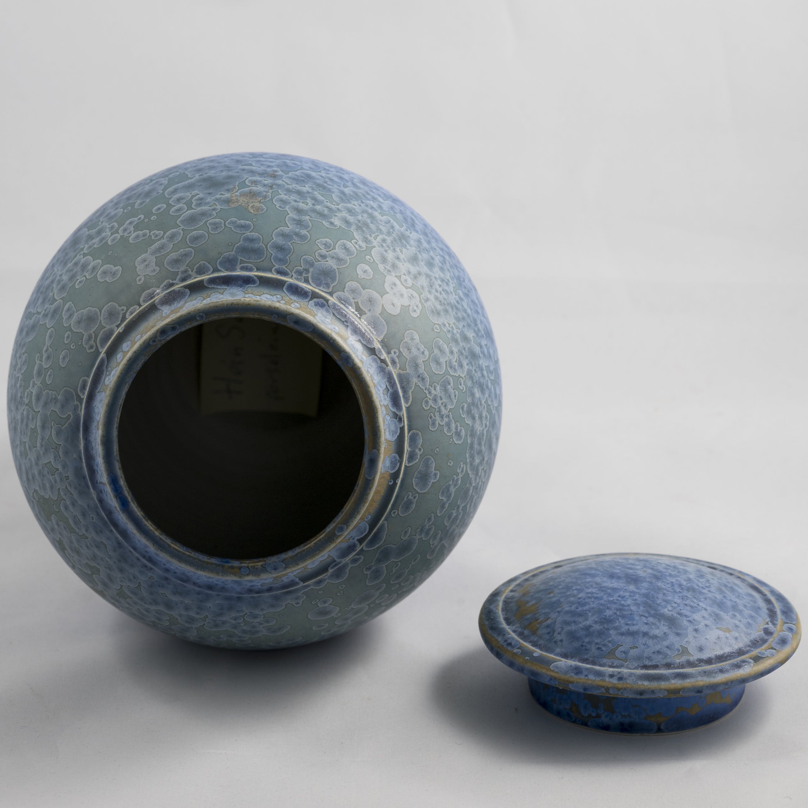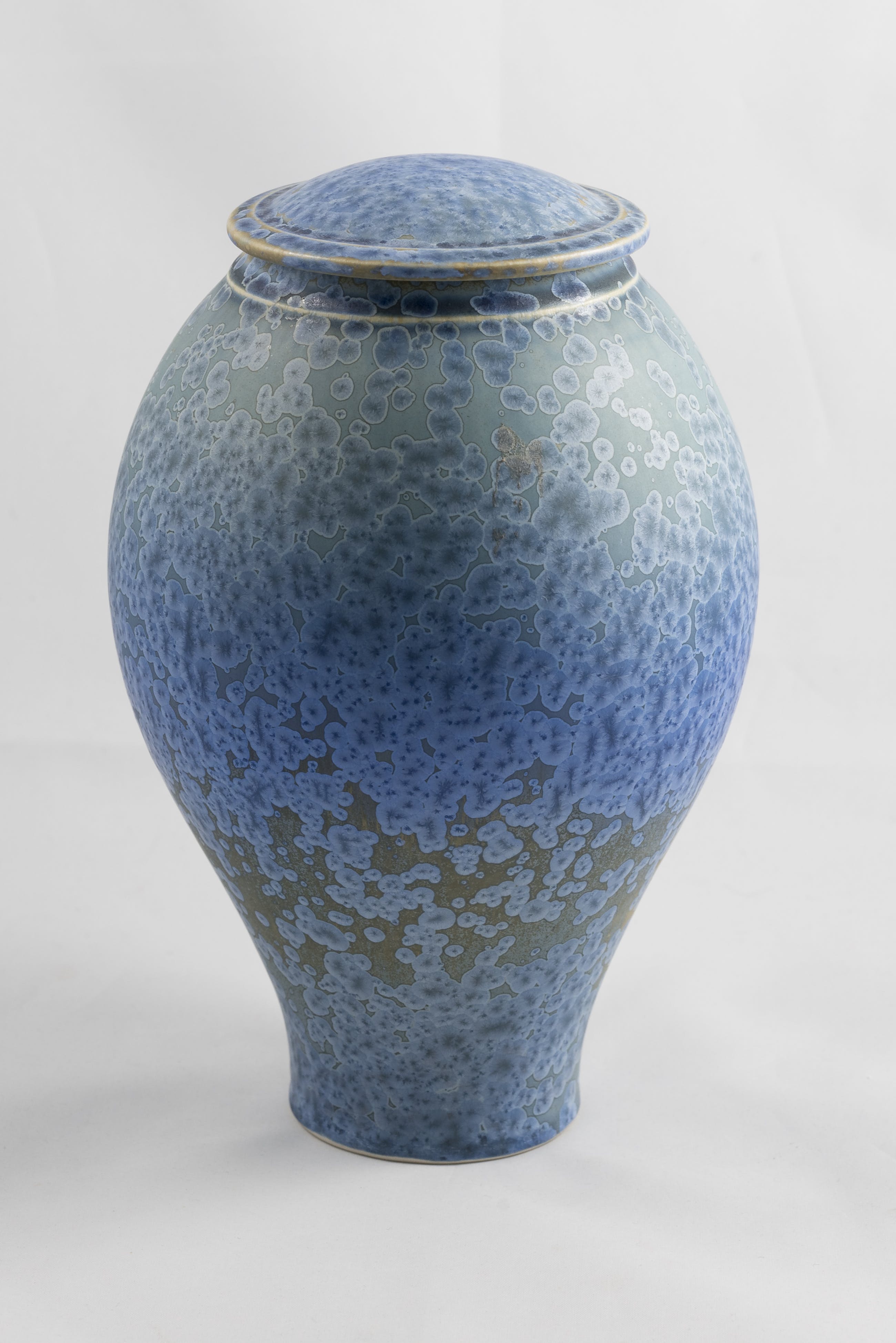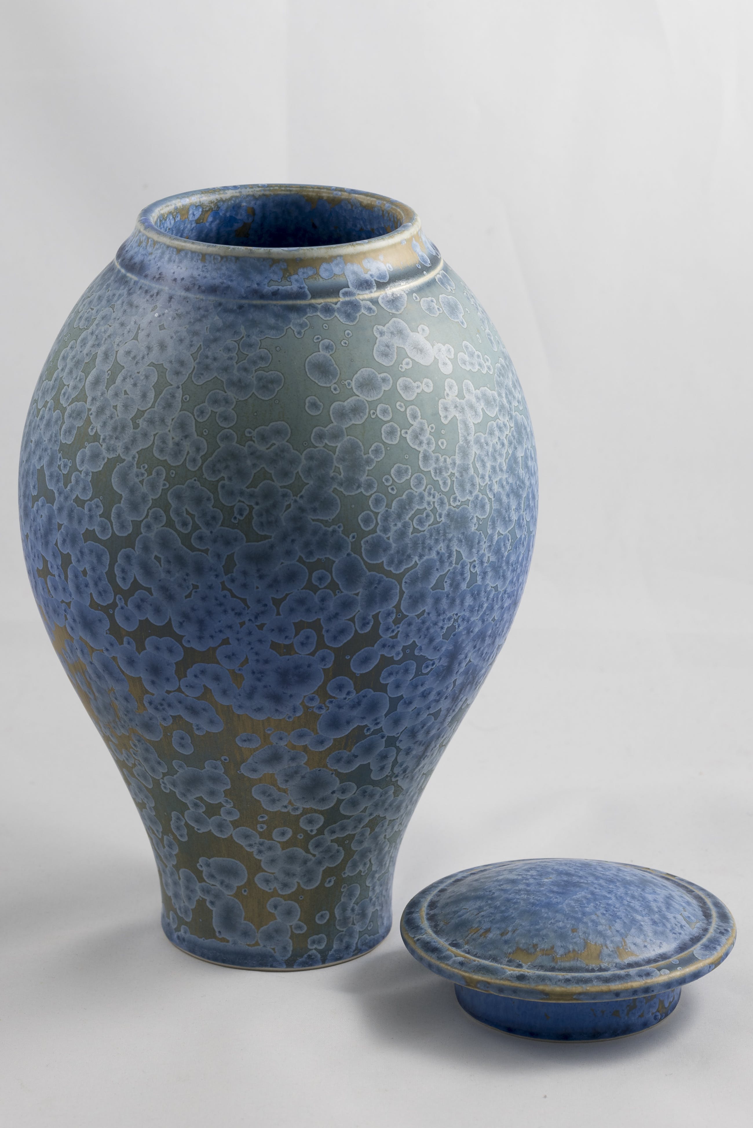 Porseleinen dekselpot met blauw kristalglazuur, ontwerp en uitvoering Hein Severijns.