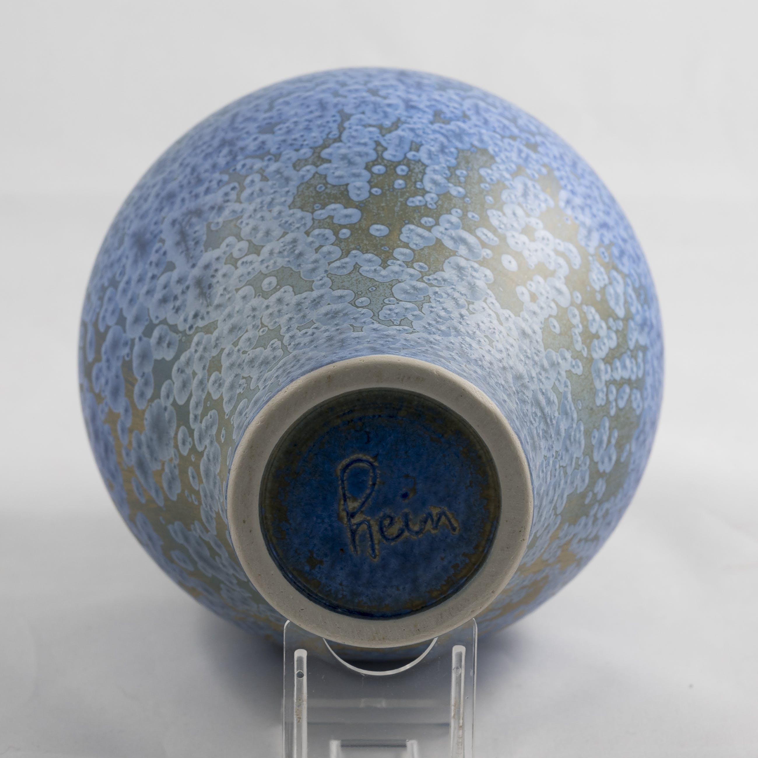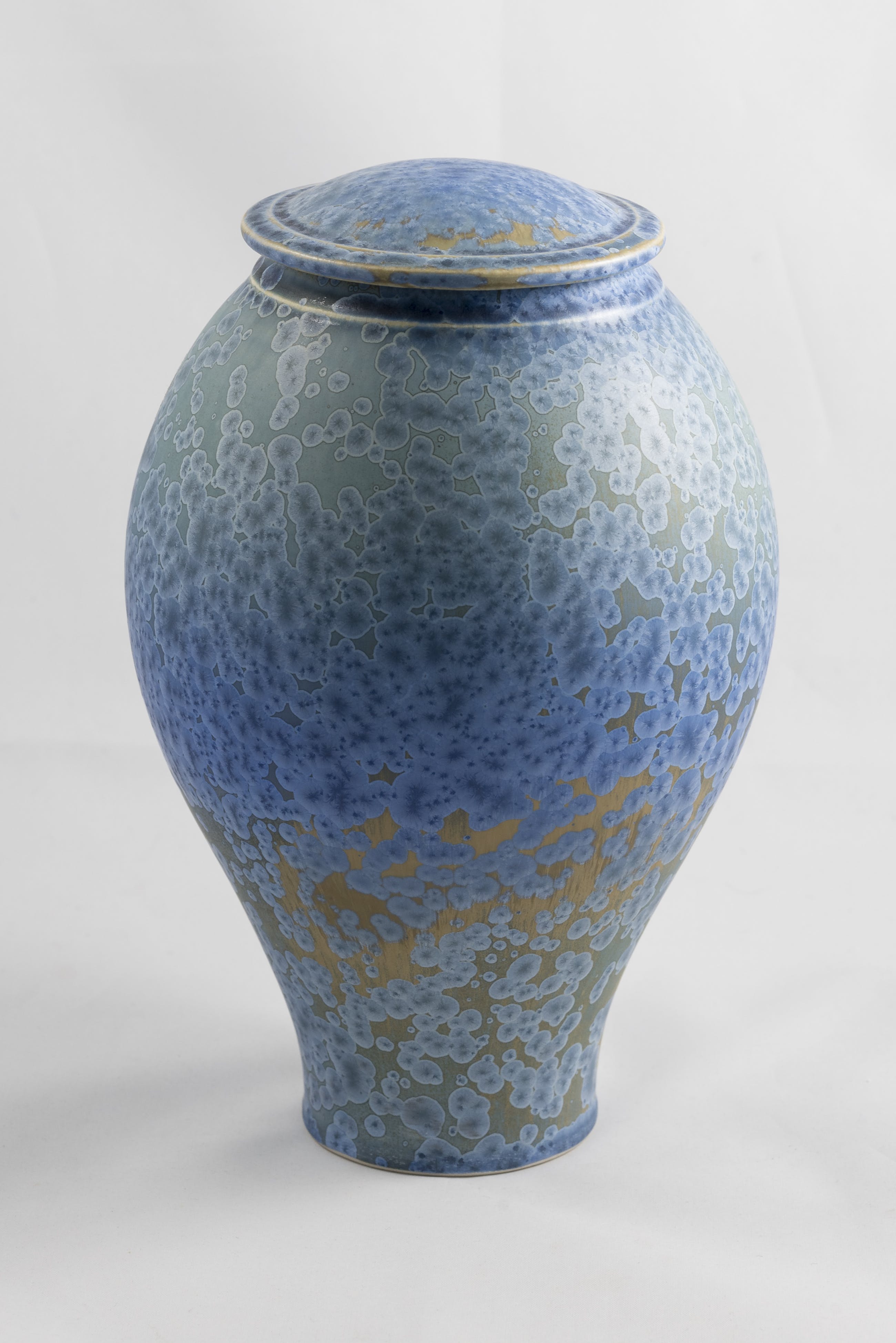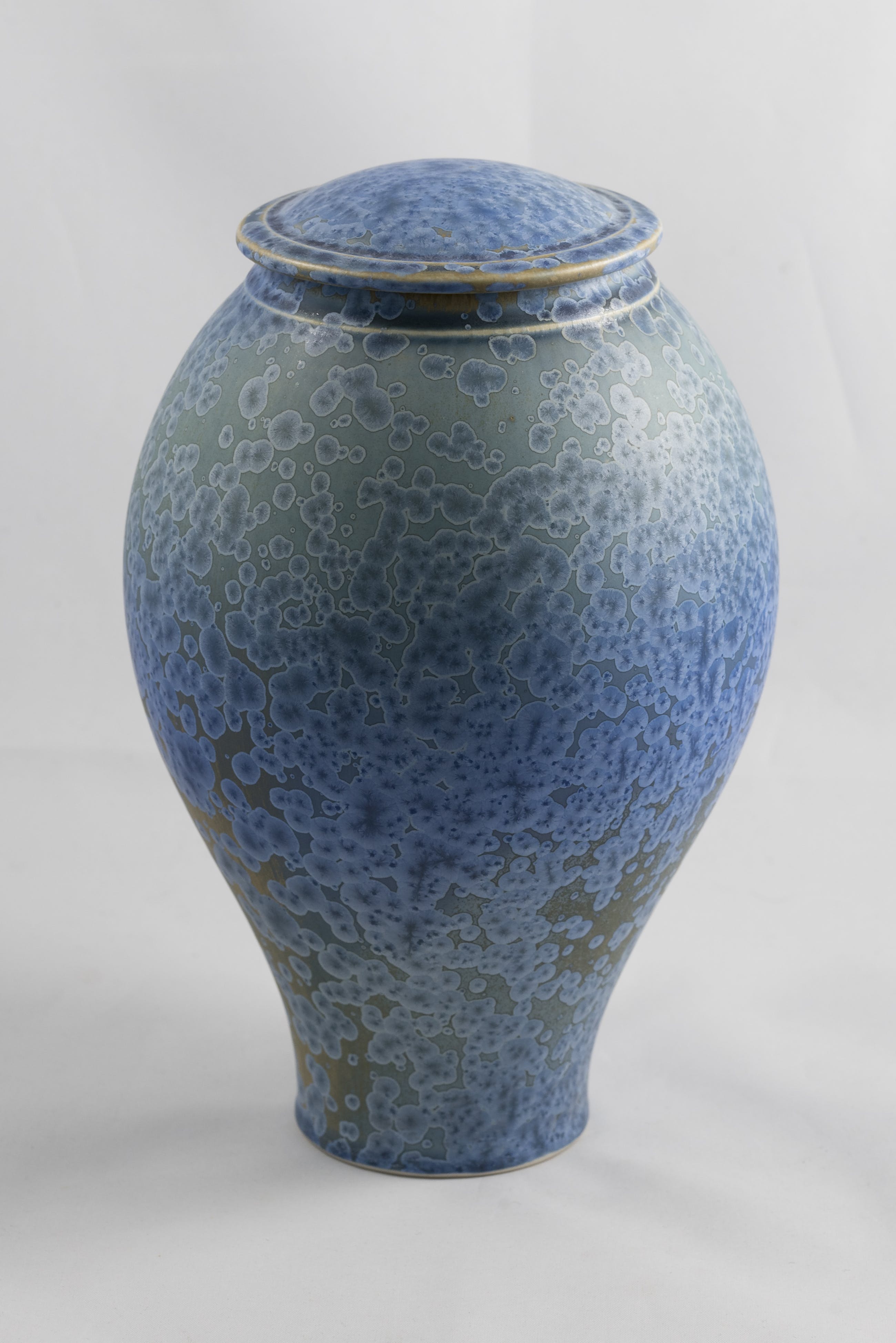 Porseleinen dekselpot met blauw kristalglazuur, ontwerp en uitvoering Hein Severijns.