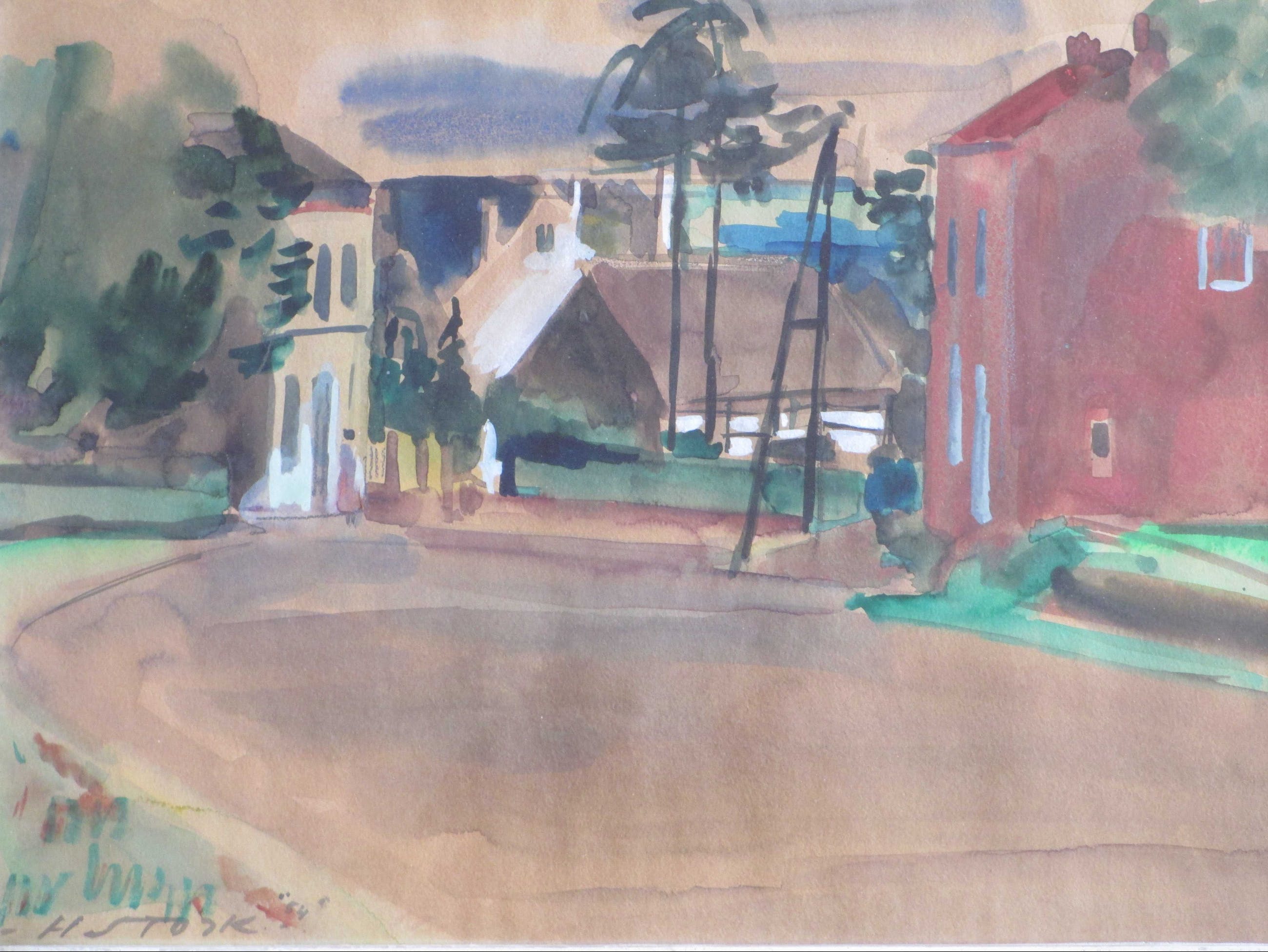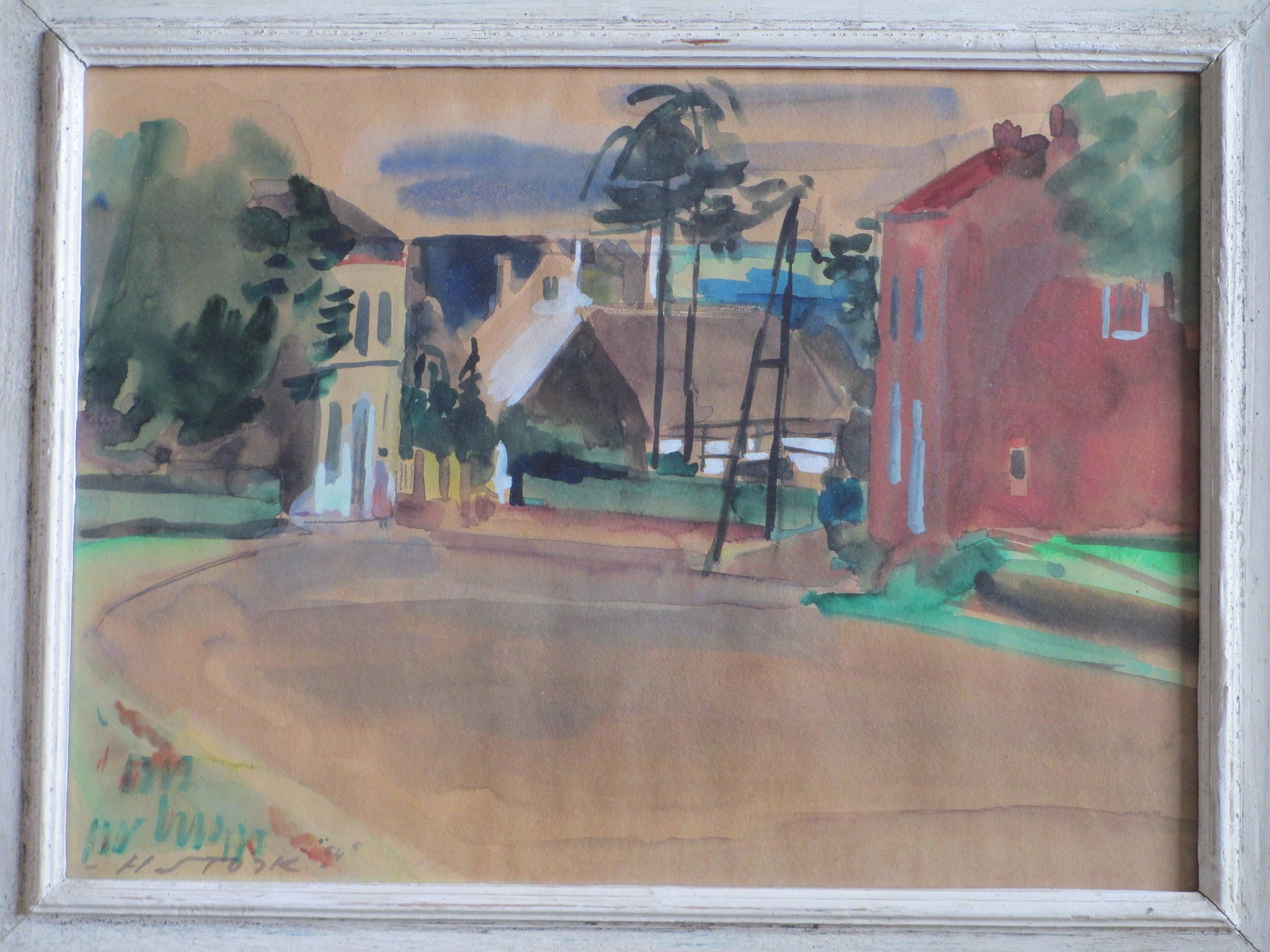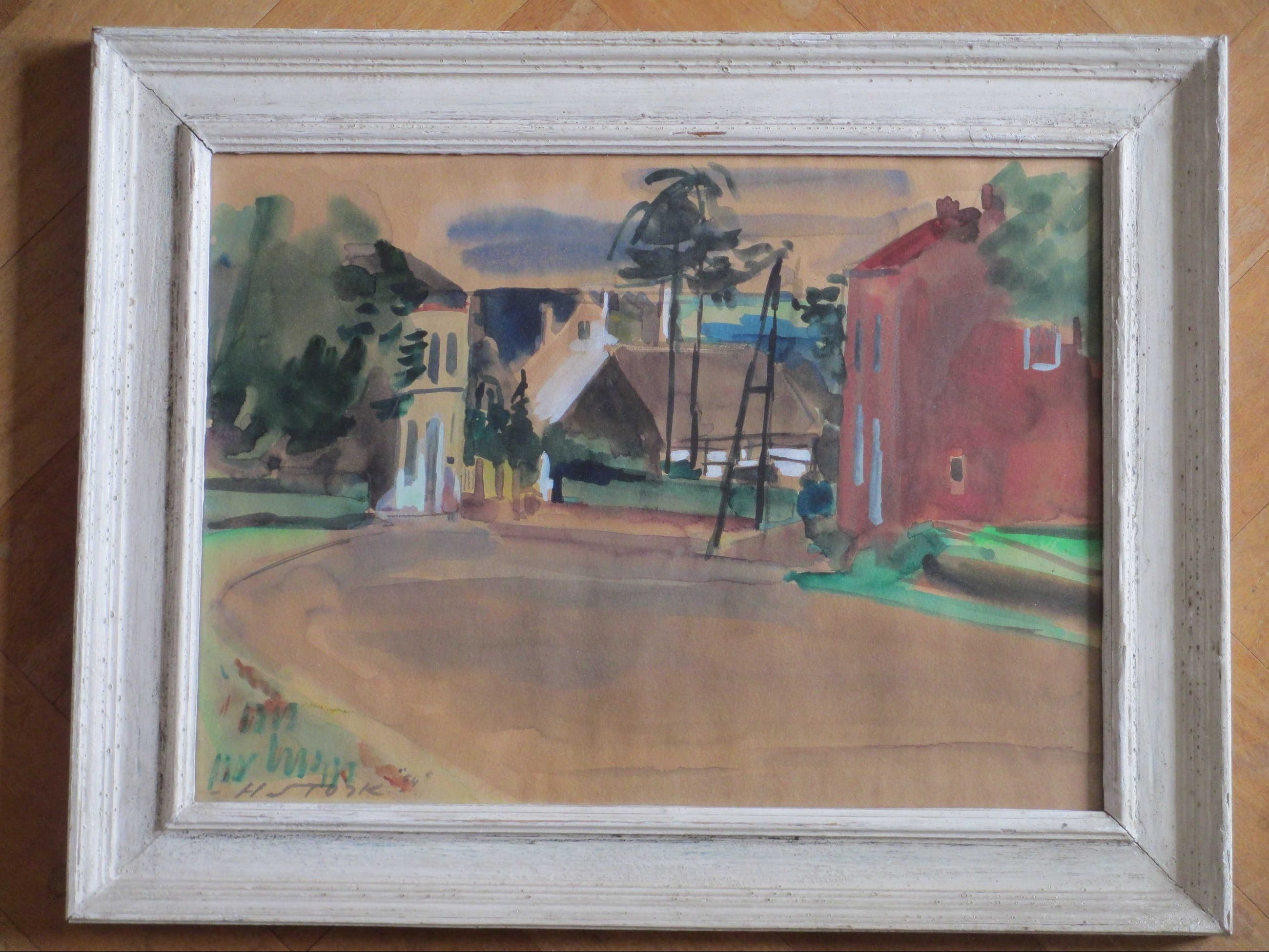 Gemengde techniek door Hein Stork. Voorstelling van een Frans dorpsgezicht Gelijst, beeldmaat 26x36, lijstmaat 36x46 Gesigneerd en gedateerd l.o.: 'H Stork '54' Authenticiteit volledig gegarandeerd.