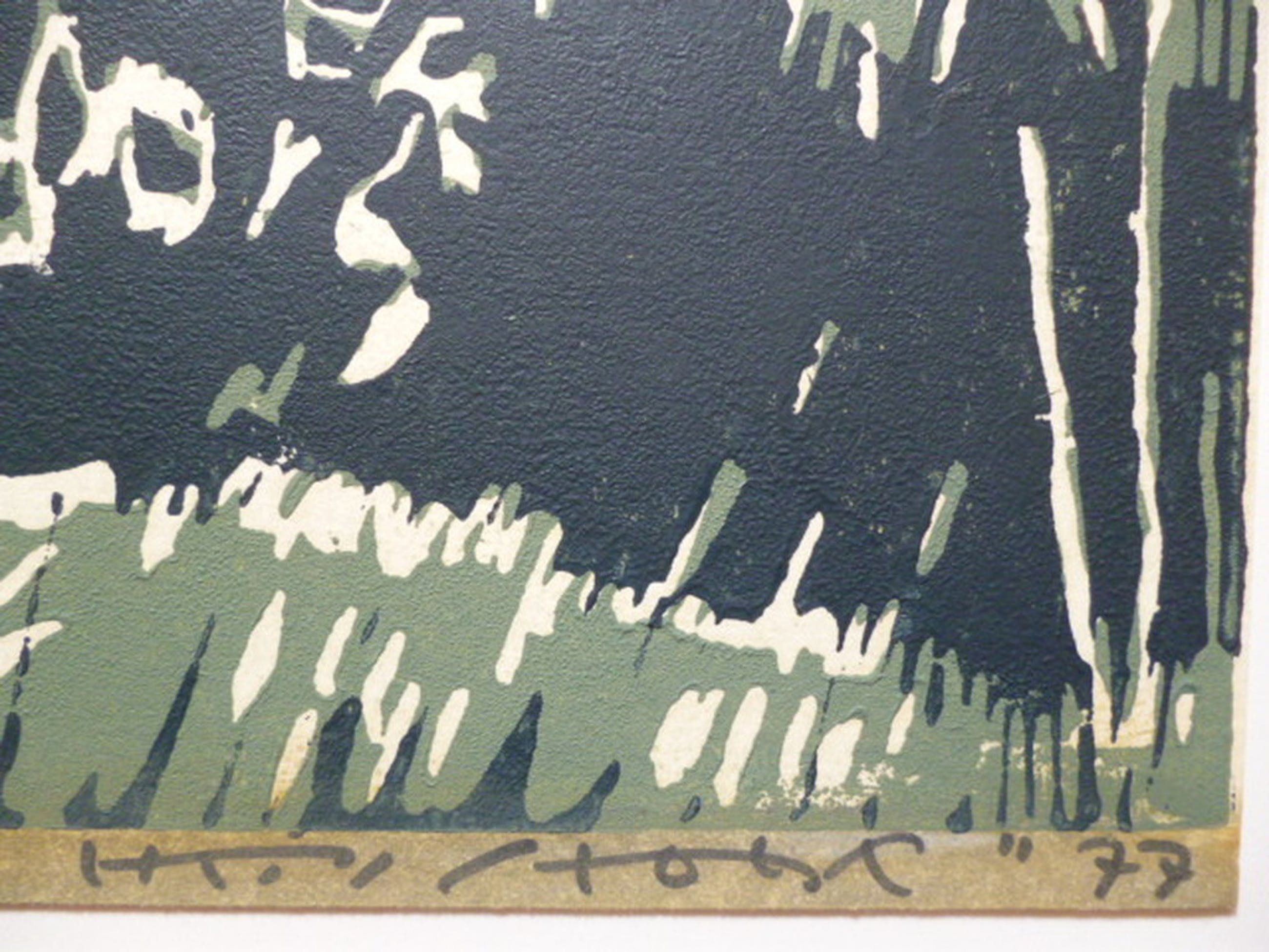 Kleurenlinosnede uit 1977. Potlood gesigneerd en gedateerd rechtsonder. Genummerd 10/X linksonder.