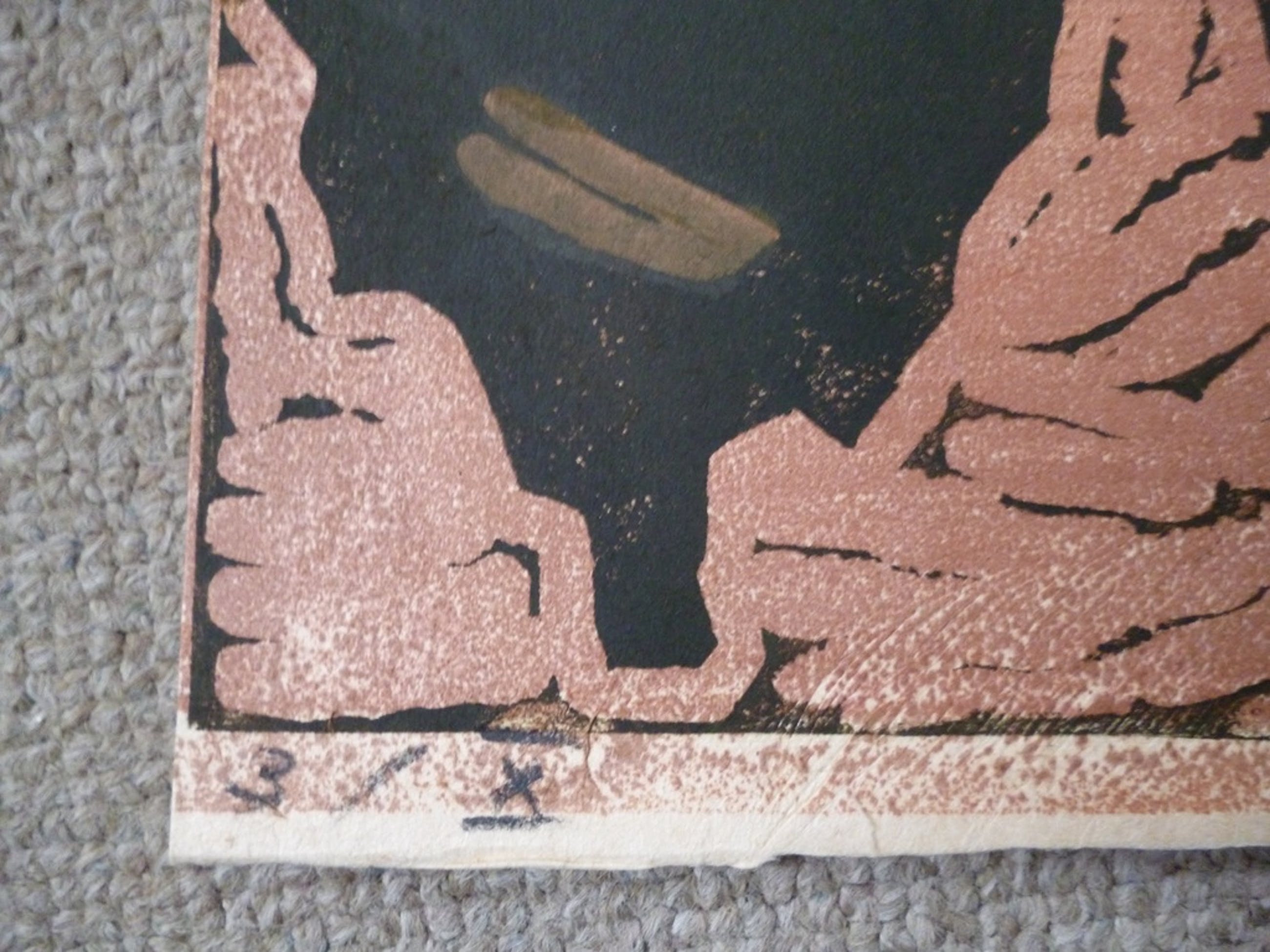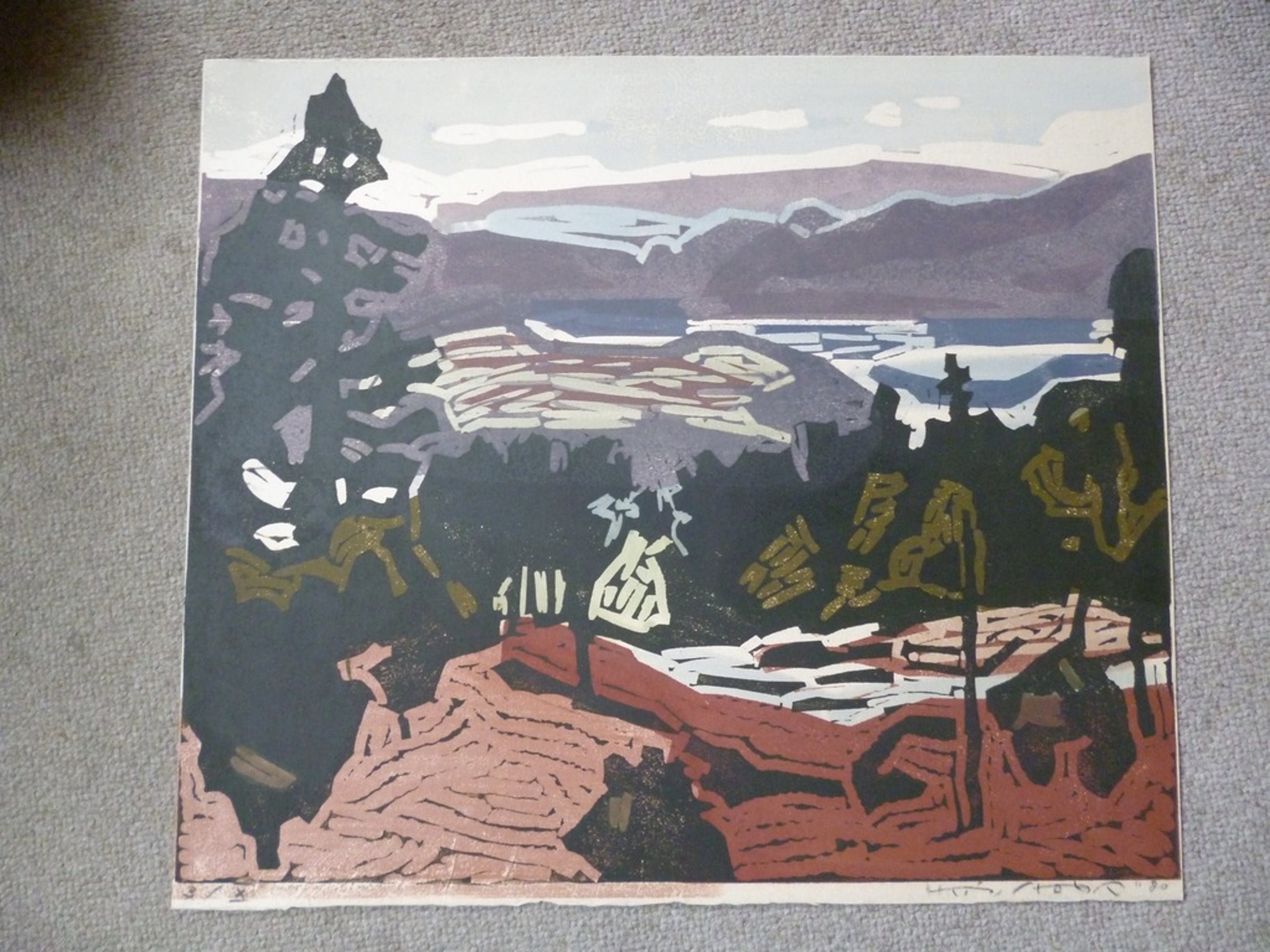 Kleurenlinosnede met een bergachtig landschap. Potlood gesigneerd en gedateerd '80 rechtsonder. Genummerd 3/X linksonder.