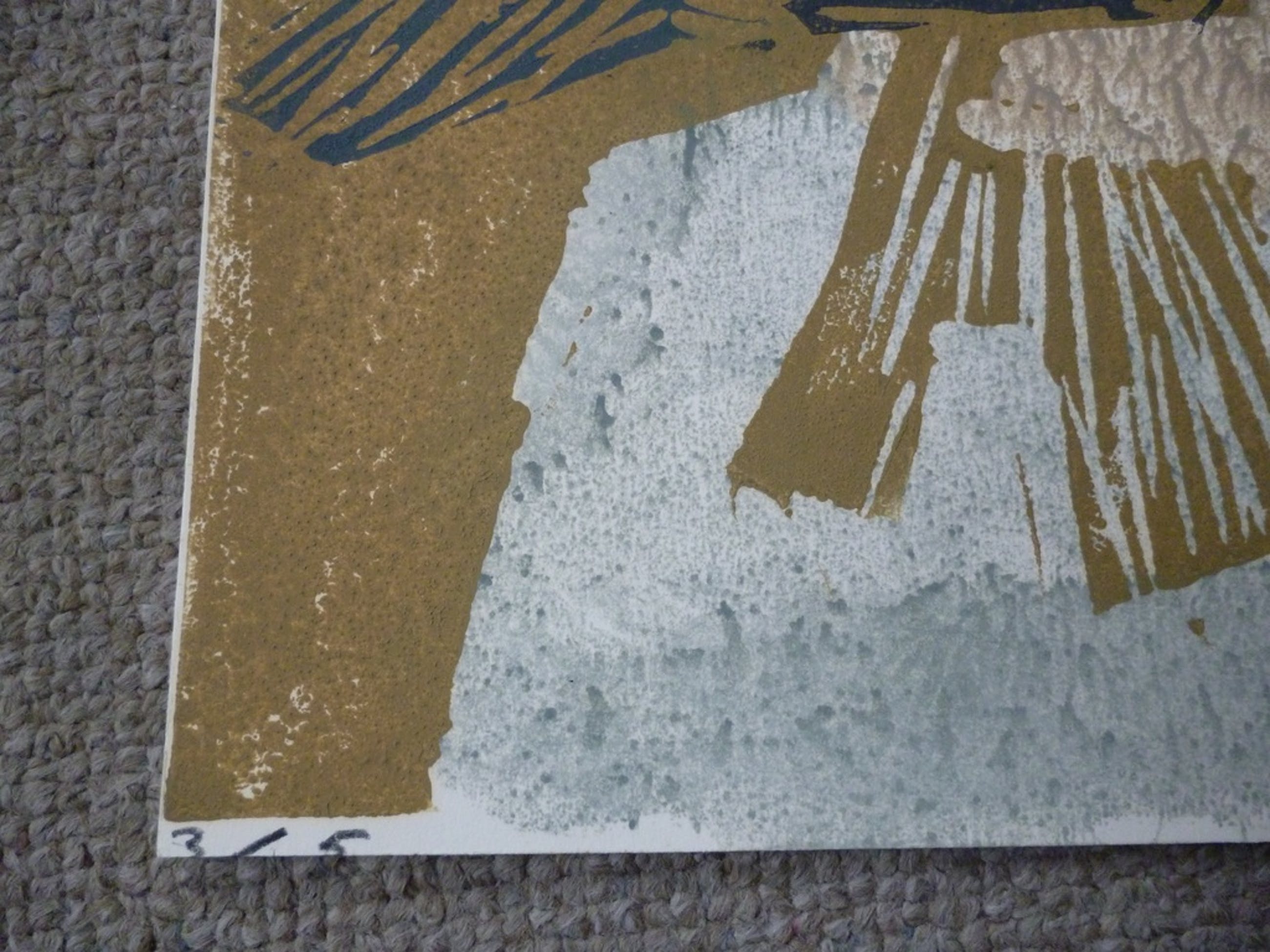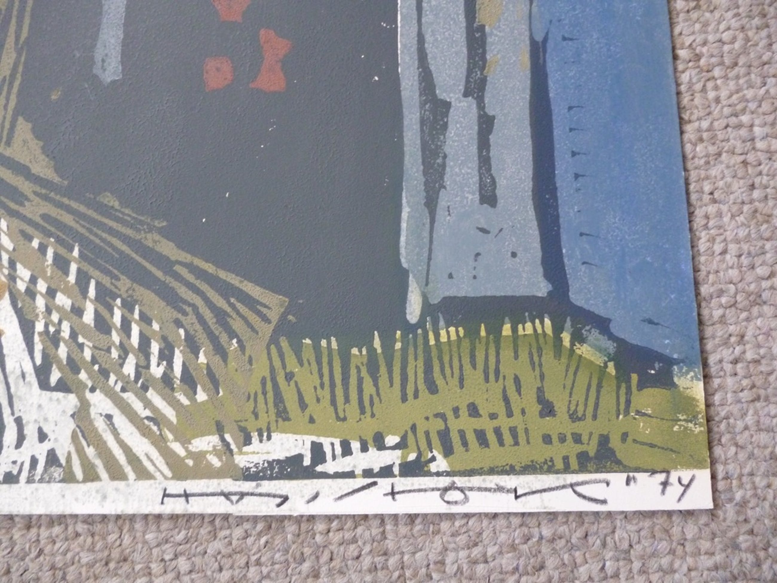 Kleurenlinosnede, potlood gesigneerd en gedateerd '74 rechtsonder.