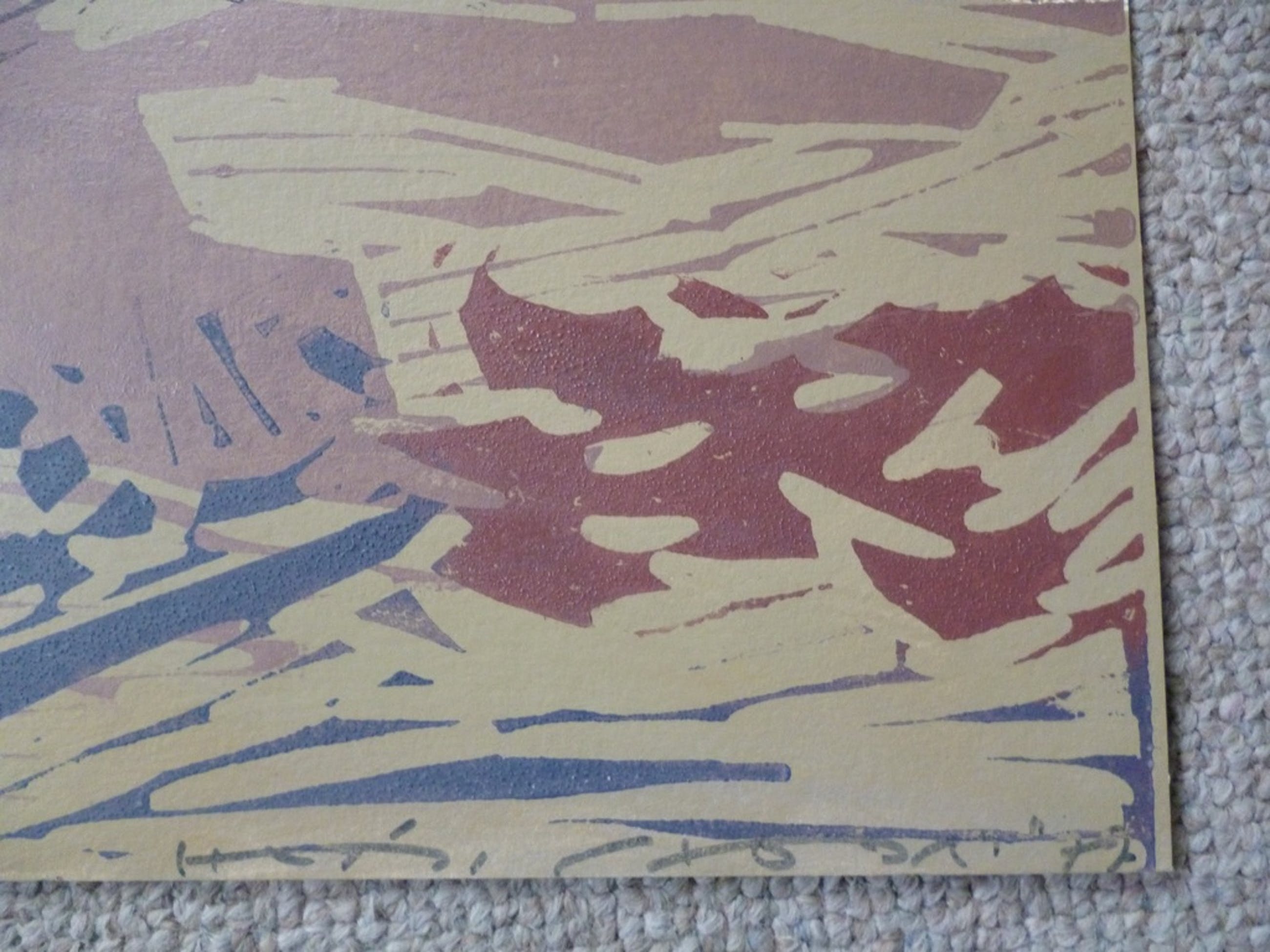 Kleurenlinosnede, potlood gesigneerd en gedateerd '77 rechtsonder. Genummerd 8/X linksonder.