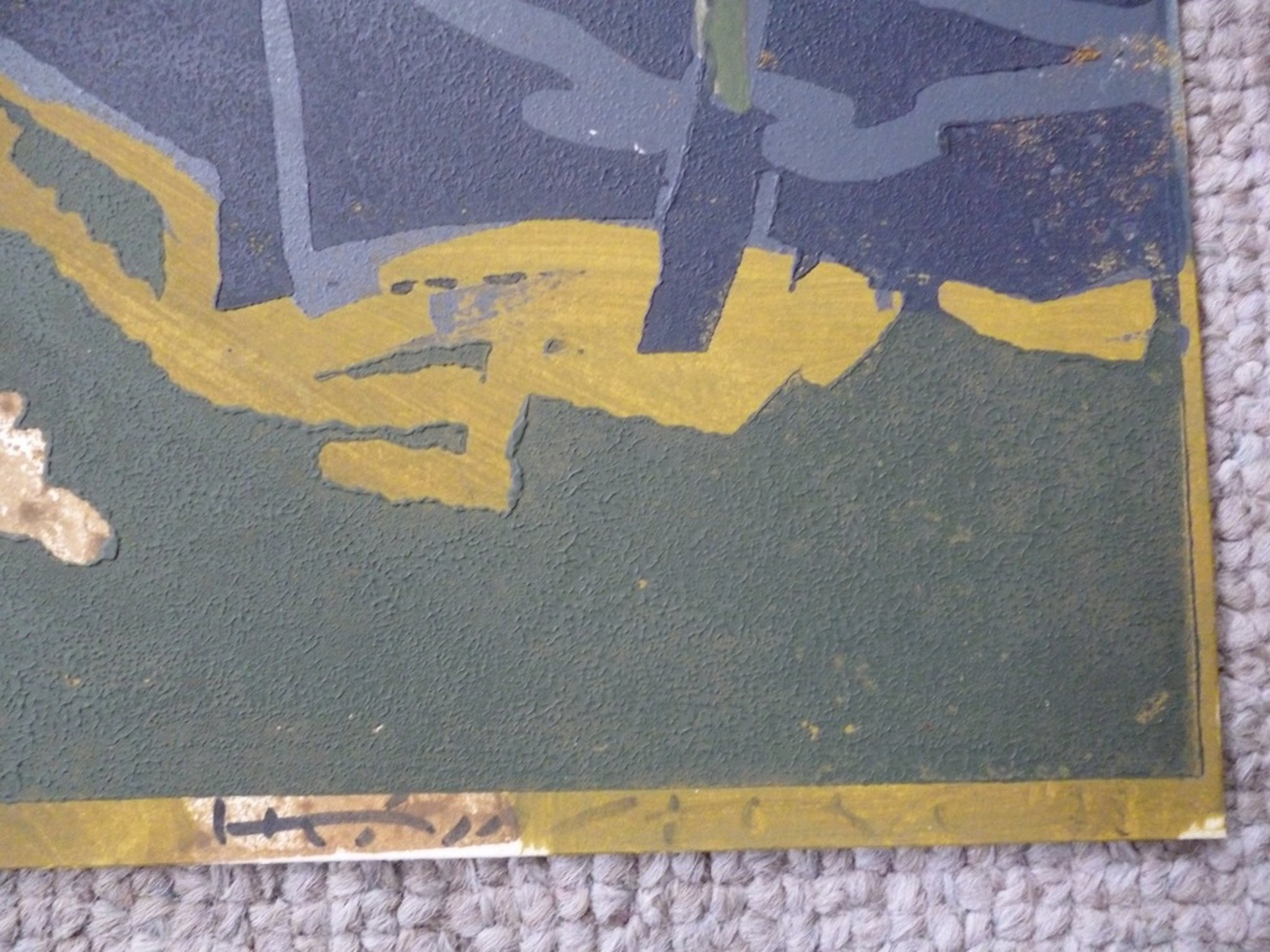 Kleurenlinosnede uit 1978, potlood gesigneerd en gedateerd rechtsonder. Genummerd 3/X linksonder.