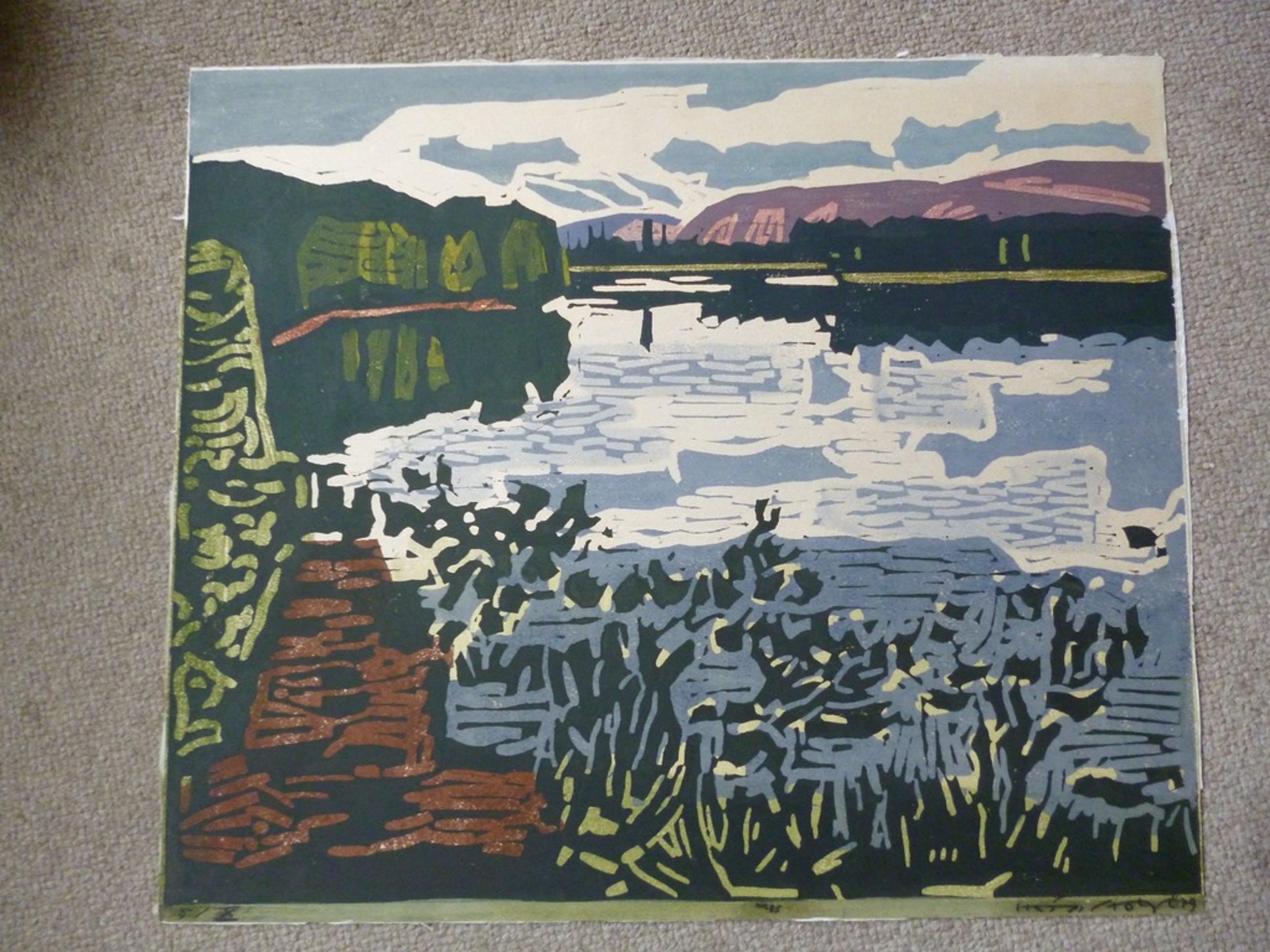 Kleurenlinosnede, potlood gesigneerd en gedateerd '79 rechtsonder. Genummerd 5/X linksonder.