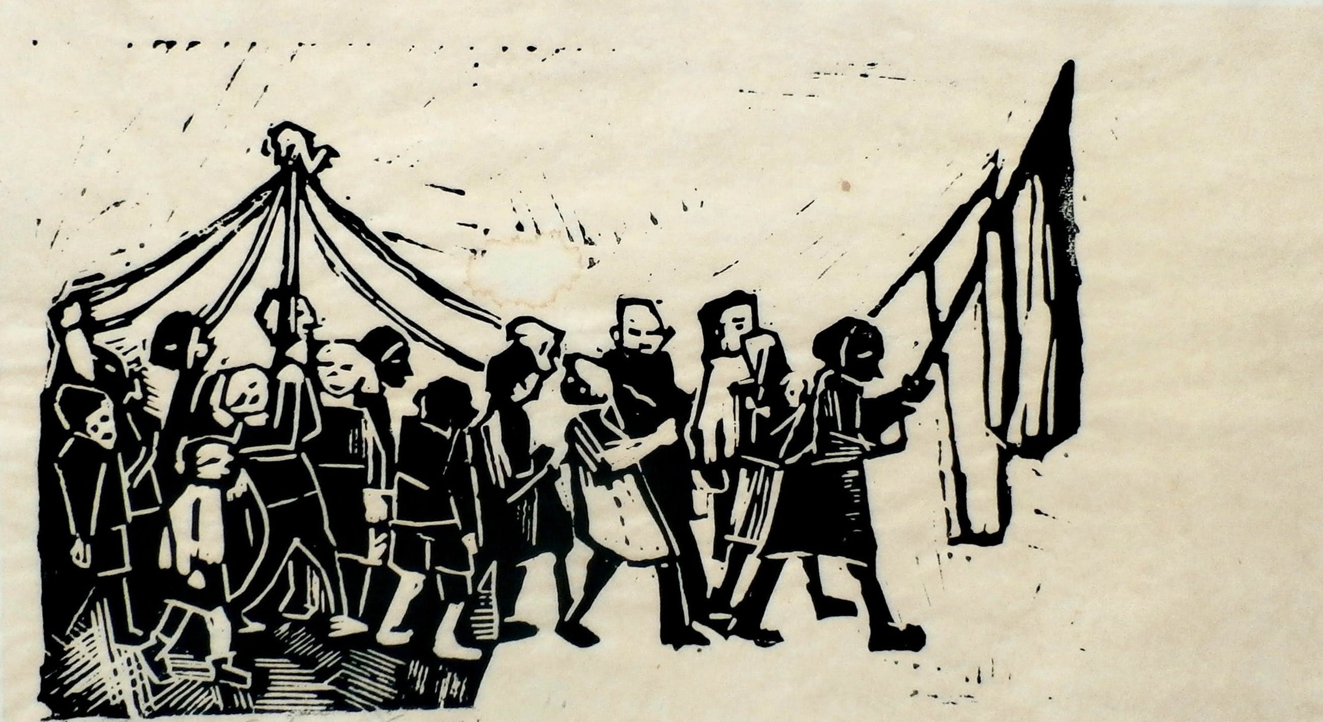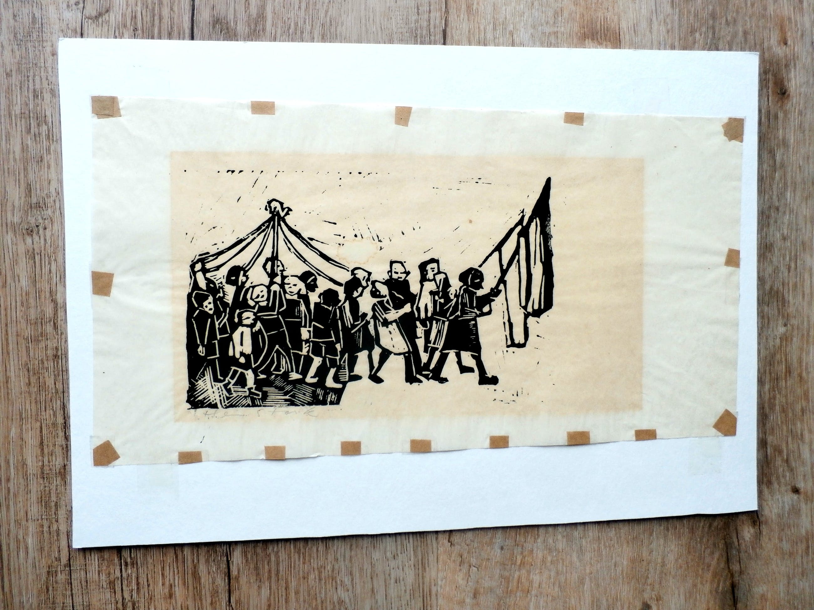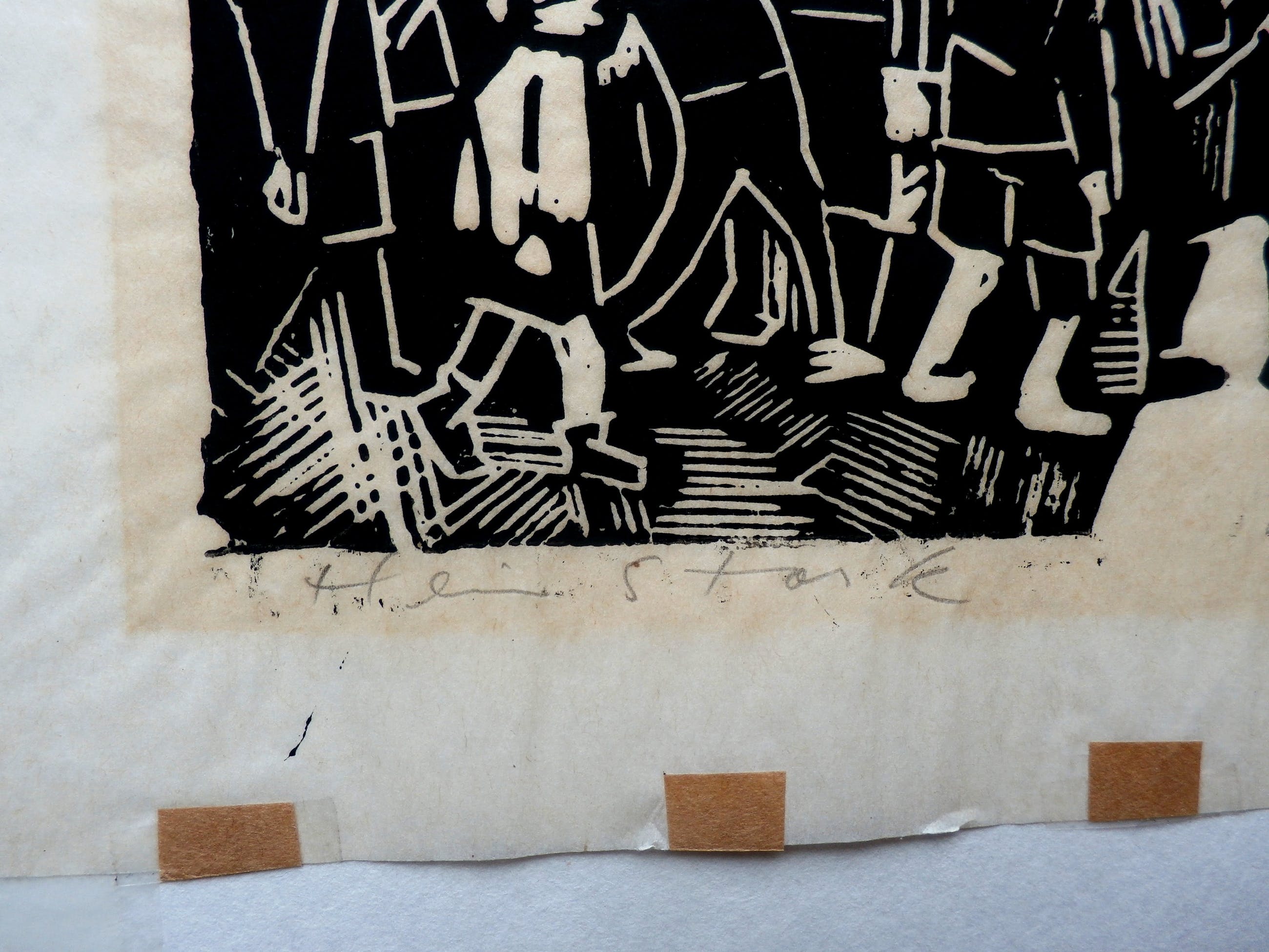 Linosnede op japans papier van Hein Stork. "Optocht". Afmetingen blad: H26 x b37 cm. Afmetingen voorstelling: h18 x b34 cm. Het werk is linksonder, met potlood, gesigneerd. De authenticiteit van het aangeboden werk wordt voor 100% gegarandeerd. Een certificaat van echtheid kan, op aanvraag, worden meegestuurd. Conditie: Het werk is in goede staat. Lichte water kring op het blad. Het werk is vergeeld binnen de randen van het oude passepartout.