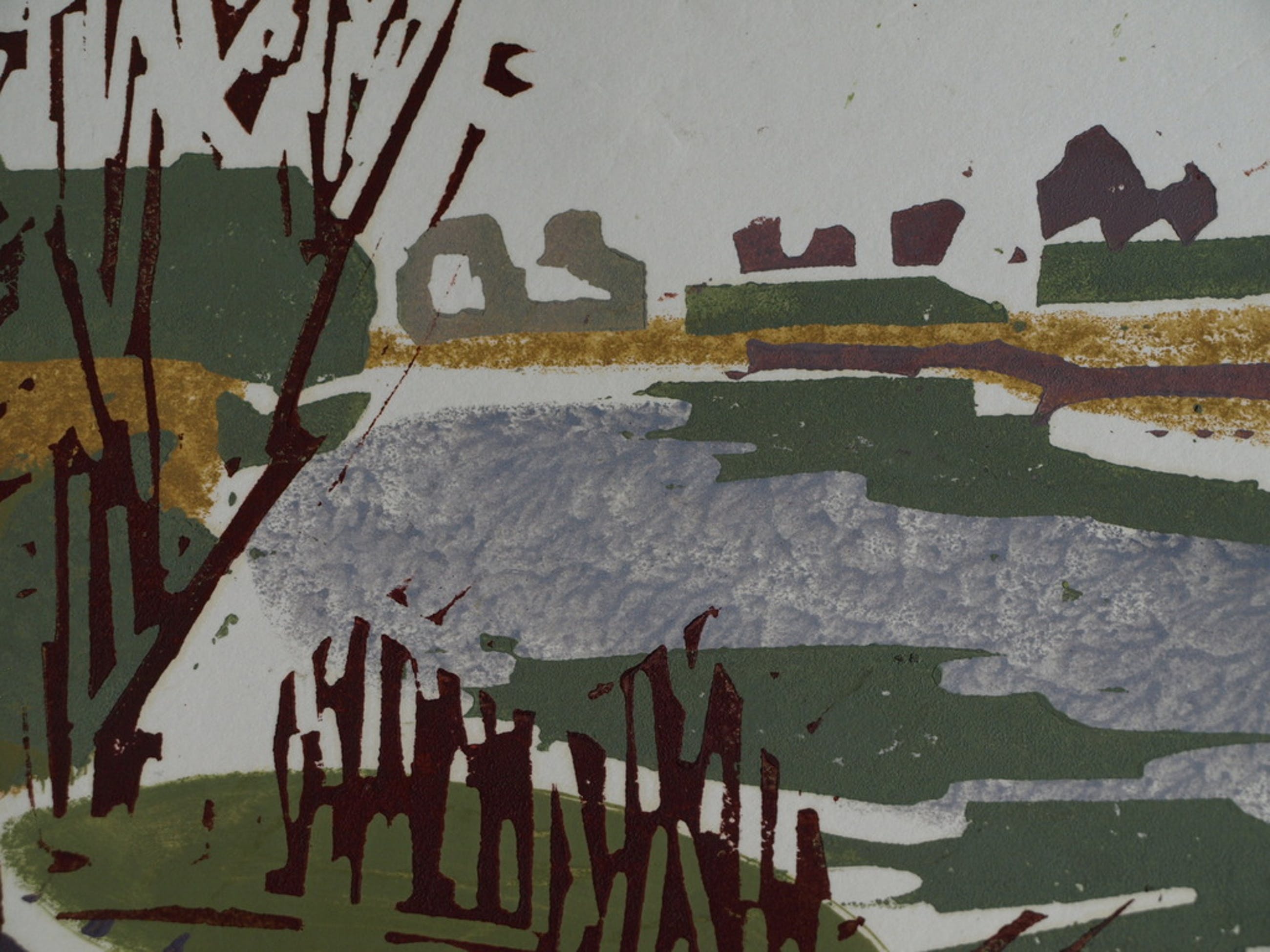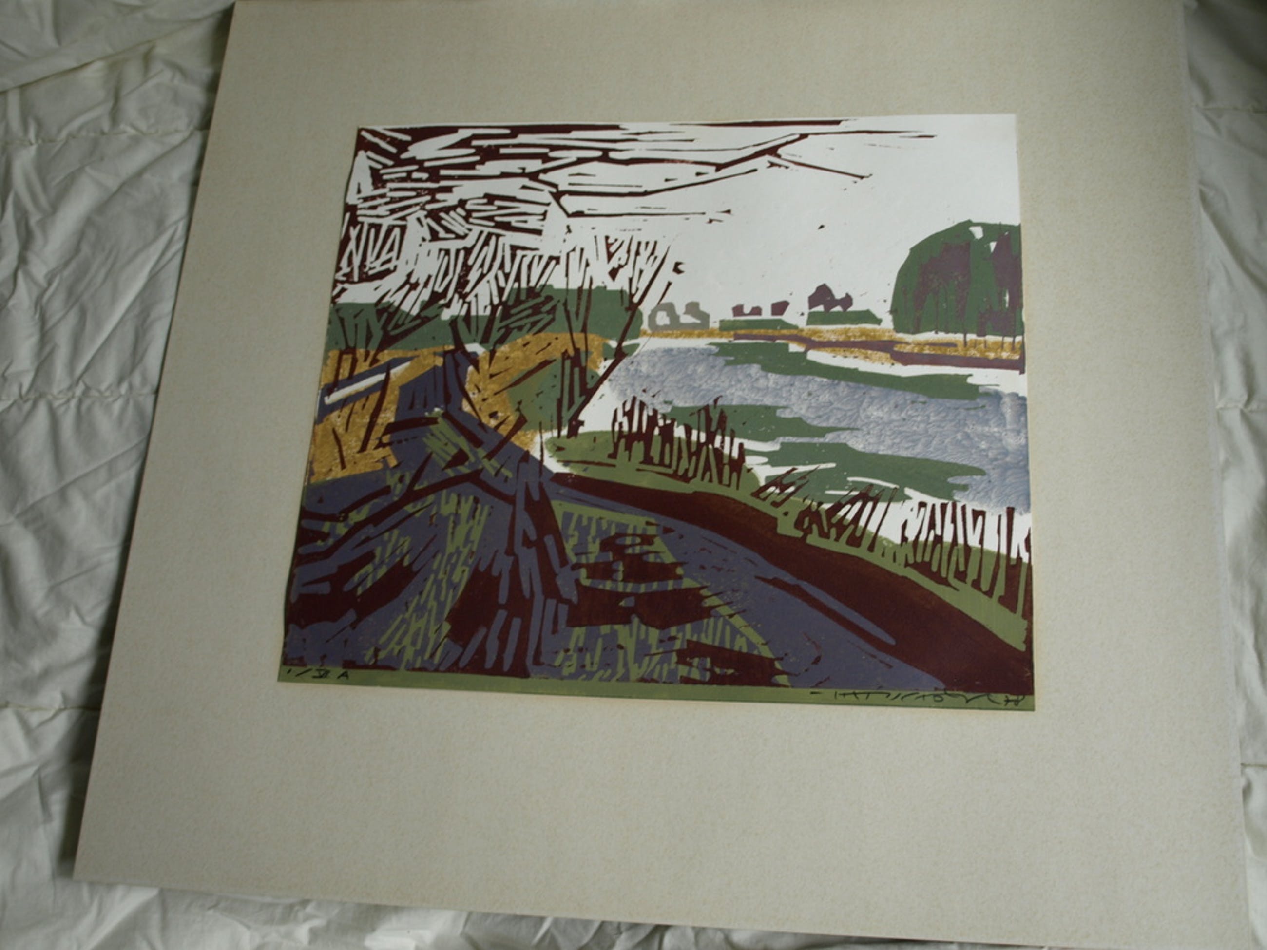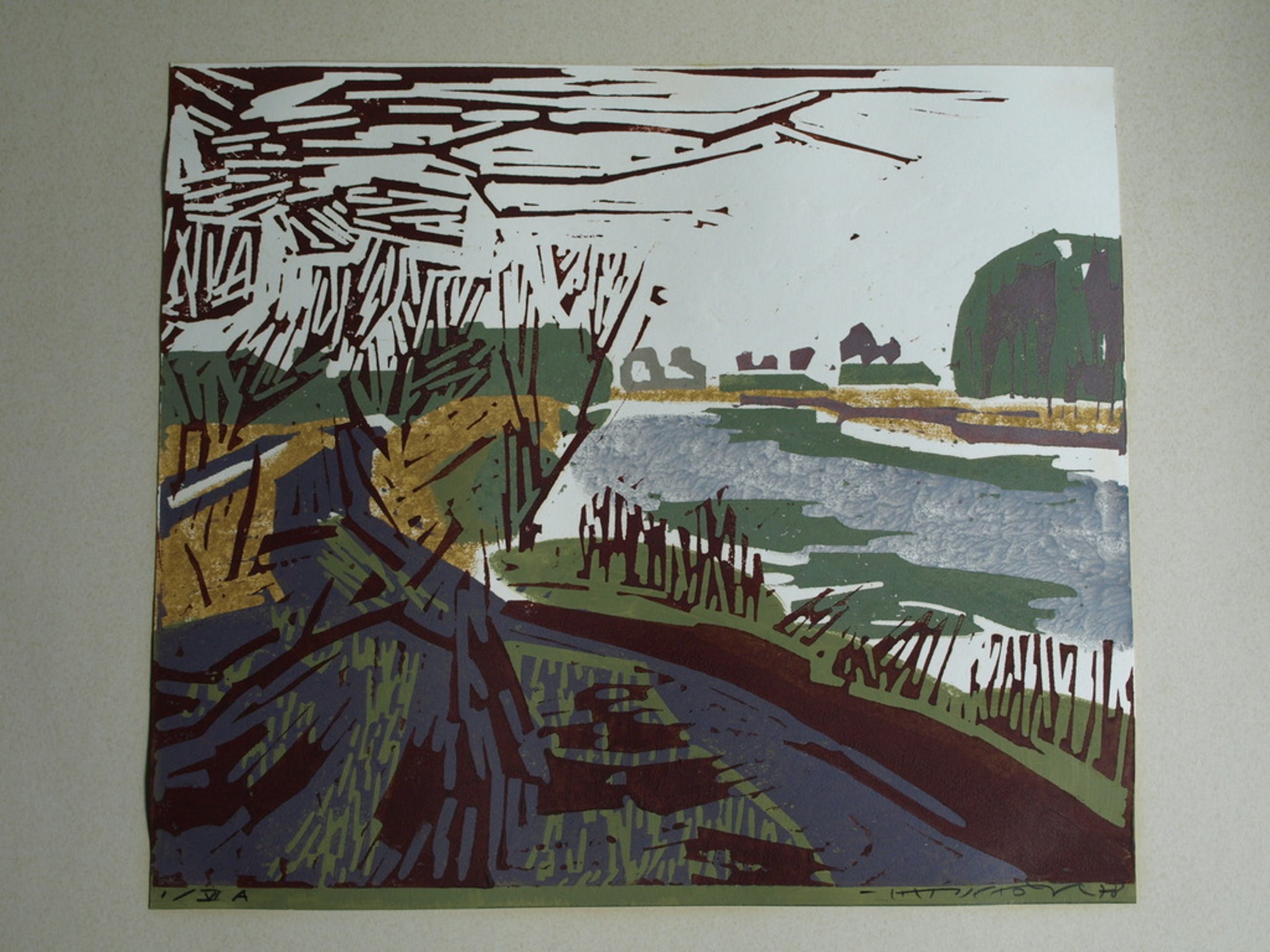 Een kleurenlinosnede van de Nederlandse kunstenaar Hein Stork uit 1978 met een voorstelling van een landschap aan de rivier de Waver.